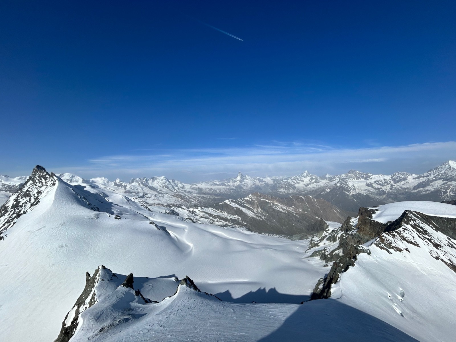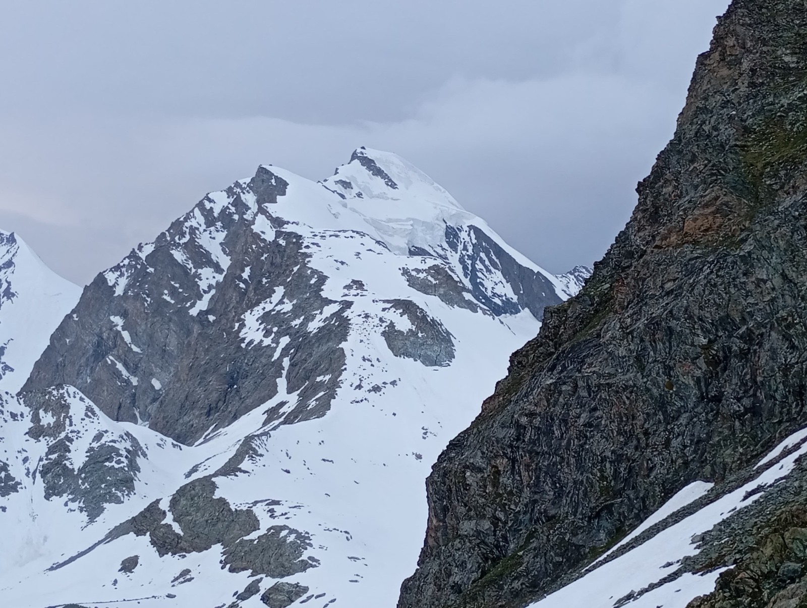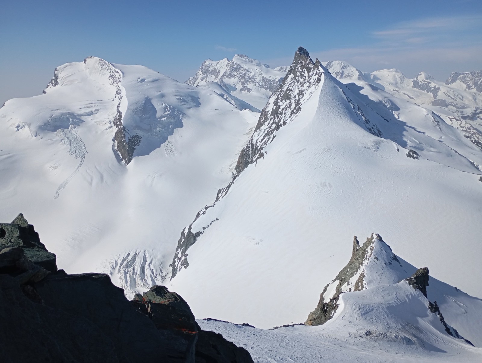 Je pensais avoir rangé les skis après le Mont Blanc mais bon, Aurelie m’a bien motivé et avait bien raison car sans les skis c’était but garanti. Une super sortie! l’Allalinhorn n’étais pas à la base un sommet qui me faisait rêver au vu de la sur-fréquentation de cette montagne dû à la facilité de la VN et de son accès + qu’aisé via les remontées. Hors, aujourd’hui, nous étions 3 au total au sommet et personne dans la VN ! Donc la je dis oui. L’arête E est magnifique, et le panorama également. J’ai eu une grosse pensée et un moment de tristesse en regardant l’arête où est décédé mon héro… Patrick Berhault. Pour les condis: Presque aucun regel, à ski ça allait mais l’arête en crampon… j’en ai bien chié à tracer certaines parties pour parler franchement. Le ressaut était en mixte avec des placages douteux et en plus quand tu perds ton piolet ça ajoute du piquant. (Si quelqu’un y passe, il doit traîner quelque part sur le glacier en bas (gully orange)). La descente du glacier a été laborieuse et louvoiement entre d’énormes crevasses dont certains passages étaient infranchissable… puis vint la galère: arrivé sur le domaine skiable nous nous pensions sortis d’affaire: aucunement. Des repeautages, des crevasse énormes, des pelleteuses qui massacrent le glacier en faveur de neige consommable pour le domaine skiable… on a quand même pu éviter les orages ! Merci à Aurelie pour la bonne humeur et cette belle course !