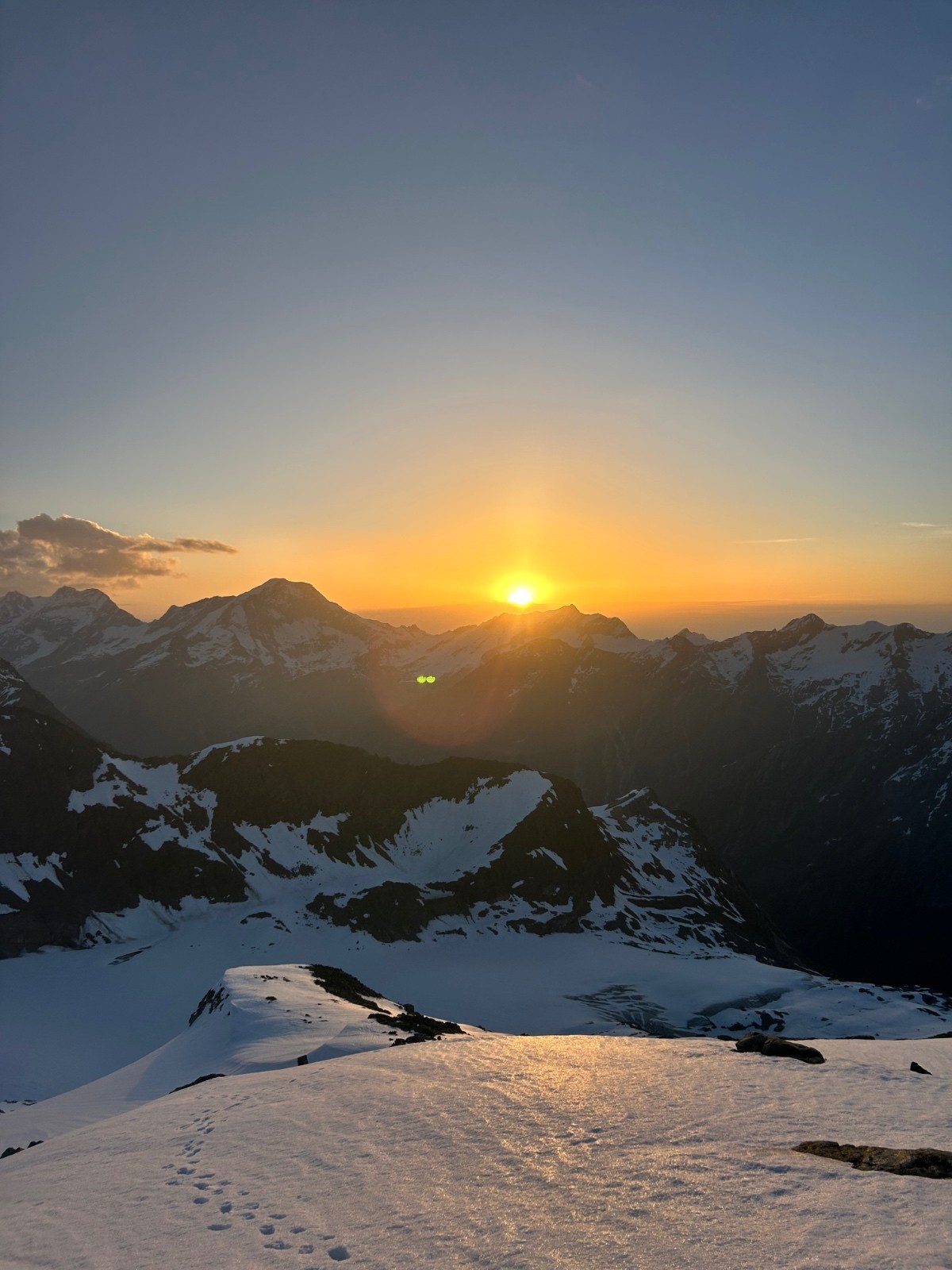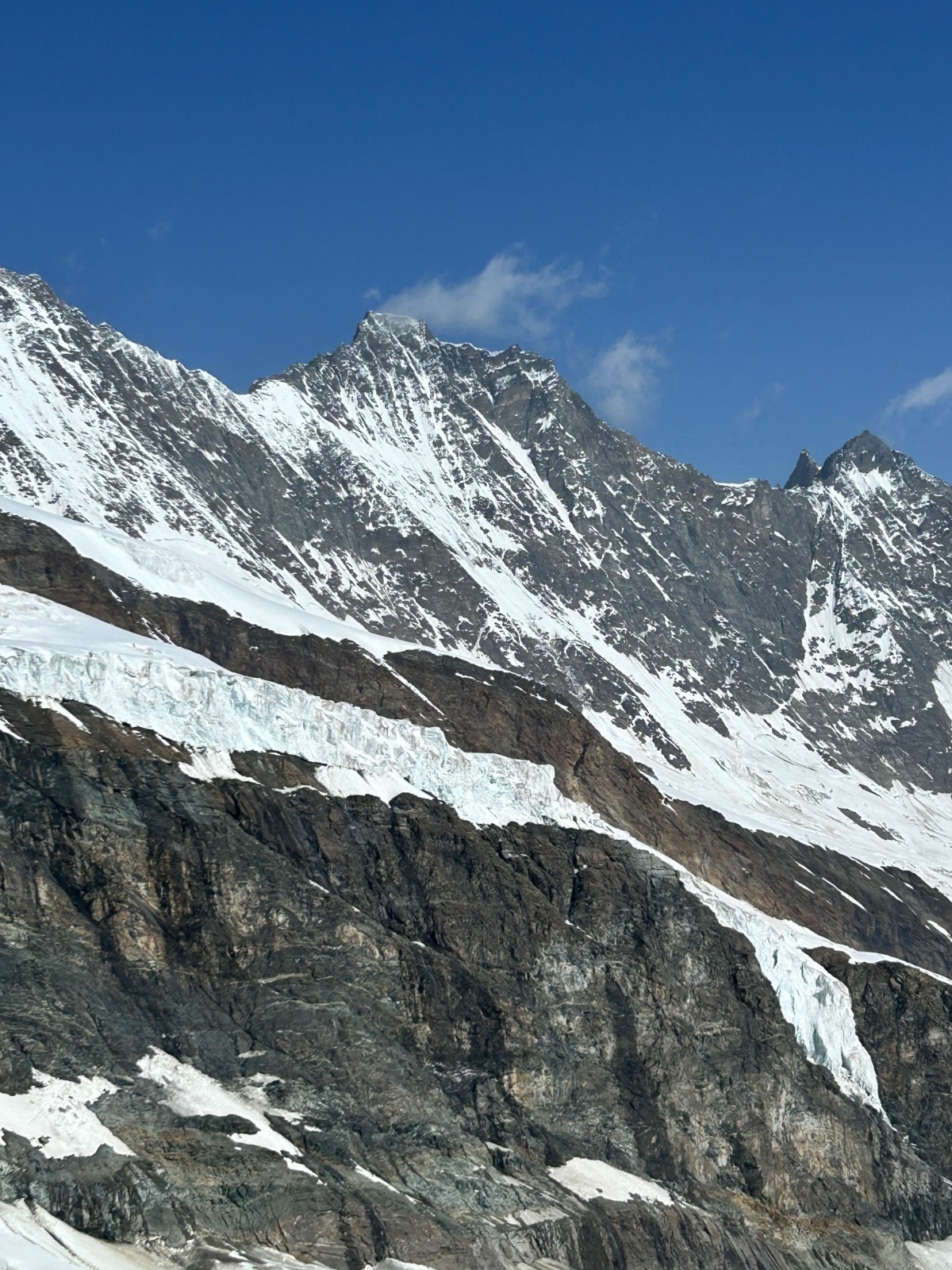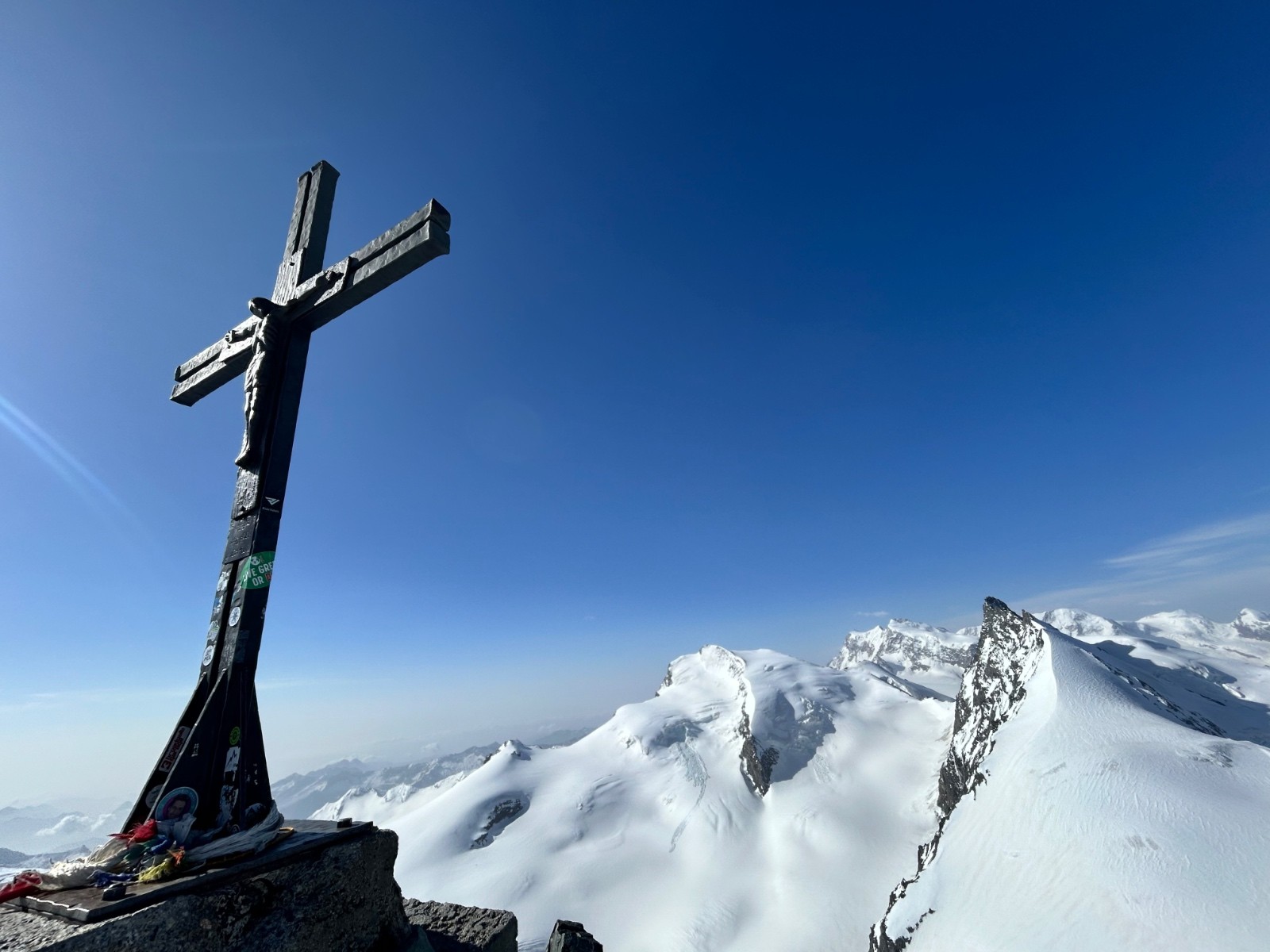 Je pensais avoir rangé les skis après le Mont Blanc mais bon, Aurelie m’a bien motivé et avait bien raison car sans les skis c’était but garanti. Une super sortie! l’Allalinhorn n’étais pas à la base un sommet qui me faisait rêver au vu de la sur-fréquentation de cette montagne dû à la facilité de la VN et de son accès + qu’aisé via les remontées. Hors, aujourd’hui, nous étions 3 au total au sommet et personne dans la VN ! Donc la je dis oui. L’arête E est magnifique, et le panorama également. J’ai eu une grosse pensée et un moment de tristesse en regardant l’arête où est décédé mon héro… Patrick Berhault. Pour les condis: Presque aucun regel, à ski ça allait mais l’arête en crampon… j’en ai bien chié à tracer certaines parties pour parler franchement. Le ressaut était en mixte avec des placages douteux et en plus quand tu perds ton piolet ça ajoute du piquant. (Si quelqu’un y passe, il doit traîner quelque part sur le glacier en bas (gully orange)). La descente du glacier a été laborieuse et louvoiement entre d’énormes crevasses dont certains passages étaient infranchissable… puis vint la galère: arrivé sur le domaine skiable nous nous pensions sortis d’affaire: aucunement. Des repeautages, des crevasse énormes, des pelleteuses qui massacrent le glacier en faveur de neige consommable pour le domaine skiable… on a quand même pu éviter les orages ! Merci à Aurelie pour la bonne humeur et cette belle course !