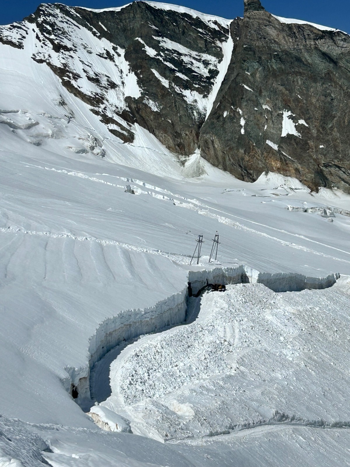 Glacier complexe à naviguer et domaine skiable complètement défiguré par les pelleteuses qui creusent à même le glacier pour enneiger les pistes et boucher les crevasses des pistes. Spectacle triste à voir et surtout bien bien complexe et galère à naviguer (des gouffres de dizaines de mètres et des crevasses et zones crevassées énormes)