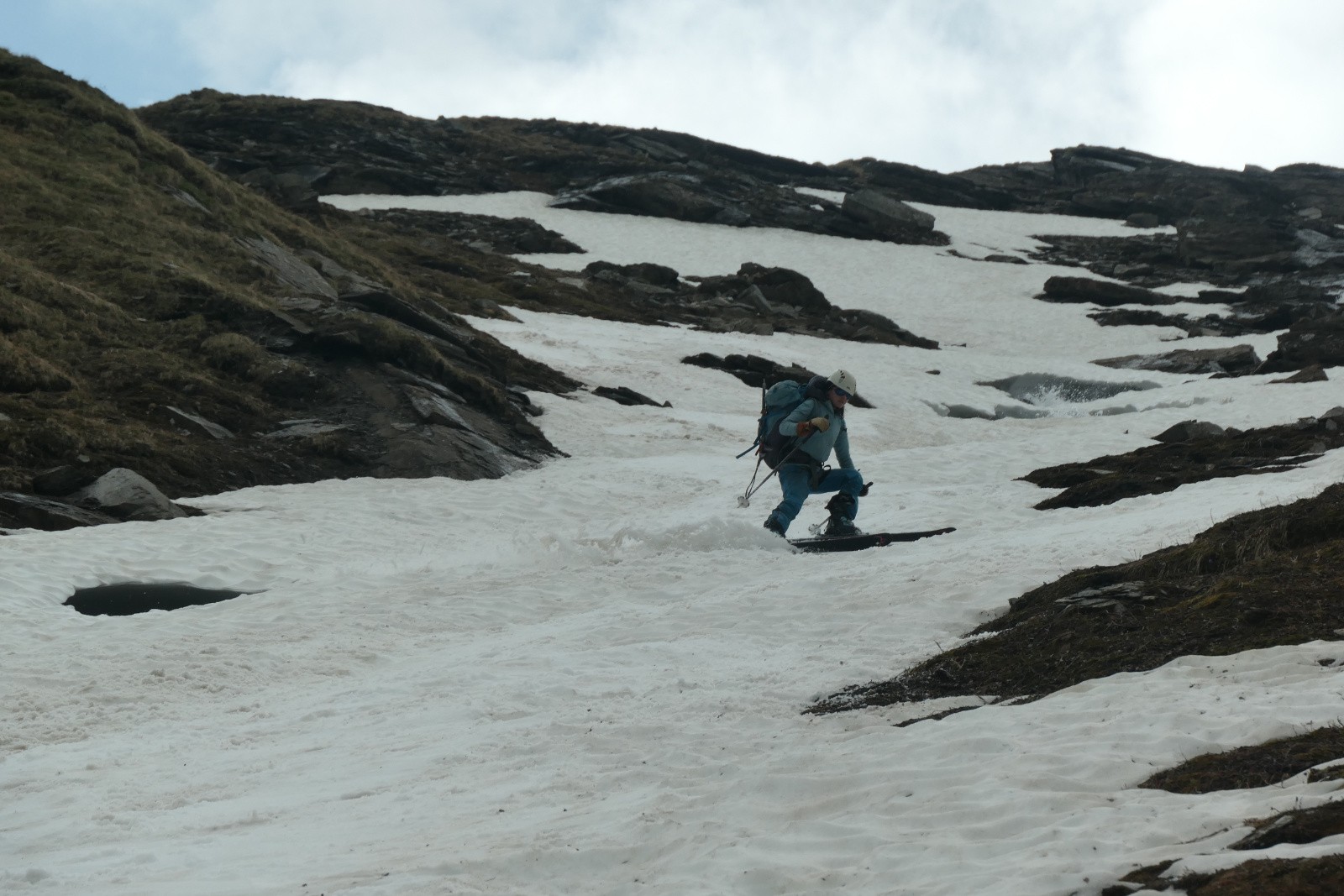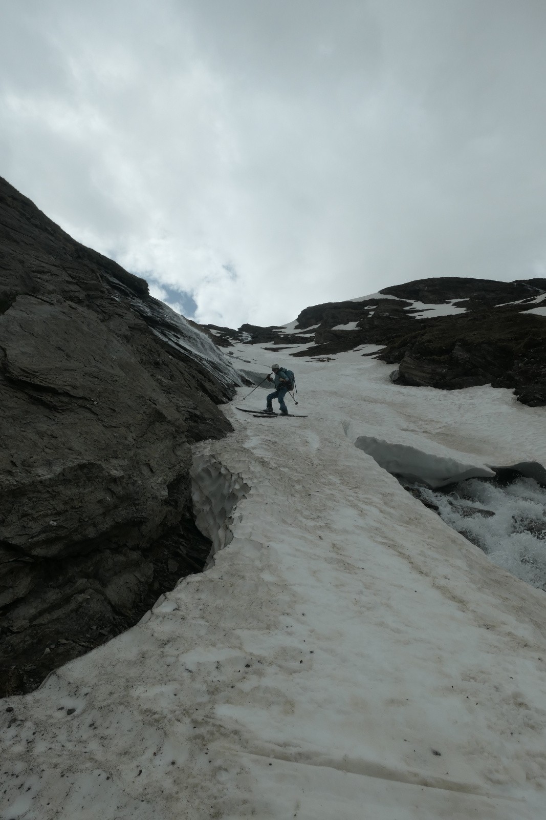 Sommet peu avant 10h après avoir subi 3/4 averses, on s'accorde pour ne faire qu'une seule descente; La neige est encore assez lisse mais collante; Plus bas, on suit le ruisseau du Gros Caval avec un enneigement à peu près continu. Nous aurons quand même serré les fesses et espéré plus d'une fois que les ponts de neiges ne cèdent pas sur notre passage, vu le débit de ce dernier. On atteint ainsi l'altitude 2300m pour le déchaussage; Courte remontée pour aller chercher le névé qui enjambe l'Isère puis retour à la voiture devant un refuge de Prariond plein à craquer !