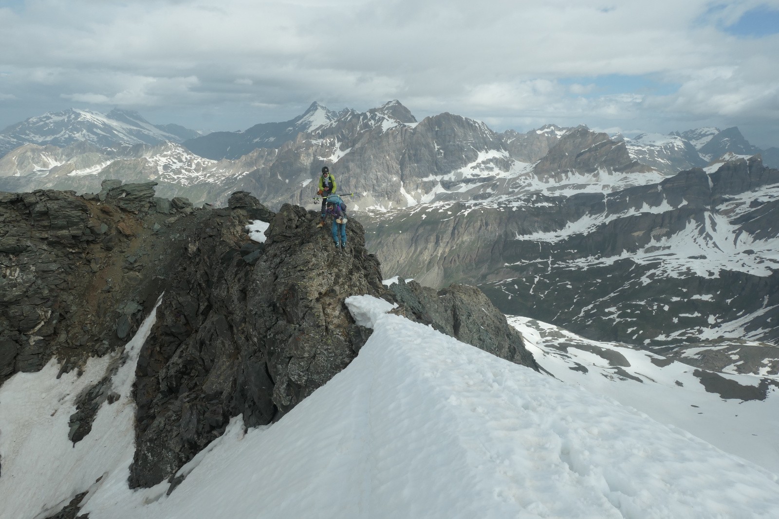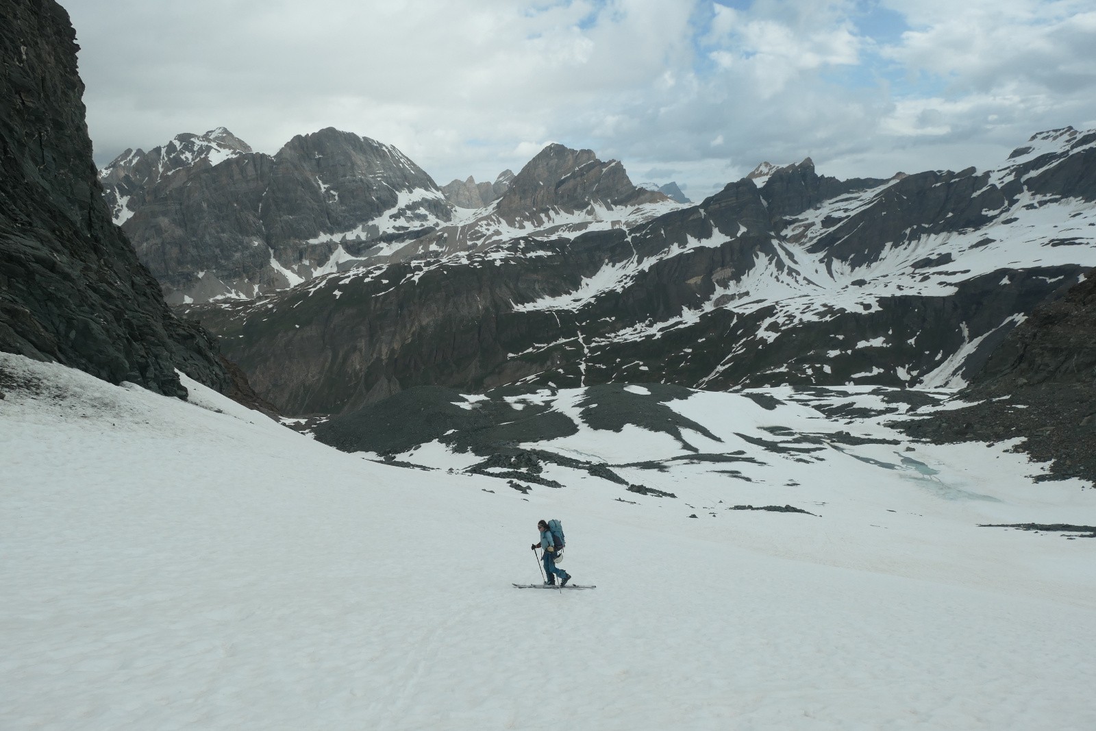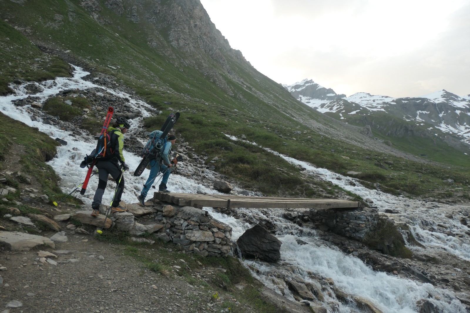 Marc est toujours de la partie. Après avoir longtemps hésité, il a choisi de nous accompagner pour la clôture de notre saison 2024/2025. Il fait chaud et le plateau de Prariond est dorénavant totalement sec. La principale difficulté consistera à enjamber l'Isère. Avec ces chaleurs, le torrent est gros dès le lever du jour. Heureusement, un peu au-dessus de nous, un névé traverse encore le torrent. Pourvu qu'il tienne la journée celui-là ! la côte 2300m est dépassée puis rapidement 2400, 2500 puis 2600m, toujours aucun enneigement en continu... En prime, une averse plutôt costaude nous rince intégralement alors que nous n'avons pas encore chaussé ! Le moral des troupes est en berne. Finalement un névé un peu plus continu se dessine un peu en dessous de 2700m, nous chaussons; Triste spectacle que ces sommets entre 3200 et 3700m d'altitude avec quasiment plus de neige à peine mi-juin... On doit jouer avec le terrain pour rester sur la neige jusque vers 2900m puis enfin l'enneigement devient plus conséquent. Un bel arc-en-ciel nous émerveille mais il est également annonciateur de la prochaine averse.