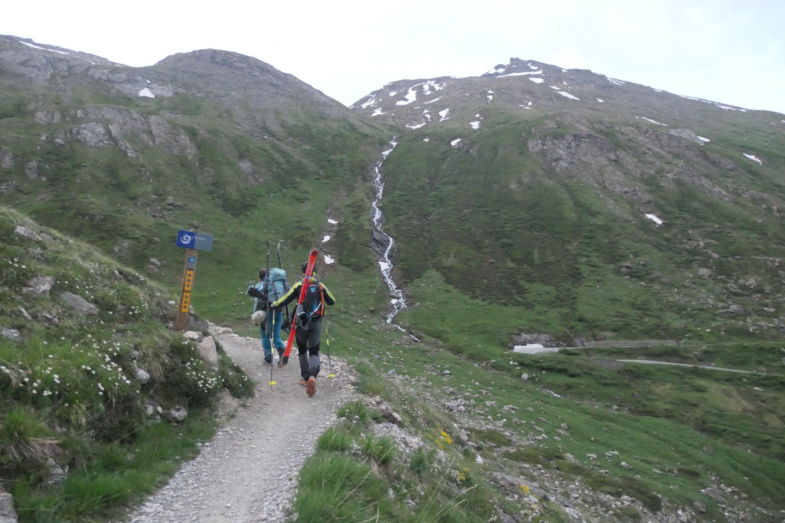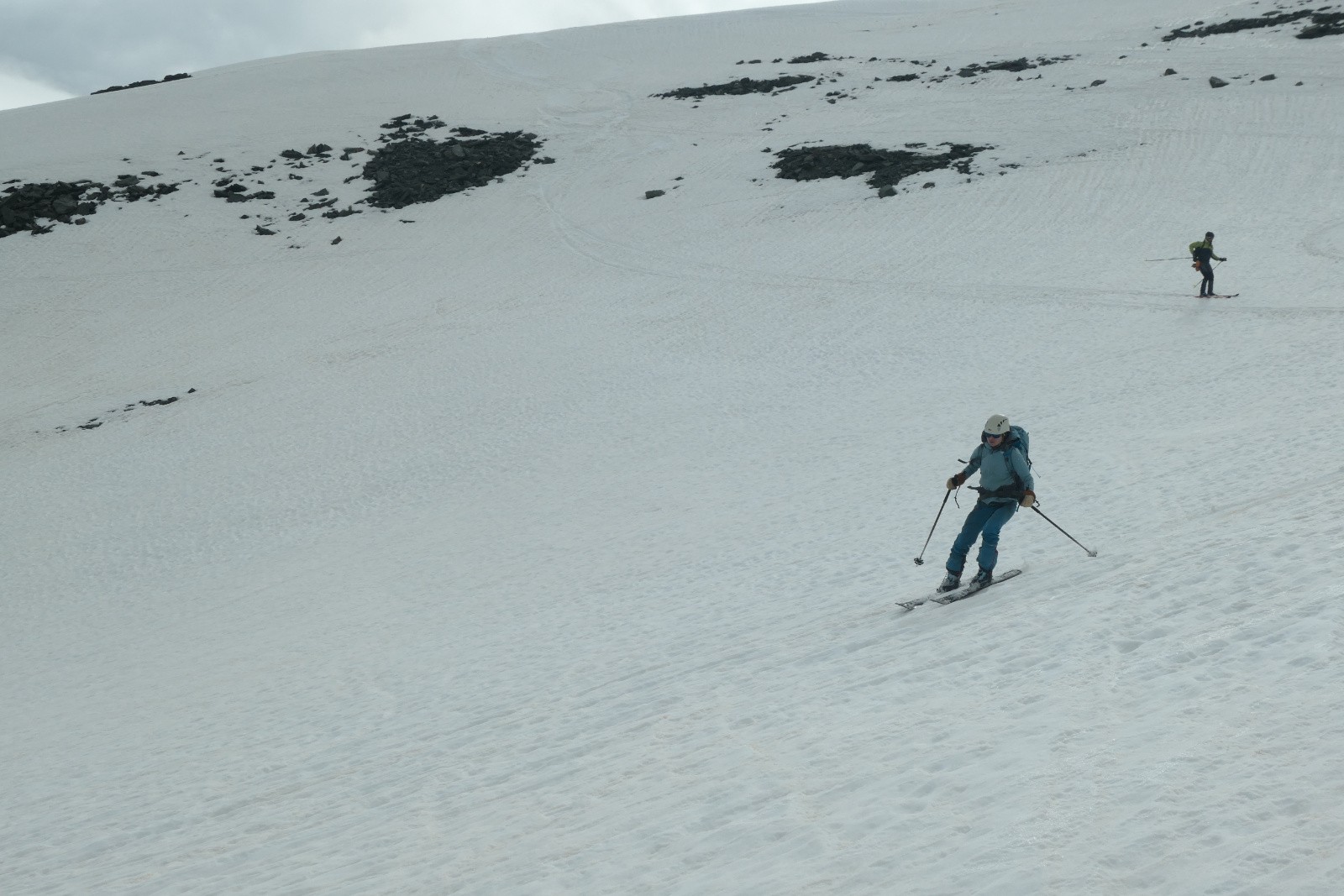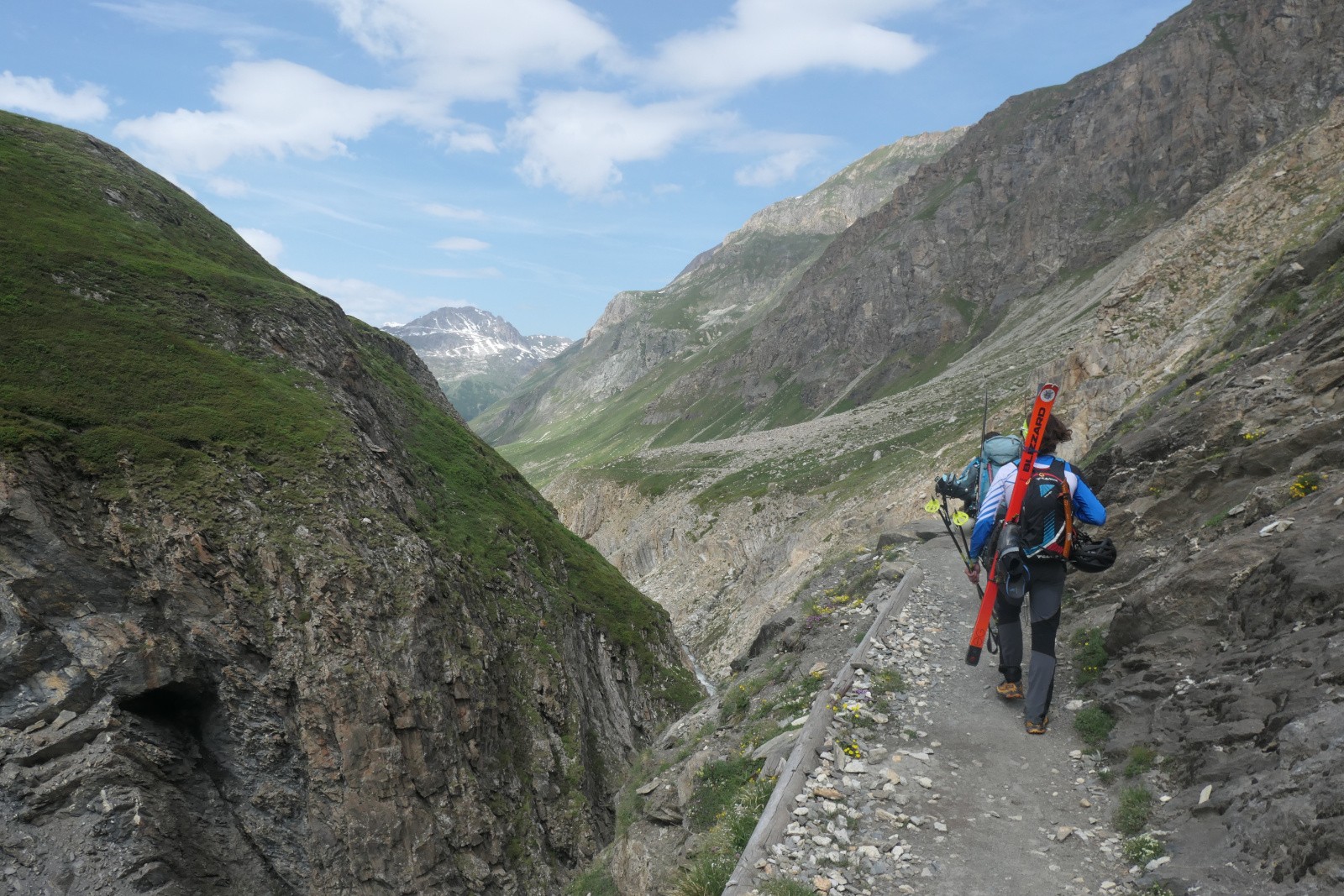 Marc est toujours de la partie. Après avoir longtemps hésité, il a choisi de nous accompagner pour la clôture de notre saison 2024/2025. Il fait chaud et le plateau de Prariond est dorénavant totalement sec. La principale difficulté consistera à enjamber l'Isère. Avec ces chaleurs, le torrent est gros dès le lever du jour. Heureusement, un peu au-dessus de nous, un névé traverse encore le torrent. Pourvu qu'il tienne la journée celui-là ! la côte 2300m est dépassée puis rapidement 2400, 2500 puis 2600m, toujours aucun enneigement en continu... En prime, une averse plutôt costaude nous rince intégralement alors que nous n'avons pas encore chaussé ! Le moral des troupes est en berne. Finalement un névé un peu plus continu se dessine un peu en dessous de 2700m, nous chaussons; Triste spectacle que ces sommets entre 3200 et 3700m d'altitude avec quasiment plus de neige à peine mi-juin... On doit jouer avec le terrain pour rester sur la neige jusque vers 2900m puis enfin l'enneigement devient plus conséquent. Un bel arc-en-ciel nous émerveille mais il est également annonciateur de la prochaine averse.