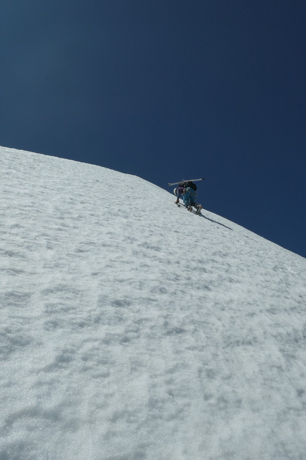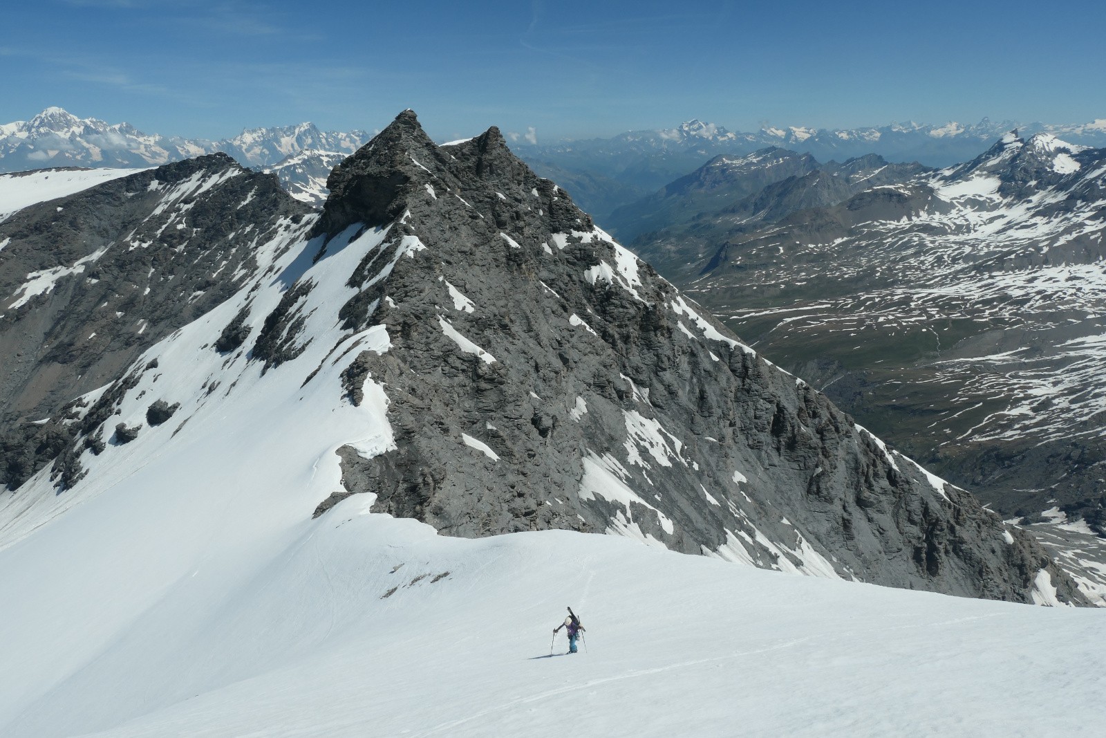 Sommet en approche, on est cette fois a peu près éveillés, il y a bien du monde sur l'arête qui est parti du Saut. Personne à ski toutefois. Final à pied, on arrive au sommet alors que le décaillage est tout frais. La face N de la Sassière est bien blanche, en E par contre ça a tout purgé et c'est bien en glace. Première descente bien sympa, on se laisse glisser tant que c'est lisse et pas collant. Histoire de rentabiliser le portage on se laisse tenter par une remontée au collu sous le sommet. Puis on profite d'une seconde descente encore top jusqu'en bas du glacier.