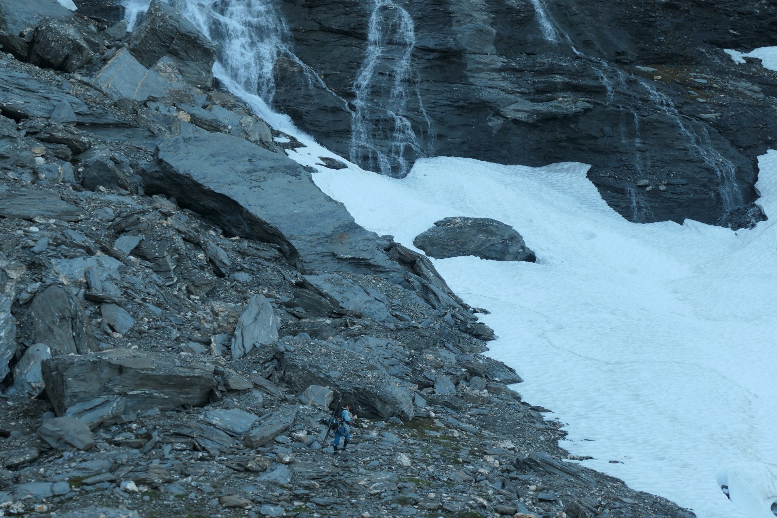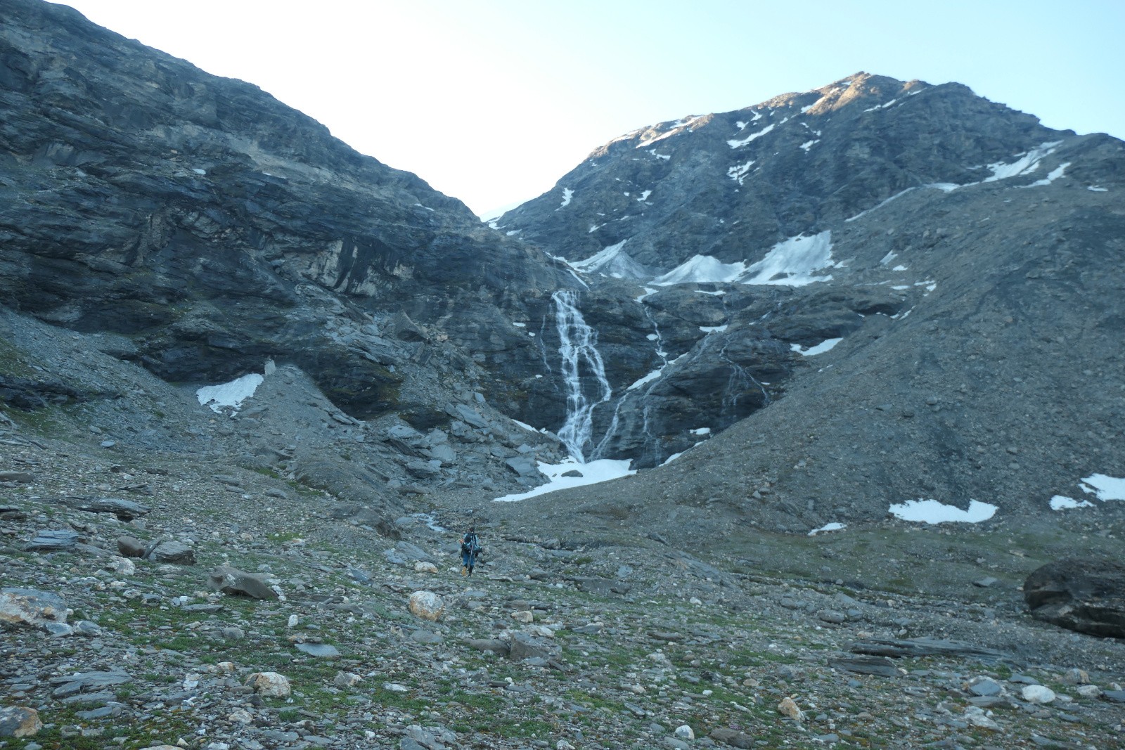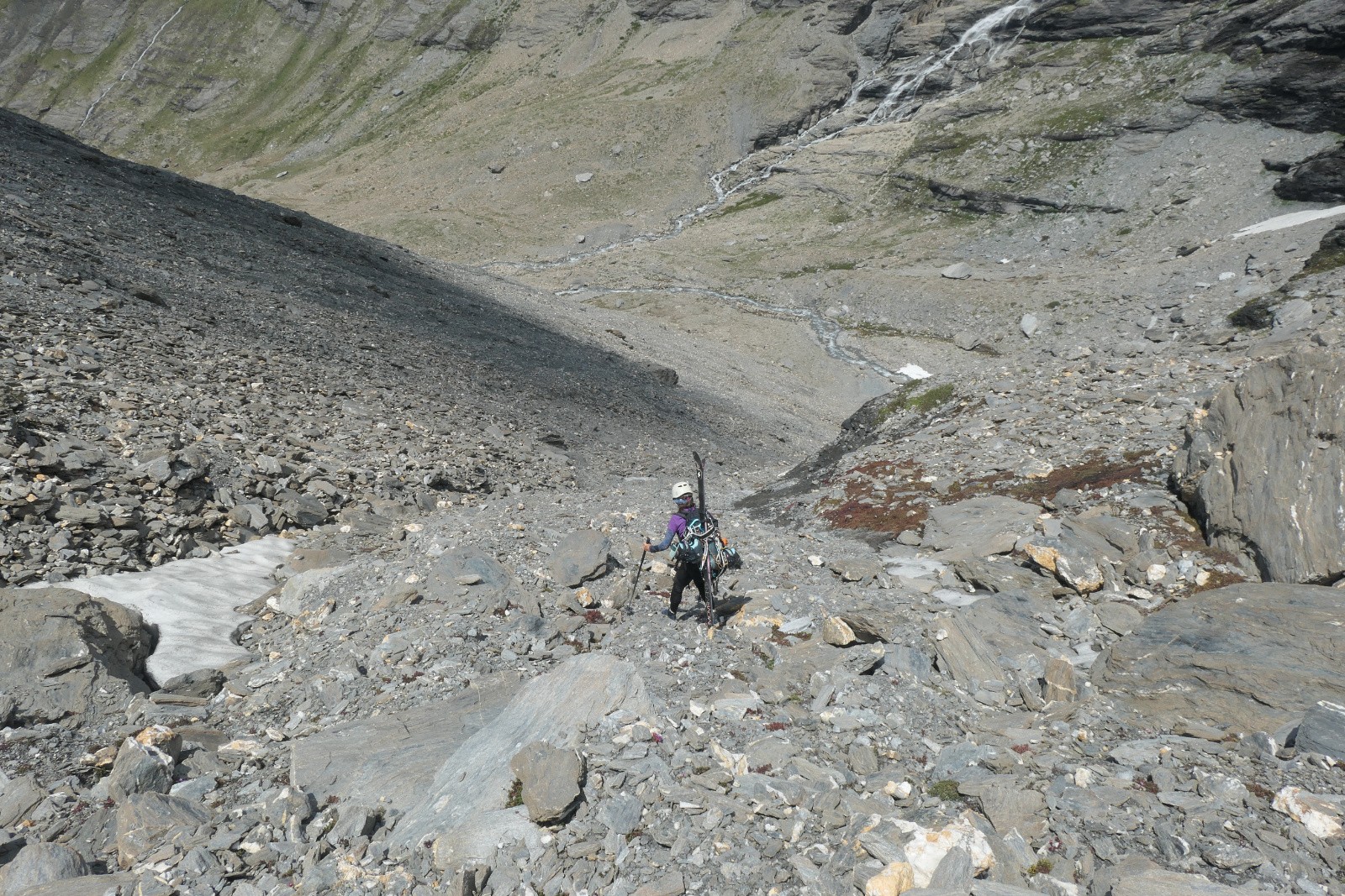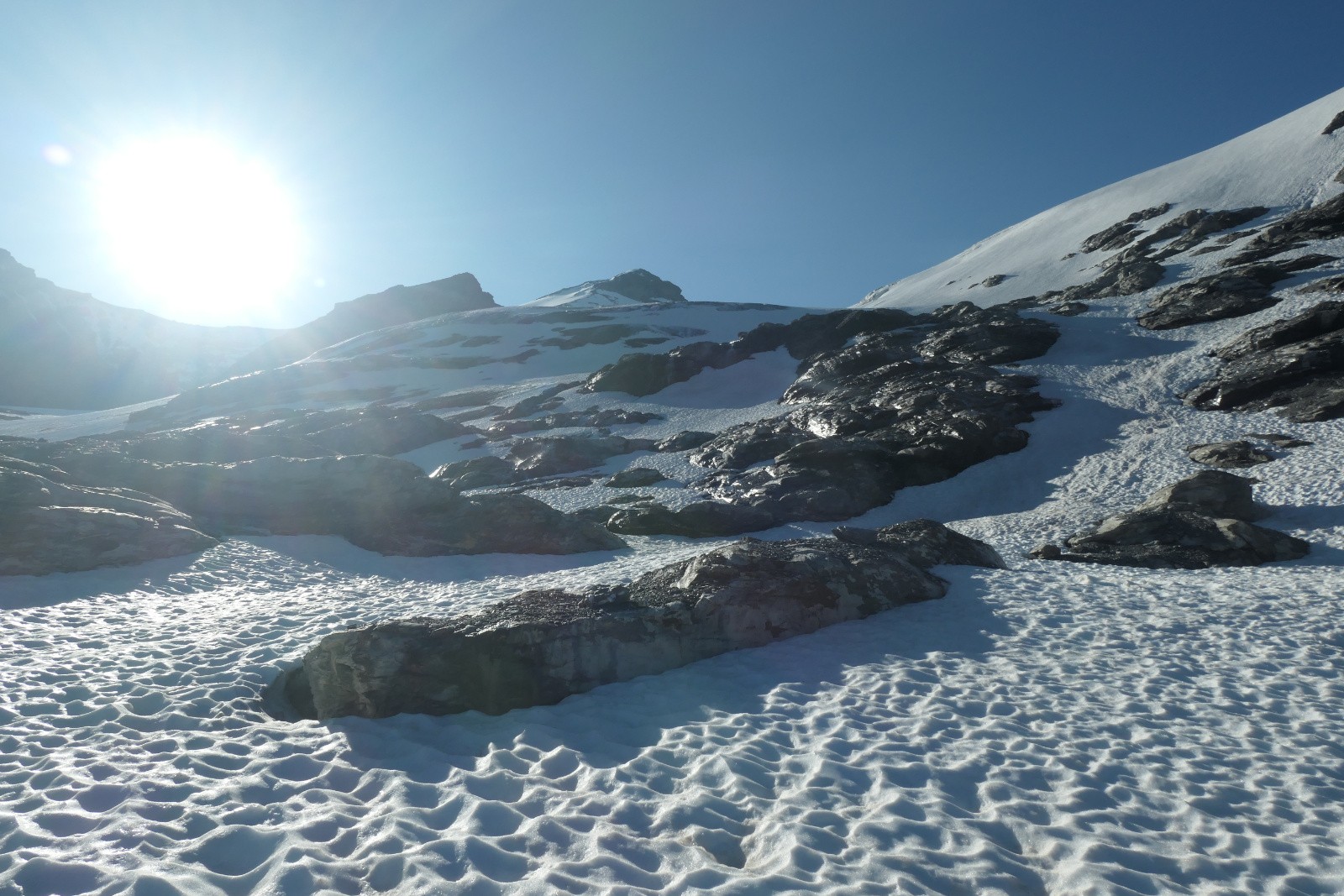 Au replat à 2600m, pas la moindre langue de neige qui descend la moraine. Zut, ça a pas l'air hyper sympa à remonter le gros pierrier là ! Encore une traversée de torrent bien humide, et on attaque le raidar. On chausse vers 2850m au soleil et on en profite pour se réchauffer les pieds qui ont pas trop apprécié la session cryogénie des torrents. On trouve rapidement un enneigement continu, enfin après 1000m de portage, et on remonte le glacier tranquillement. Vraiment très tranquillement car on s'endort littéralement sur les skis. Foutu réveil à 4h, on aurait pu le mettre à 5h, on serait arrivé à la même heure qu'au sommet. Allez savoir pourquoi on a préféré dormir sur les skis que sous la tente...