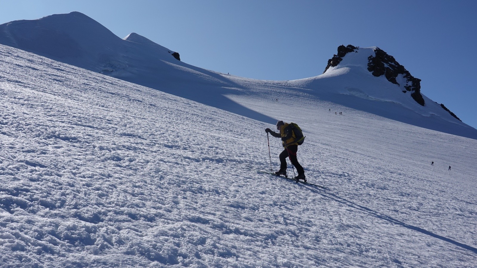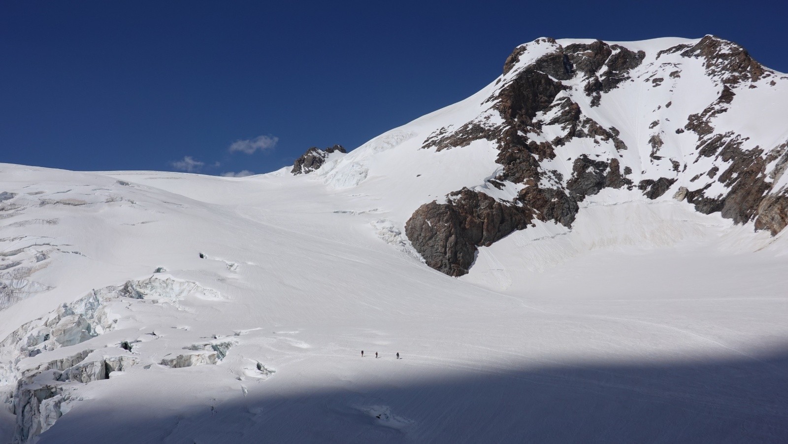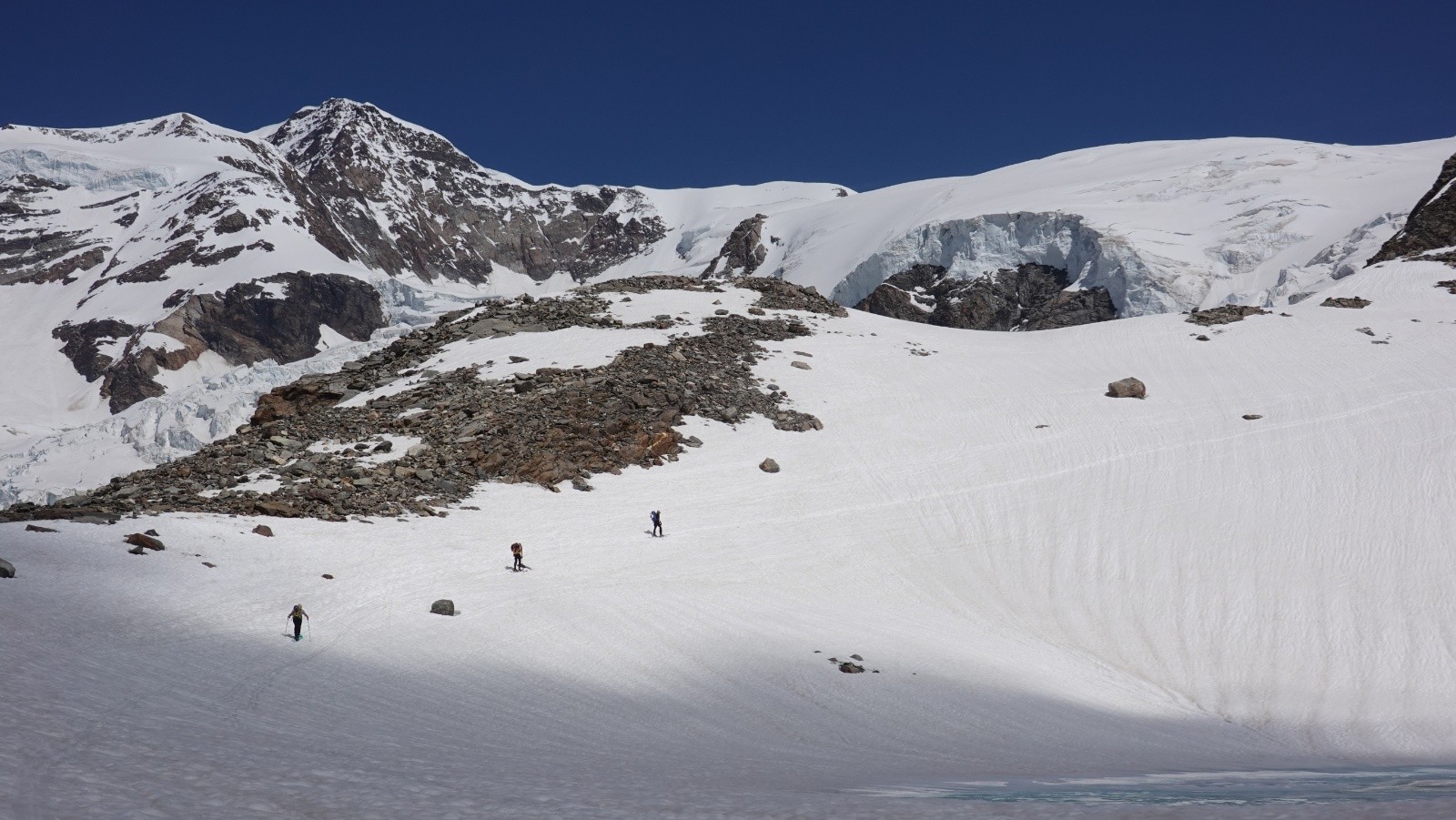Progression sous les refuges Mantova et Gnifetti sur fond de Lyskamm