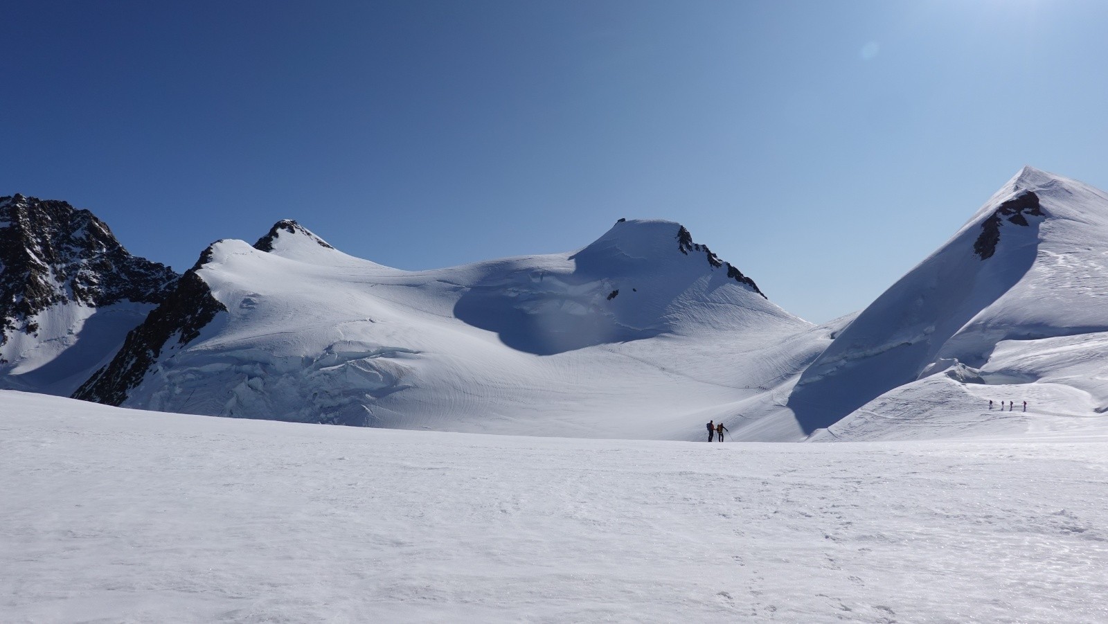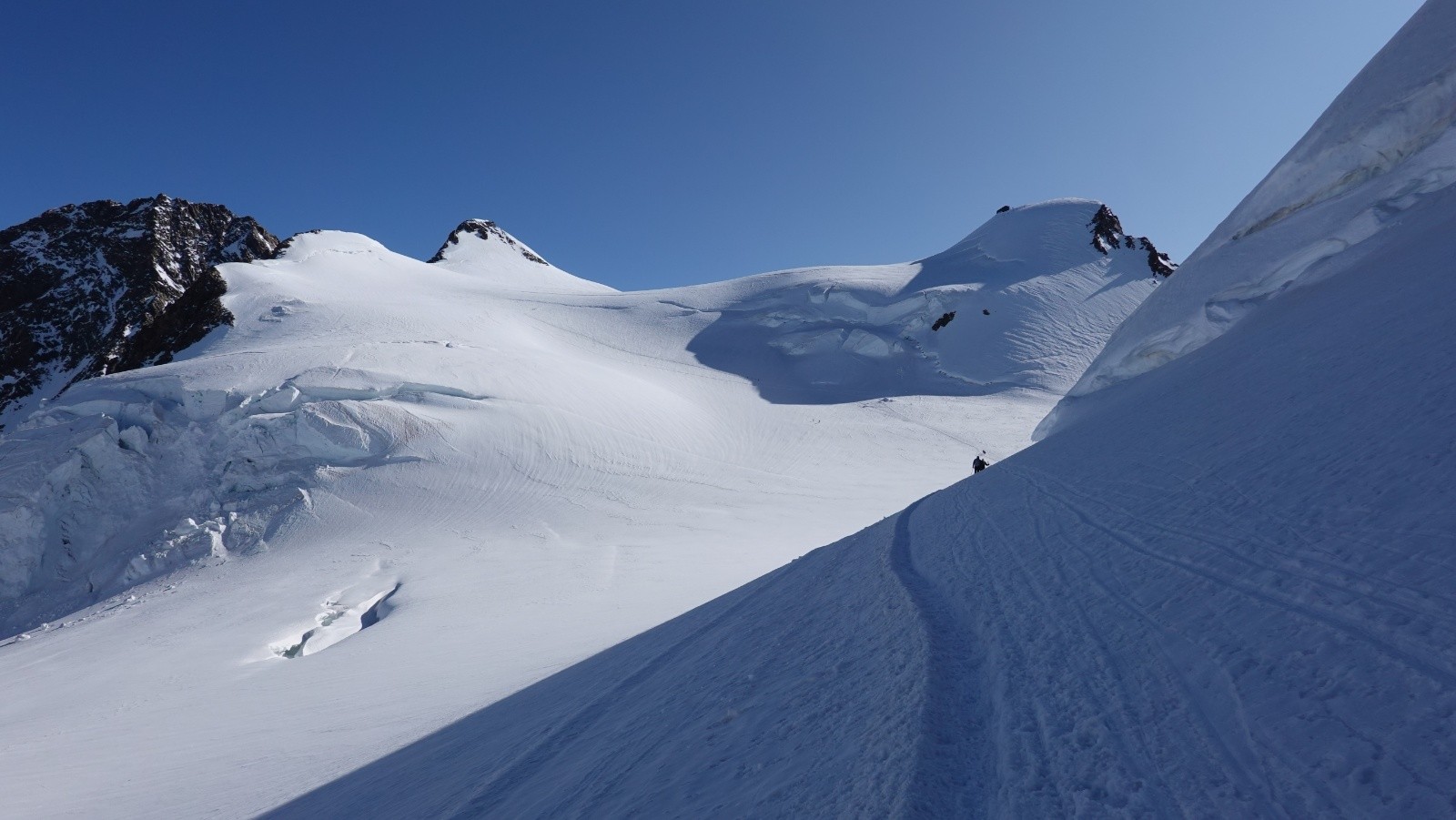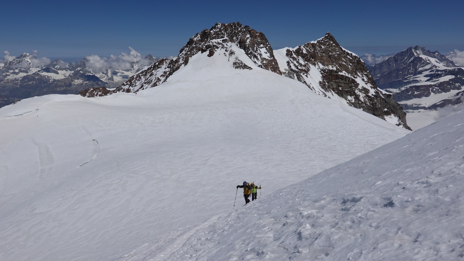 Progression sous les refuges Mantova et Gnifetti sur fond de Lyskamm