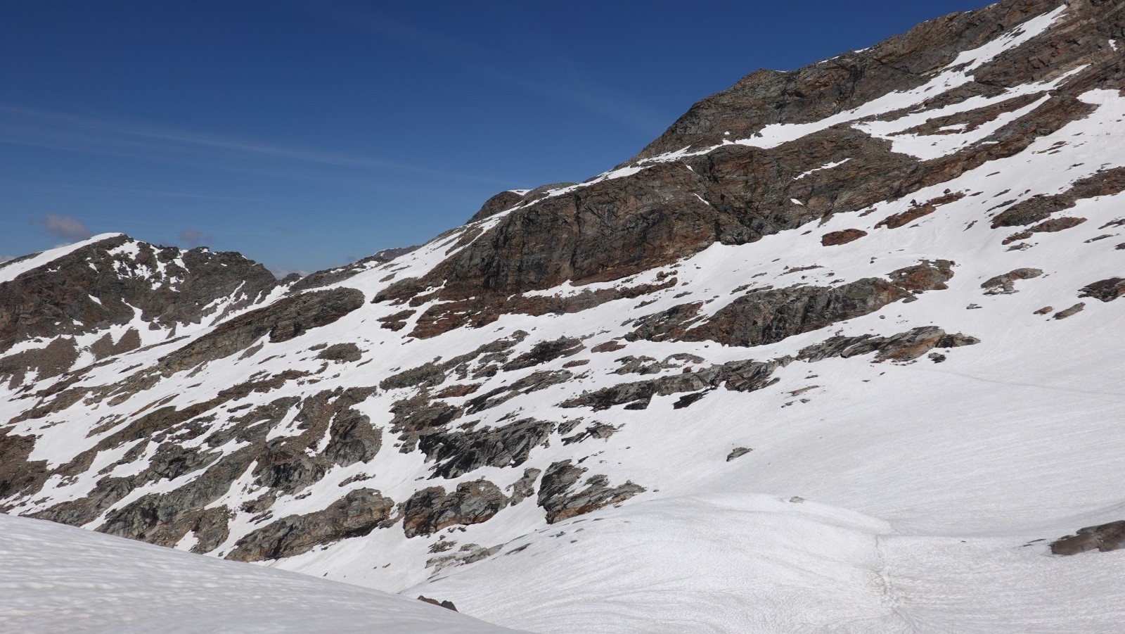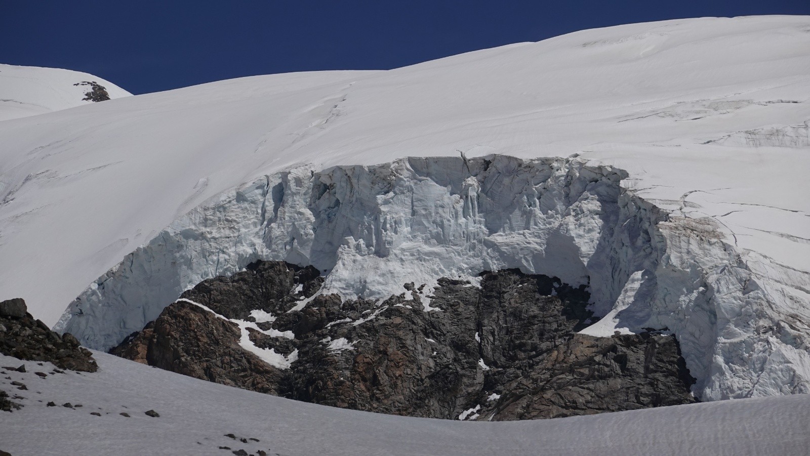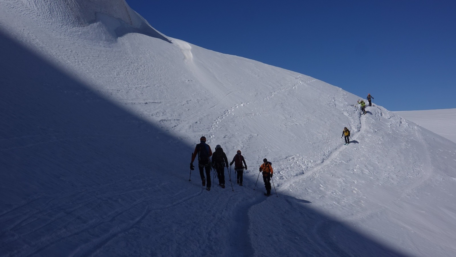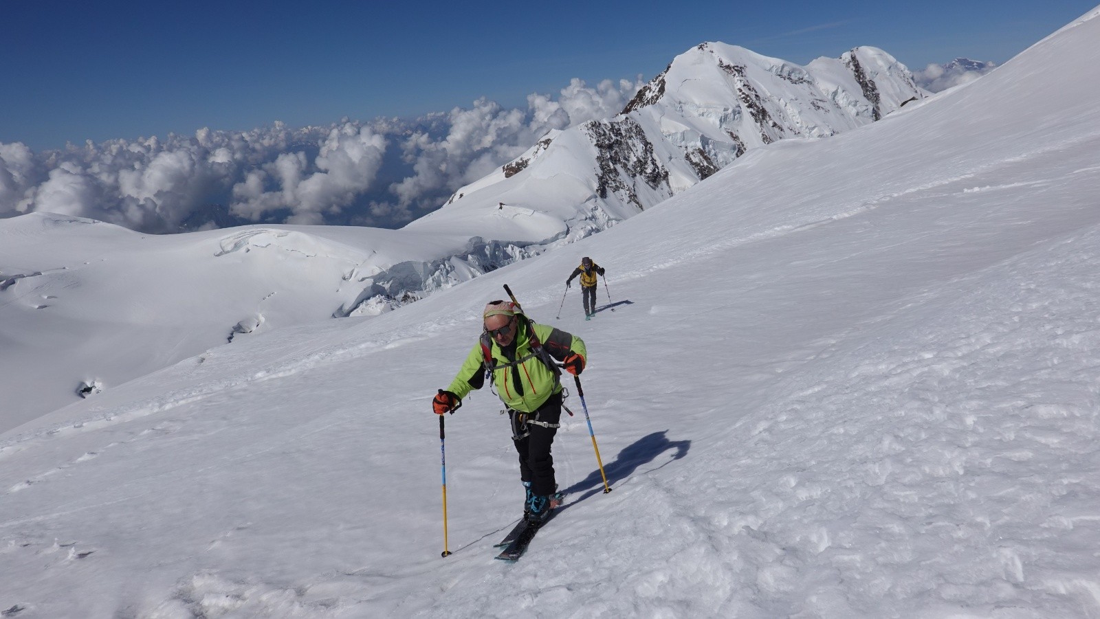 DĂ©part Ă 6h10 du refuge avec un ciel parfaitement dĂ©gagĂ© et un vent faible. Nous mettons les couteaux au moment dâattaquer les premiĂšres pentes car le regel a Ă©tĂ© relativement efficace et le glacier de Garstelet est encore bien bouchĂ©. Il y a toujours beaucoup de monde dans le secteur partant Ă l'assaut des diffĂ©rentes pointes du Monte-Rosa mais trĂšs majoritairement des alpinistes pour seulement une vingtaine de skieurs. Les zones crevassĂ©es sous le plateau de la Piramide Vincent sont bien bouchĂ©es et nous arrivons au Col du Lys Ă 8h30. Pas de vent ce qui est rare et de ce fait la tempĂ©rature est trĂšs agrĂ©able. Nous en profitions pour faire une courte pause avant de poursuivre notre ascension sans besoin des couteaux, lâaccroche Ă©tant bonne sur un manteau neigeux qui commence doucement Ă dĂ©cailler. Juste sous le replat situĂ© entre la base de la Punta Zumstein et le Colle Gnifetti, Daniel et Bernard optent pour lâascension de la premiĂšre citĂ©e alors quâavec Jean et Jean-Pierre, nous optons pour la Punta Gnifetti. Nous arrivons Ă 10h45 sous le sommet pour y laisser les skis et chausser les crampons. En effet, la pente terminale est en neige trĂšs trafolĂ©e avec pas mal de zones en neige dure. Une bonne trace raide permet dâarriver au sommet atteint Ă 11h10 avec une vue panoramique sur les sommets majeurs du Valais dans un ciel bleu azur. Jean-Pierre, notre corse du groupe sâexclame en disant quâon est plus haut ici quâau Monte Cinto, le point culminant de la Corseđ. AprĂšs quelques photos, nous redescendons tranquillement sur le lieu de dĂ©pose de nos skis en croisant la locale du secteur : Barbara montant directement depuis la Punta Indren qui doit faire facilement entre 20 et 30 Monte-Rosa par saison đ. Nous attendons que Bernard et Daniel de retour de la Punta Zumteim nous rejoignent puis nous partons skis aux pieds Ă 11h45 avec une neige soufflĂ©e au dĂ©part jusque sous le Colle Gnifetti au niveau de la crevasse situĂ©e au niveau de la rupture de pente puis nous enchaĂźnons avec une trĂšs bonne moquette sur le Grenzgletscher. Vers 4200m nous repeautons pour remonter au Col du Lys et profitant de cette mĂ©tĂ©o sans vent, nous y faisons notre pause dĂ©jeuner Ă 12h30. Nous poursuivons notre descente toujours en bonne moquette sâalourdissant nĂ©anmoins en perdant de lâaltitude et ce jusquâĂ la cĂŽte 3800m au-dessus du refuge Gnifetti. Nous repassons au refuge rĂ©cupĂ©rer nos affaires et tenter une rĂ©paration sur une fixation des skis de Jean-Pierre qui finalement tiendra pour terminer la randonnĂ©e. Nous reprenons la descente par lâitinĂ©raire classique qui se rĂ©vĂšlera en neige plus lourde mais toujours skiante jusque vers 3180m avant de repeauter pour rejoindre la Pointe Indren que nous atteignons Ă 15h30. Ce fĂ»t vraiment deux belles journĂ©es de ski avec une mĂ©tĂ©o favorable malgrĂ© une isotherme 0°C Ă©levĂ© et une qualitĂ© de neige trĂšs bonne pour clĂŽturer probablement cette nouvelle saison de ski.