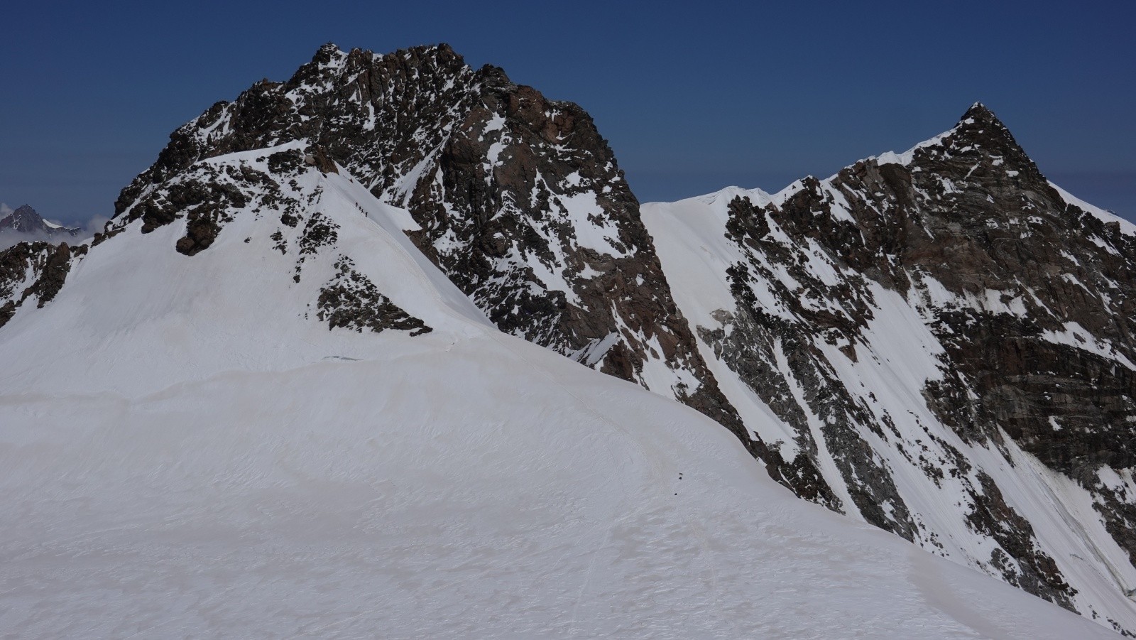 Panorama au téléobjectif sur la Punta Zumtein avec Daniel et Bernard encore au sommet puis Dufour et Nordend