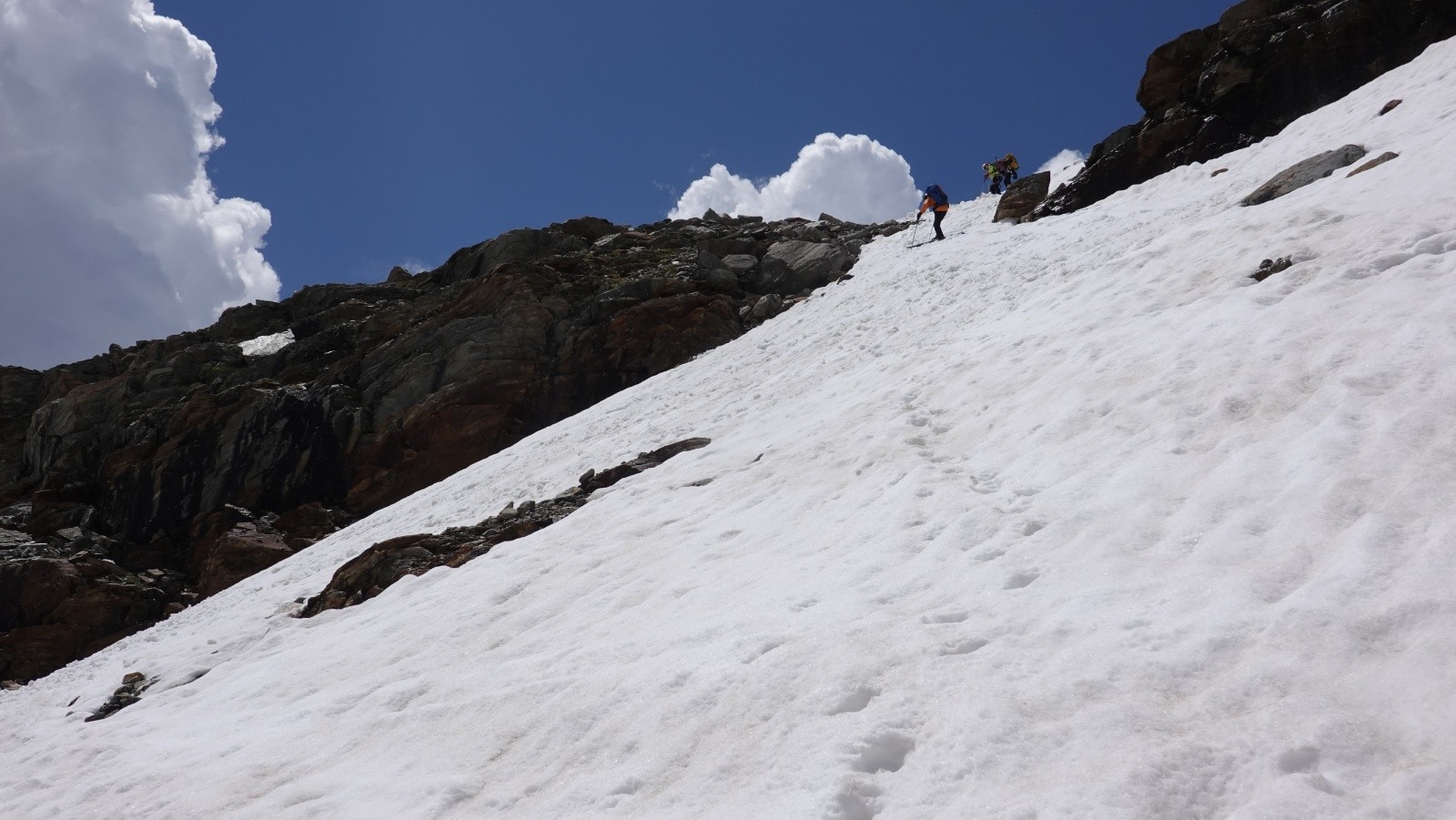 MalgrĂ© un Ă©pisode de fortes chaleurs qui perdure depuis une petite dizaine de jours et comme il faut sây prendre trĂšs tĂŽt pour rĂ©server au refuge Gnifetti, nous avions obtenu des places pour ce crĂ©neau du jeudi soir au refuge en espĂ©rant que la mĂ©tĂ©o nous soit favorable malgrĂ© des orages annoncĂ©s. Finalement, la mĂ©tĂ©o a Ă©tĂ© bien meilleure que prĂ©vue durant ces deux journĂ©es ce qui nous a permis de skier dans le secteur du Monte Rosa cĂŽtĂ© italien avec de trĂšs bonnes conditions de neige au-dessus de 3350m. Lâenneigement en cette mi-juin fait plaisir Ă voir avec des crevasses encore bien bouchĂ©es et ce malgrĂ© une isotherme 0°C qui flirte autour de 4400m depuis environ une bonne semaine. Pour autant avec cette chaleur prĂ©coce, lâenneigement va rapidement diminuer et les conditions de neige se dĂ©grader.