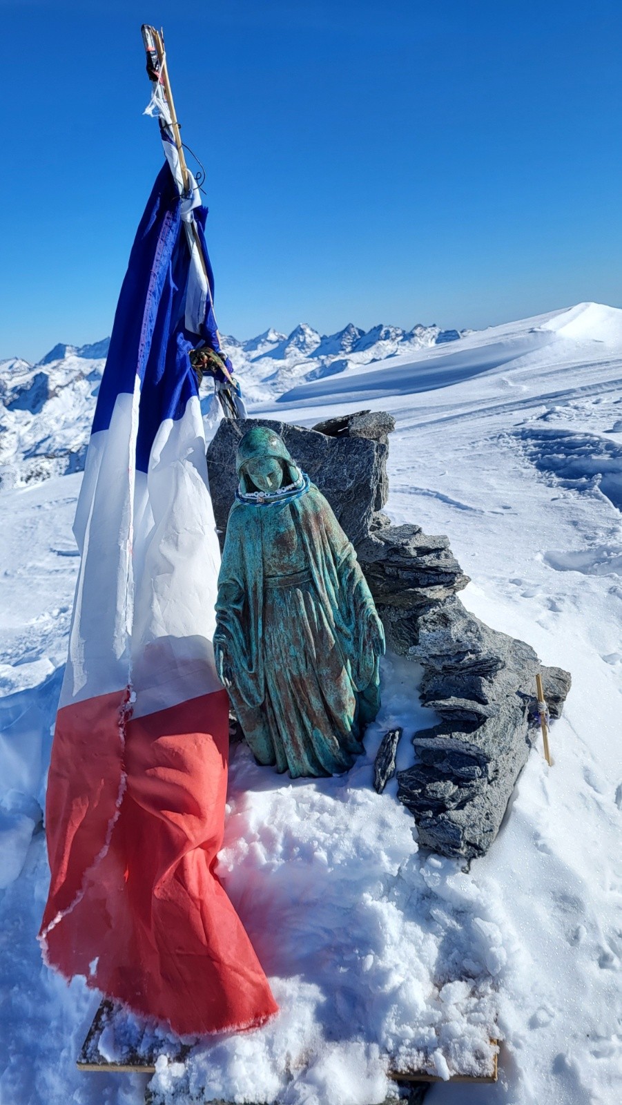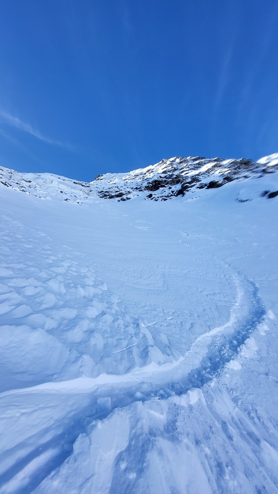 Je suis parti à la gauche de la vierge en Est dans une pente bien raide avec des spines, petit slalom entre les barres un peu de dry ski pour finir bloquée. Je mets les crampons légère traversée pour rejoindre la neige. A partir de la le crux est passé la pente s'ouvre un peu je peux lâcher les spatules pour me faire plaisir dans une bonne poudreuse.