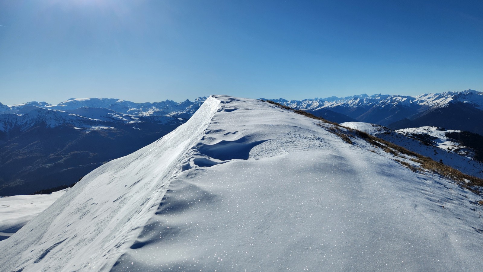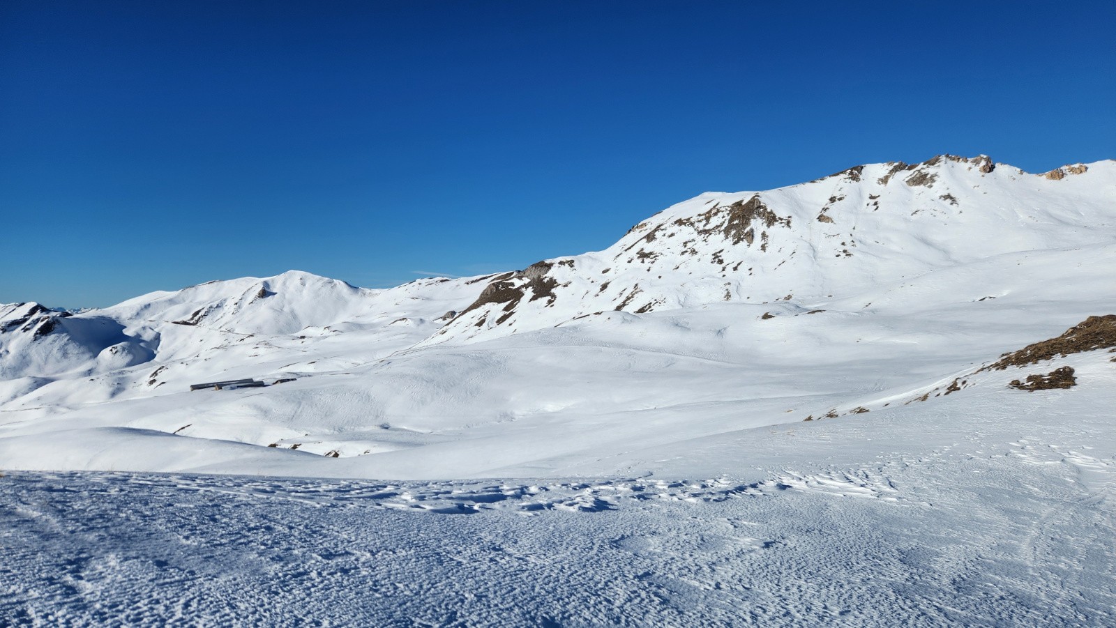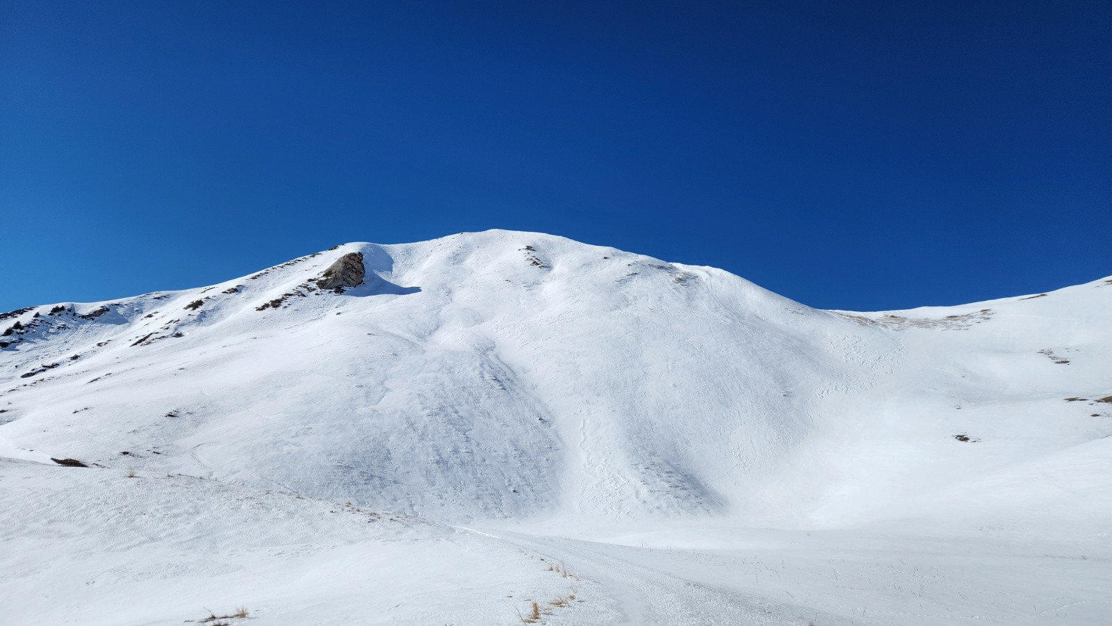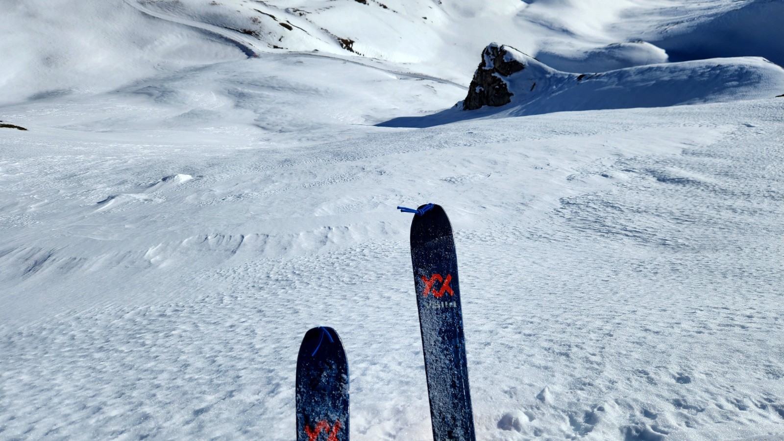 Conditions pour le ski : Neige dure le matin au soleil, puis moquette en plein Sud/SudEst. Dans les vallonnement plus à l'ombre quelques restes de poudre tassée/soufflé et quelques plaques dures quand c'est plus raide.