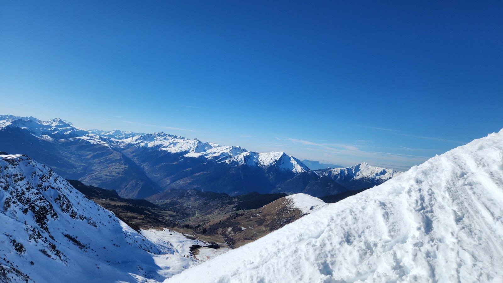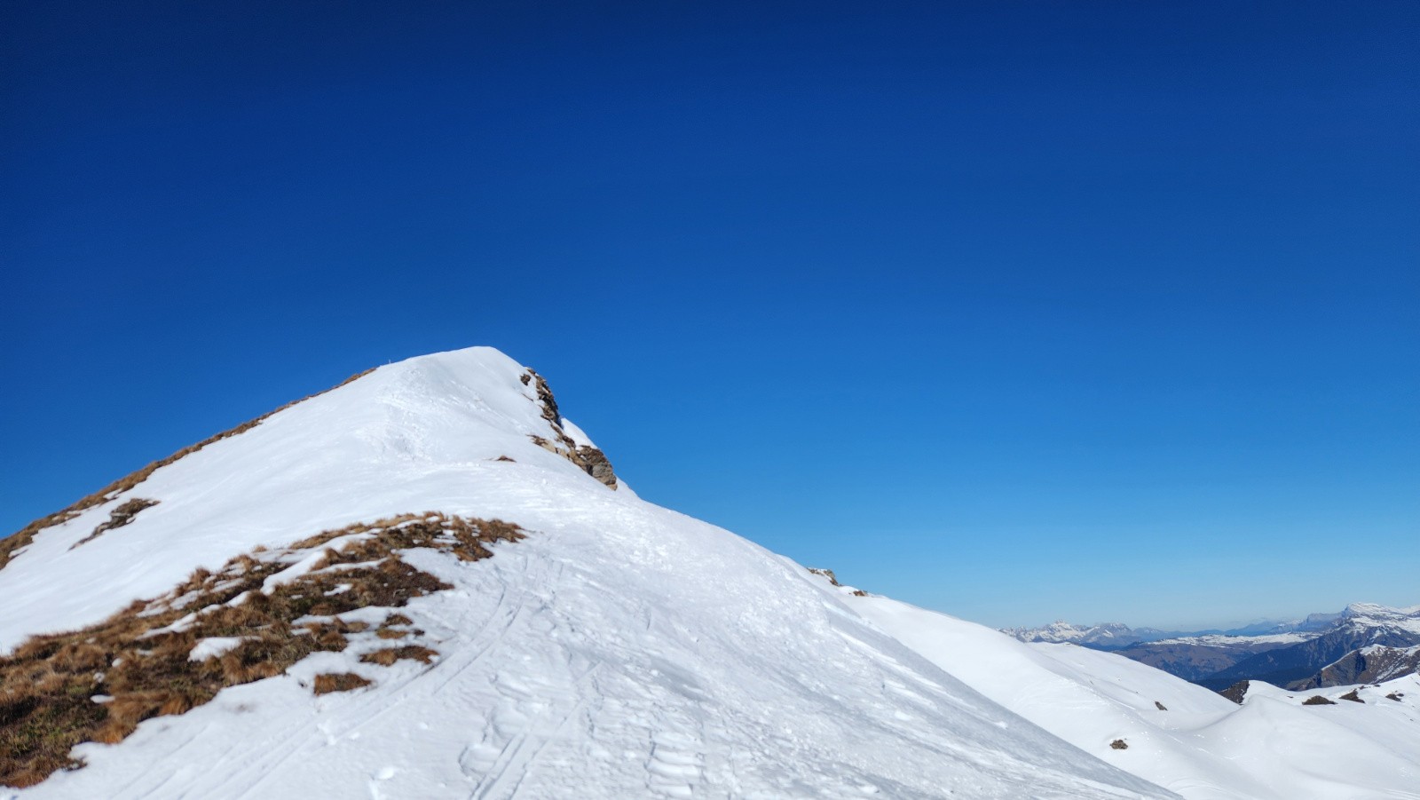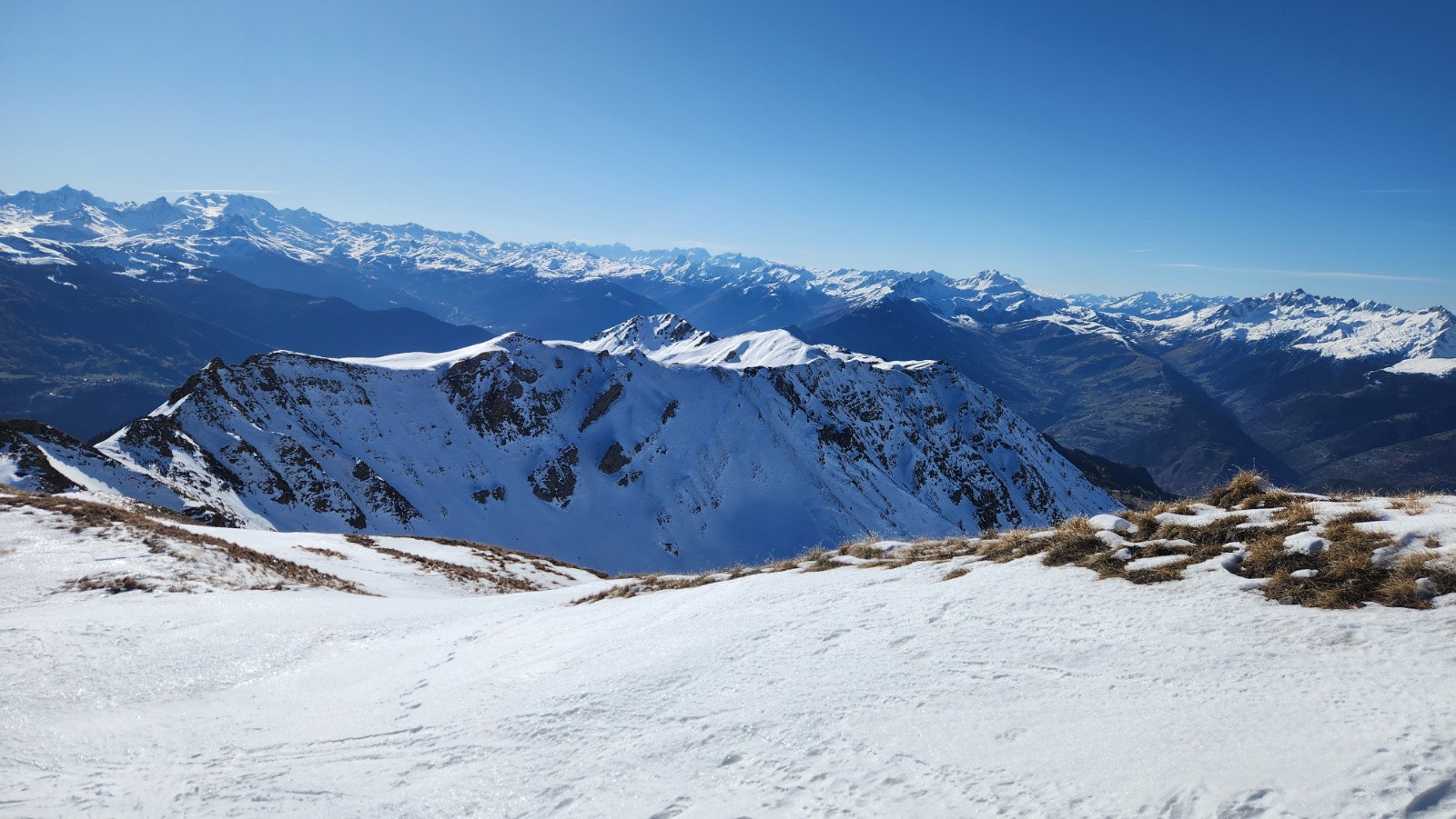 Plus qu’à remonter à la pointe de Dzonfié, qui elle est déjà tracée. Les pentes du haut sont en neige changeant, plus bas la moquette d’automne réapparait.