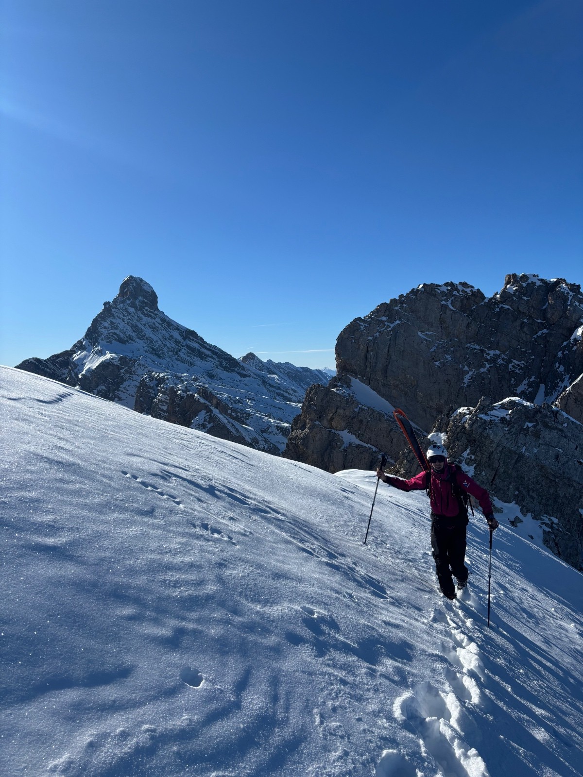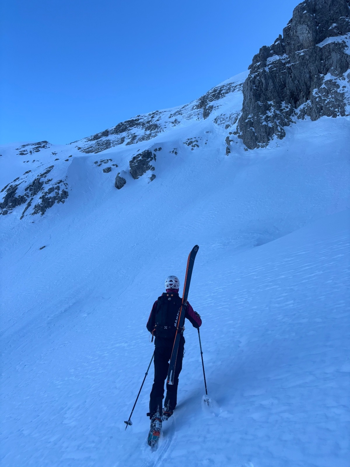 Puis le soleil fait son apparition sur le triangle de Bella Cha, on espère une face dure qui se skiera en décaille mais le bas est peu chargé et pas dur. On remonte tout à droite dans un mix de cailloux, herbes neige et lappiaz désagréable. On ne compte pas trop sur le ski au point de se demander si on ne décollerait pas en haut. Finalement le dernier tiers est en neige dure et c'est pas idéal pour décoller d'autant + que des nuages arrivent. On skie la face rive droite et finalement c'est chouette ! Alternance de neige dure et de poudreuse, seulement un tout petit peu de carton sur le bas et un peu de manque de neige. Mais bien meilleur qu'on aurait pu l'imaginer.