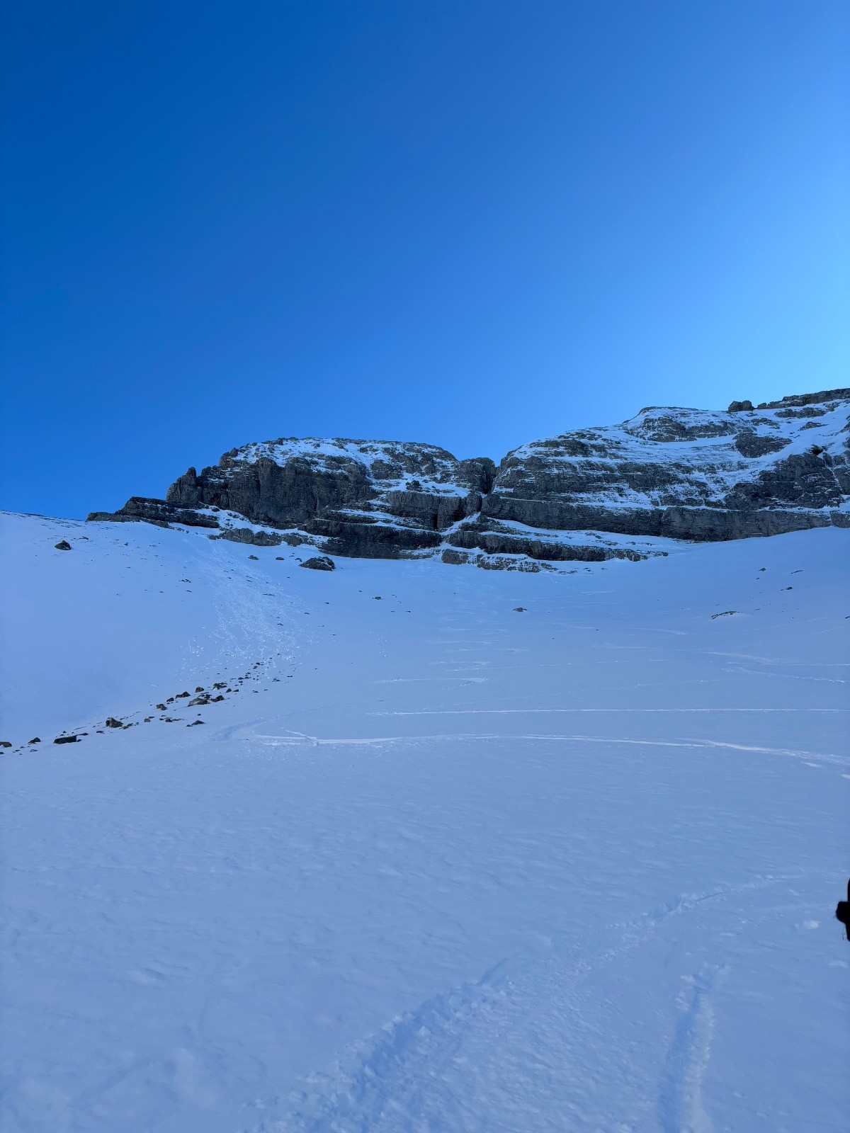 Départ à 8h30 du Reposoir pour un peu de portage, après la ferme on continue un petit peu pour ensuite couper sous le Chalet de la Combe Marto par des rampes herbeuses évidentes. On remonte au mieux une partie un peu plus raide pour enfin chausser à 1800m environ.