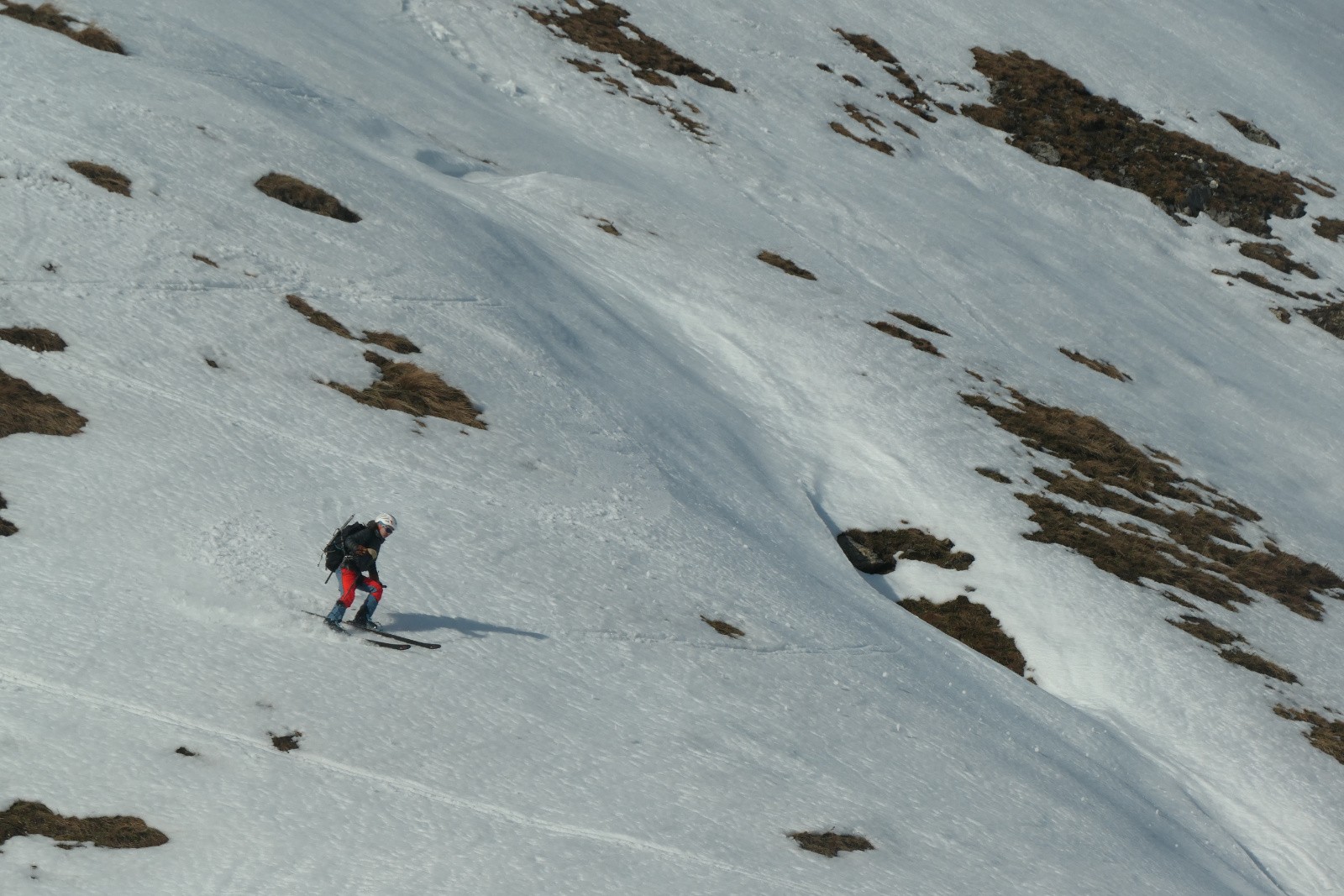 Effectivement encore un beau vallon, un peu caché depuis le bas. Le couloir est évident. Il est un peu ravagé par les boulettes mais pas tant. Il manque presque un peu de décaillage mais pas tant. Bref, pas d'argument pour avoir la flemme de le remonter. J'optimise quand même en montant au plus haut à ski. On passe en crampons alors que le soleil décide de se cacher derrière un voile de nuages. Plus qu'à sortir sans trop trainer histoire que la neige ne redurcisse pas.