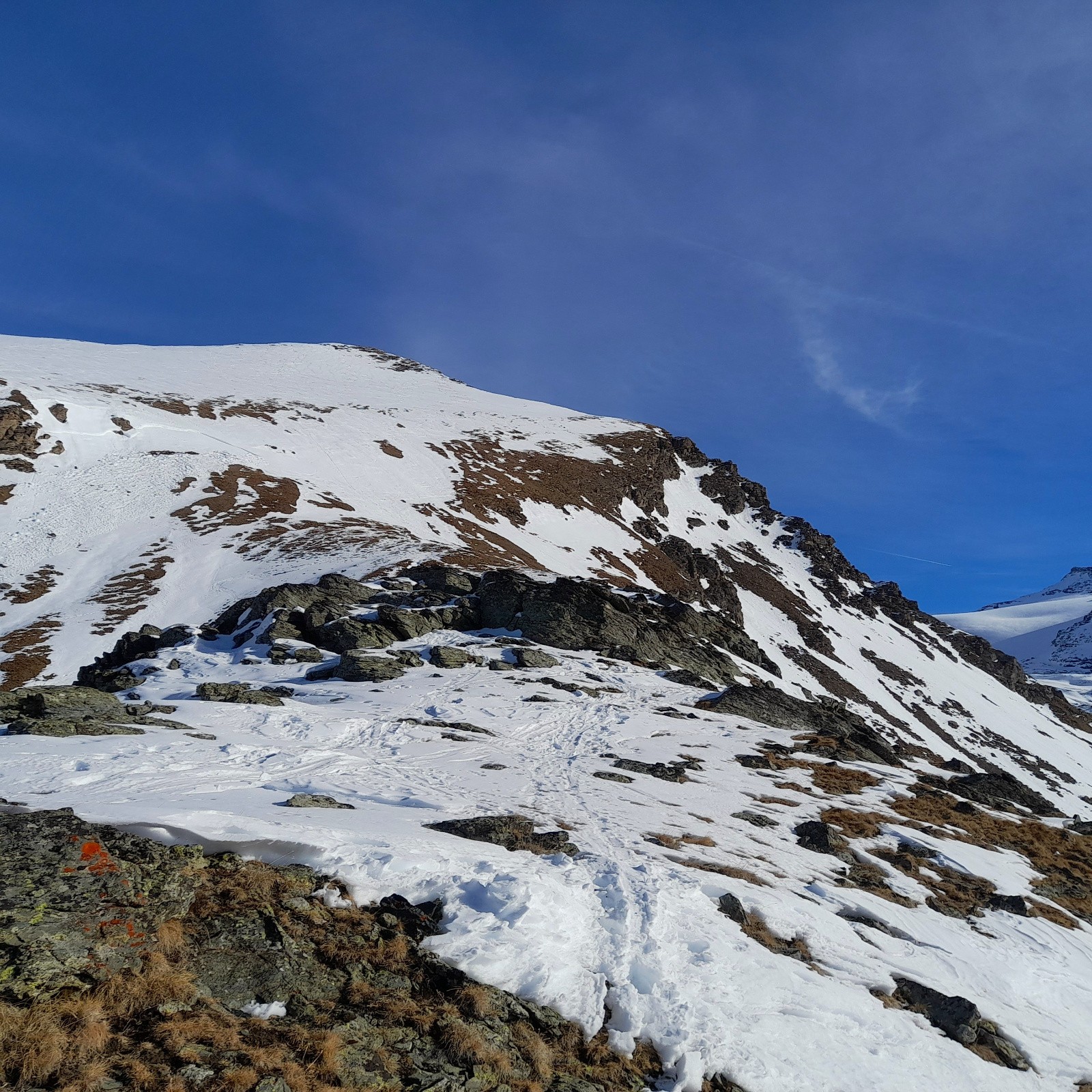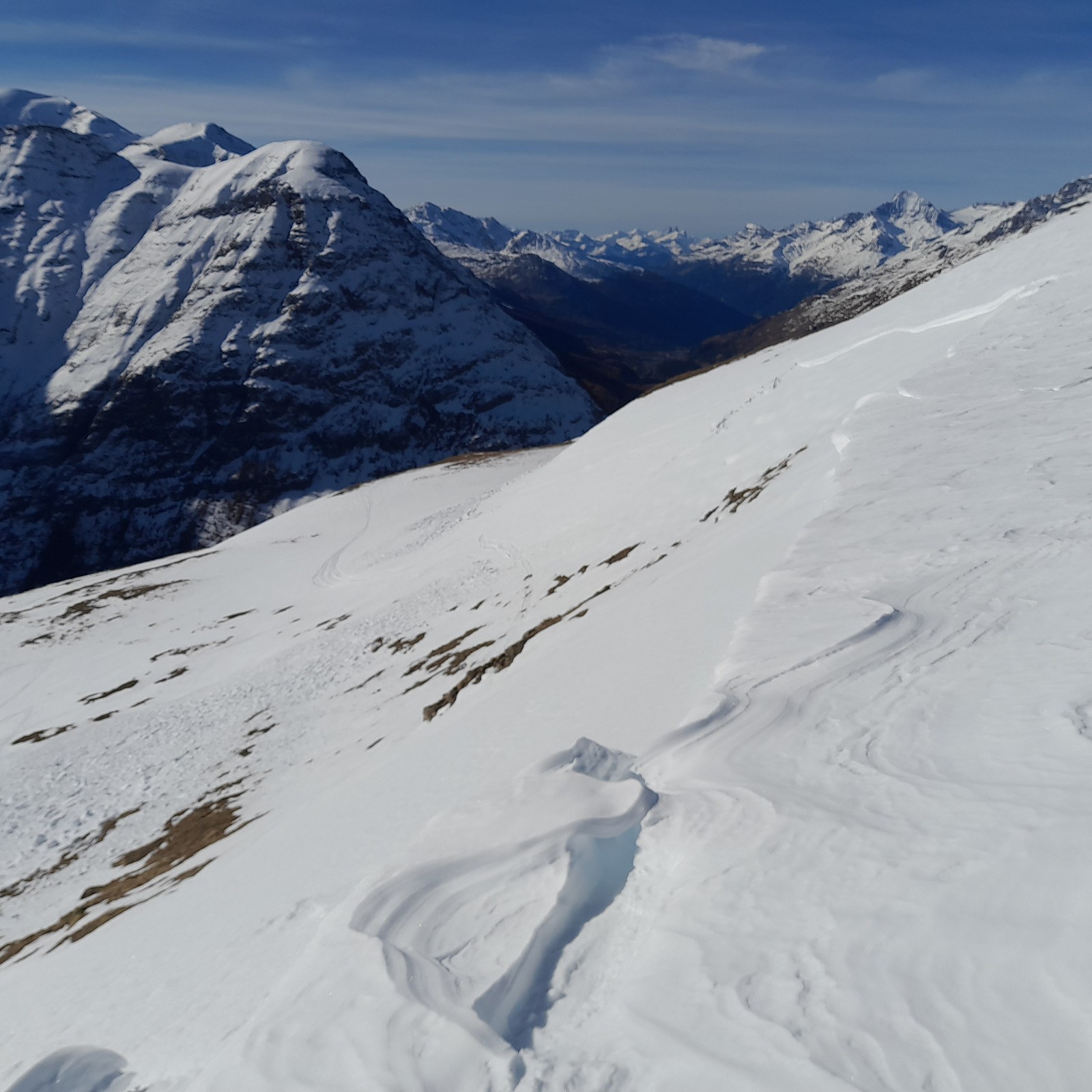 Conditions nivo et activité avalancheuse : Recherche d'itinéraire à partir de 2.300m jusqu'à 2.500m pour éviter de passer sur des plaques d'herbe aller et retour, sommet bien enneigé, 2 plaques se sont détachées, altitude 2.600m environ