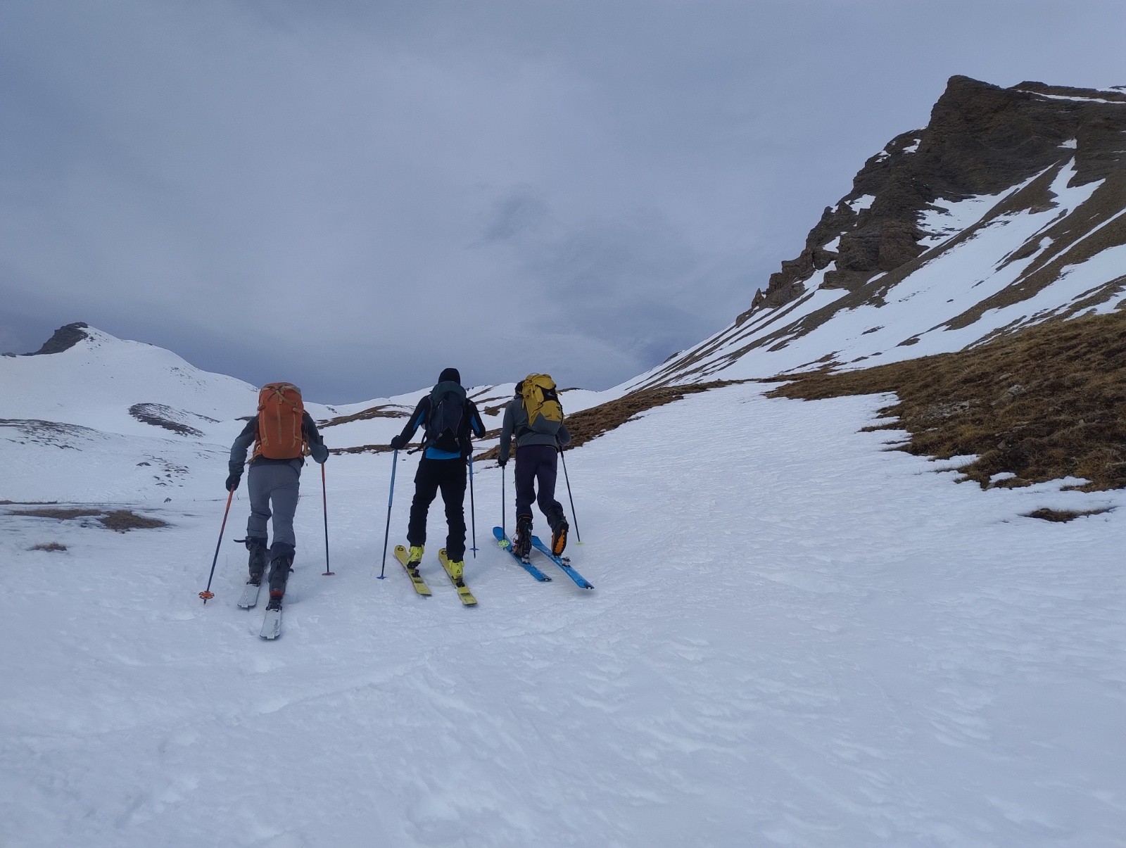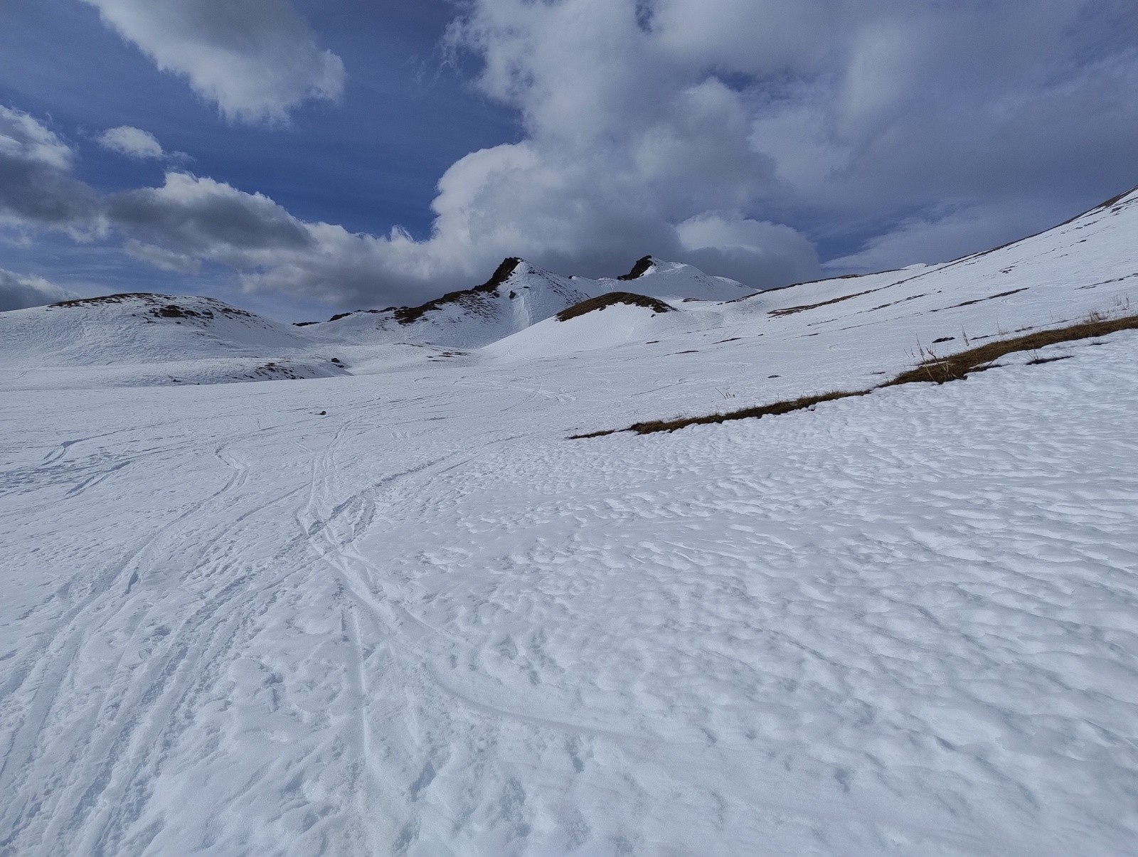 *Conditions pour le ski : hétérogènes, avec neige croûtée, cartonnée, durcie par le vent, en vieille poudreuse, ou neige de printemps sur la fin de l'itinéraire l'après-midi.