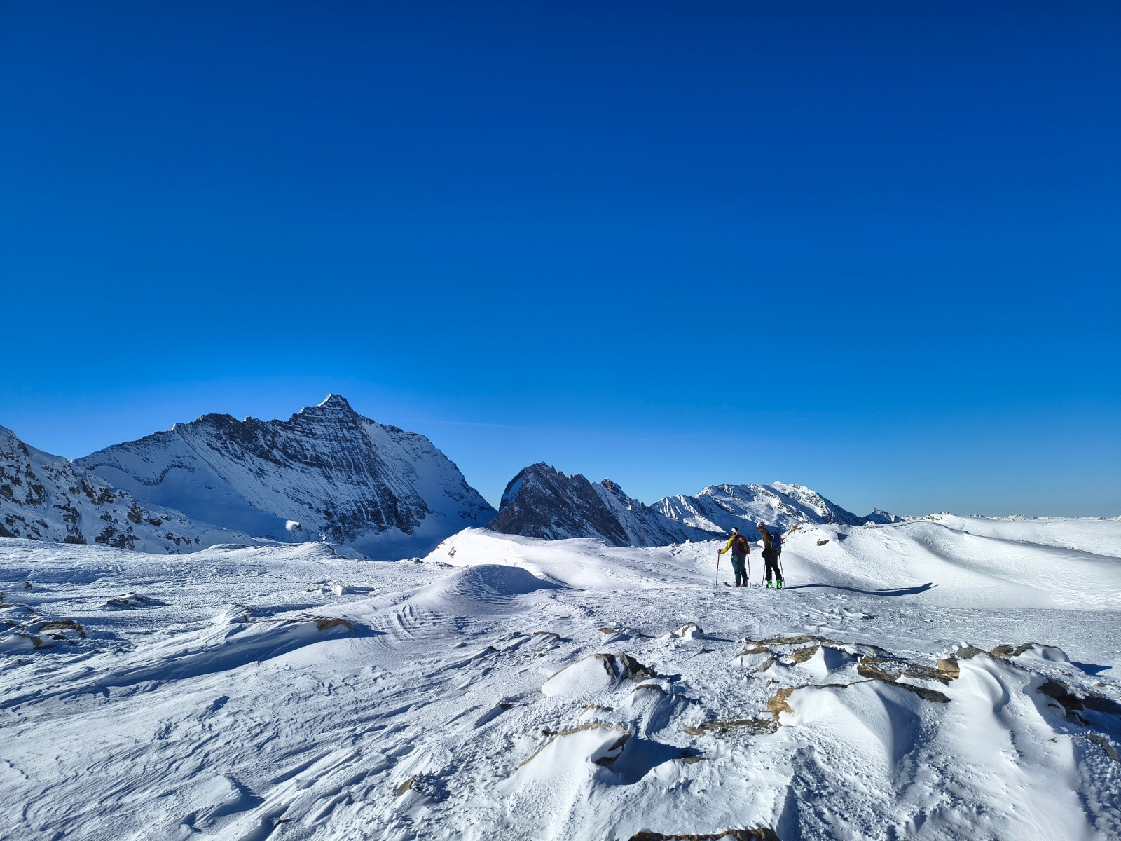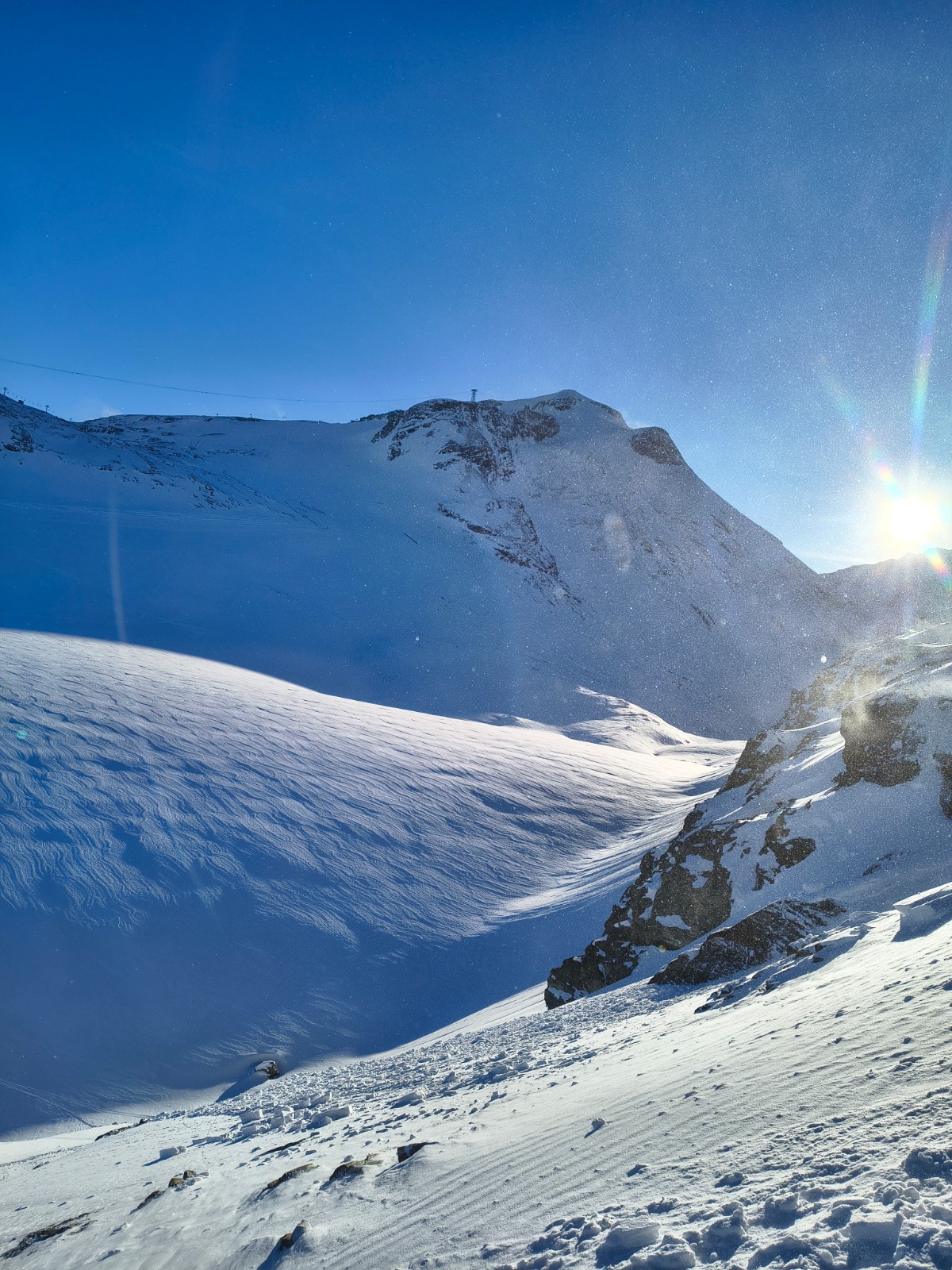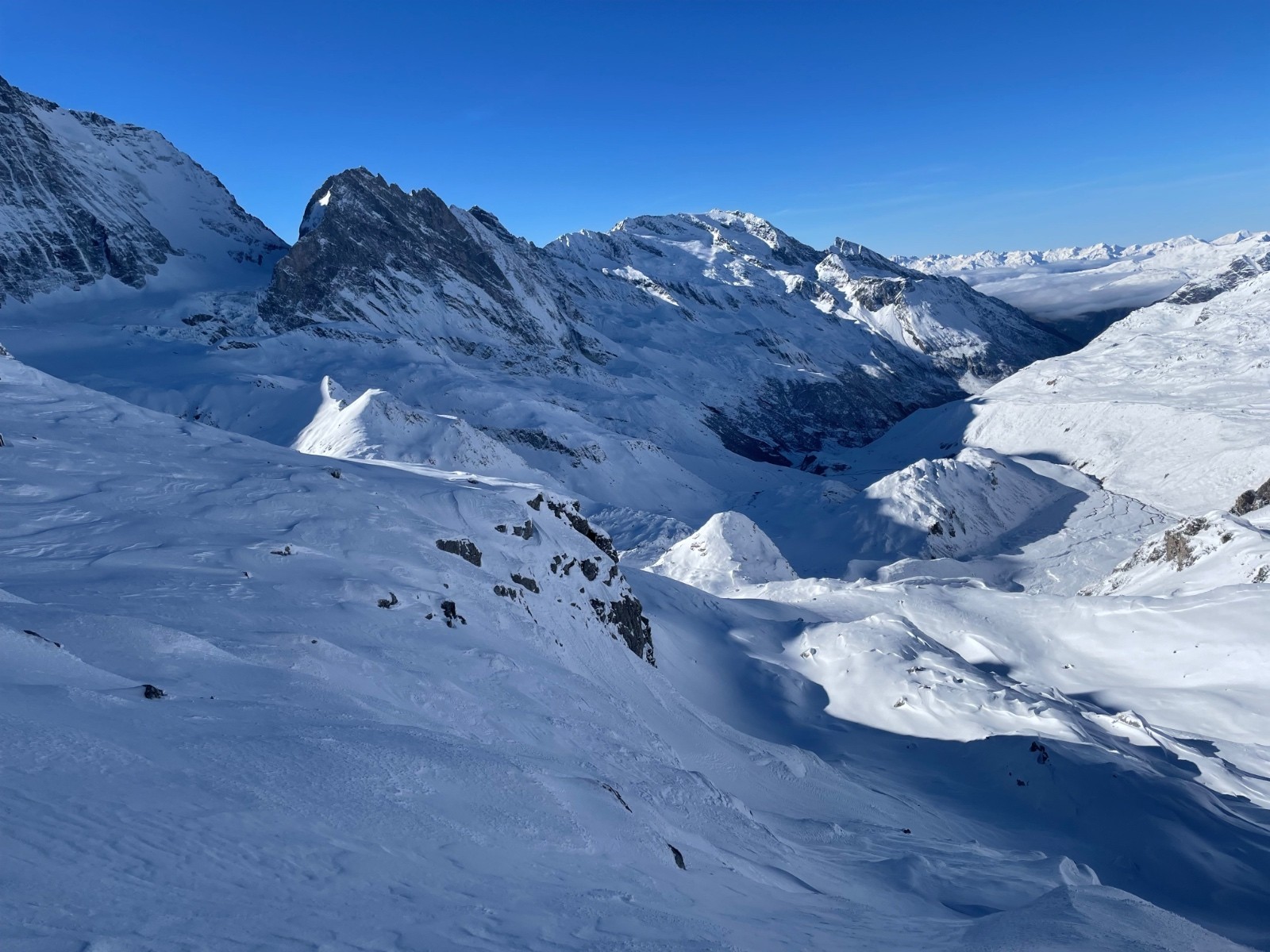 Conditions pour le ski : 5 centimètres de neige fraîche légèrement ventée sur la piste Double M jusqu'à 2600 m environs. La quantité de fraîche augmente à partir de ~2700 m pour atteindre plutôt 15-20 cm en général vers 3000 m. Cette neige est légèrement travaillée par le vent. Certaines combes abritées permettent de trouver une neige poudreuse légère mais la plupart du temps, elle gagne en fermeté. Une croute de regèle est présente en Nord comme en Sud, même à 3000 m. Dès lors que la neige récente est très légère ou en faible quantité, la croute assez dure se fait sentir à ski.