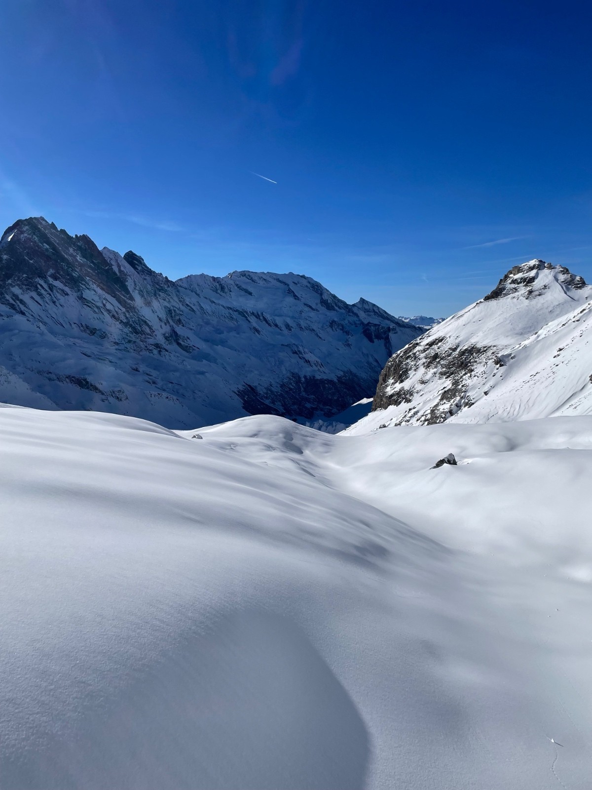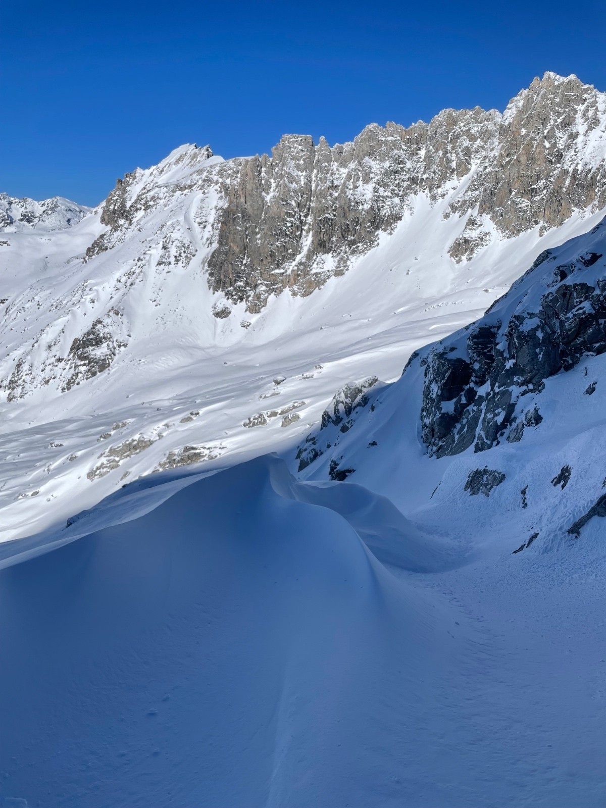Les croupes et les bosses sont soufflées et laissent ressortir les cailloux ou la vieille neige. Il faut skier "sur des oeufs" car les requins (rochers) ne sont pas loin ! Dans les accumulations sous le vent d'Ouest, on a trouvé jusqu'à 60 cm de neige fraîche - dans les plaques décrites ci-dessous -.