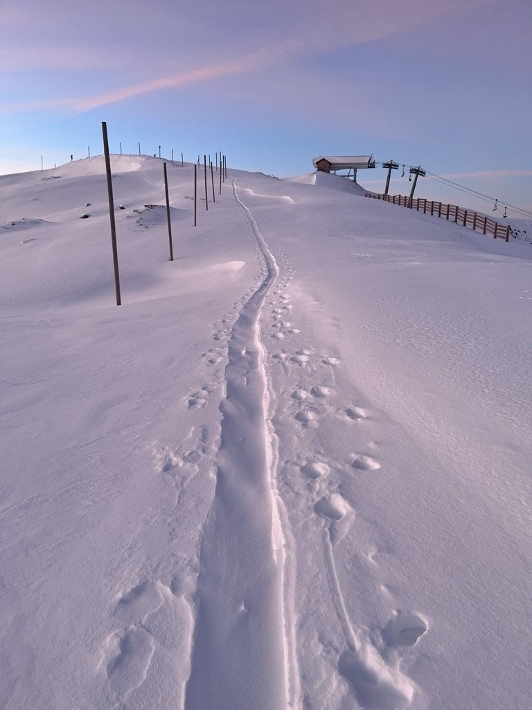 La saison 2025-56 est lancée pour moi :) Pas grandiose la quantité en bas, mais ça a suffit. Vu que j'étais sous médocs jusqu'à hier pas de grandes attentes quant à la forme, donc course parfaite pour se relancer. La trace de montée en haut suit l'arête au lieu d'aller direct, mais j'avais la flemme de retracer. Et de toute façon avec les sharks dans la pente sous le col on peut pas faire une matinale hyperefficace au niveau timing. ça a fait du bien de sortir avec du beau et une aube magnifique! Photos plus tard pendant la pause de midi