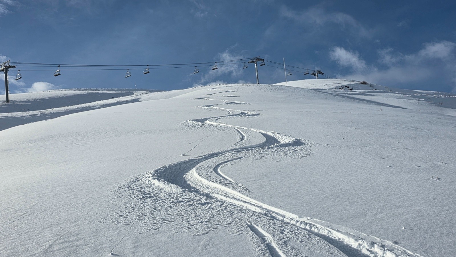 Partie haute très bonne poudre côté piste noire. Manque quelques cm plus bas ça tape sous la couche avec l’herbe gelée.
