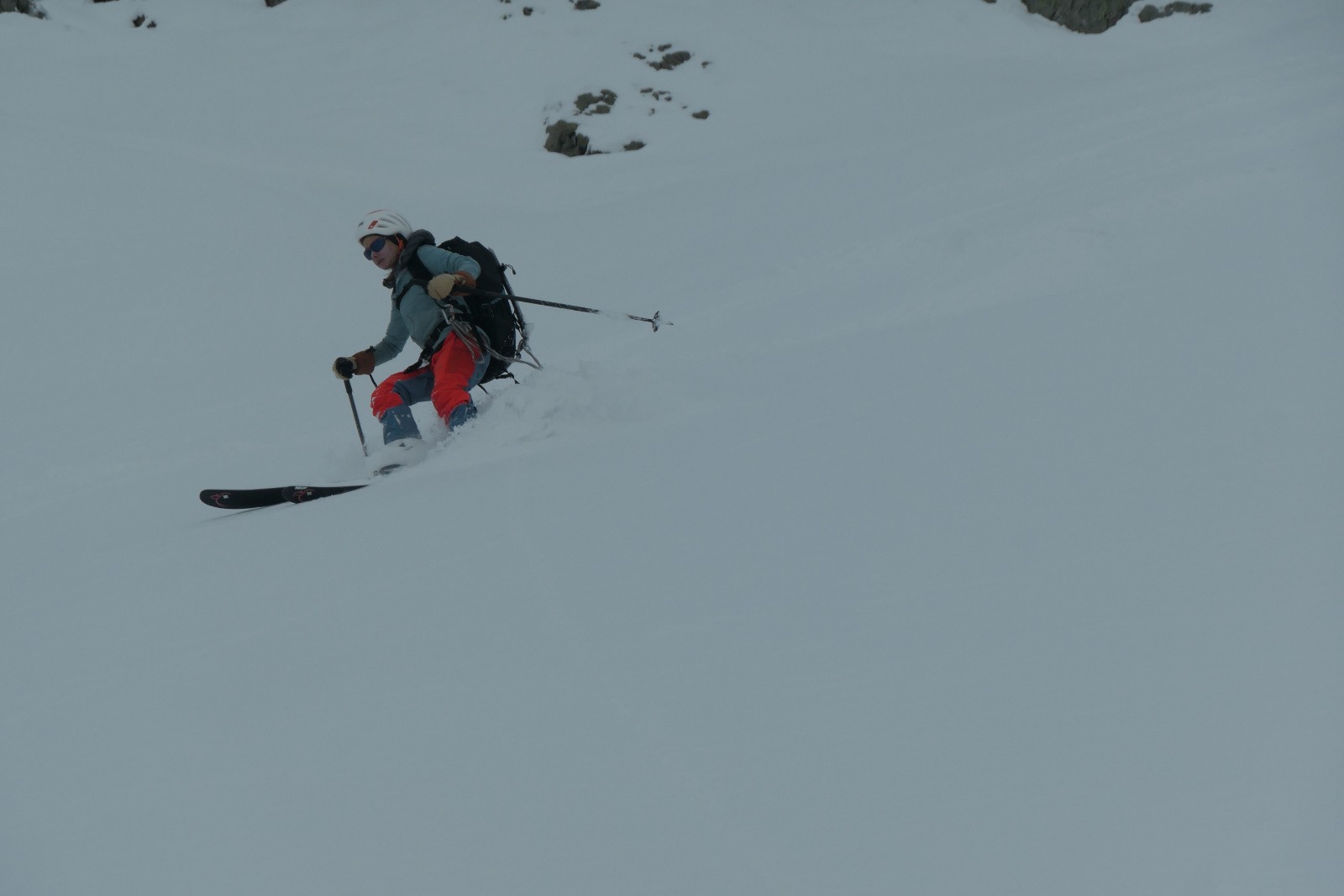 Descente au top dans une poudre dense jusqu'à 2100m. On hésite un peu à repeauter car les nuages commencent à être bien présents. Du coup on fait simple on reprend notre trace jsuqu'au pied du couloir. Seconde descente encore bien chouette jusqu'à 1800m. Ensuite on traverse le vallon pour éviter le pierrier puis on atteint facilement l'embranchement à 1650m.