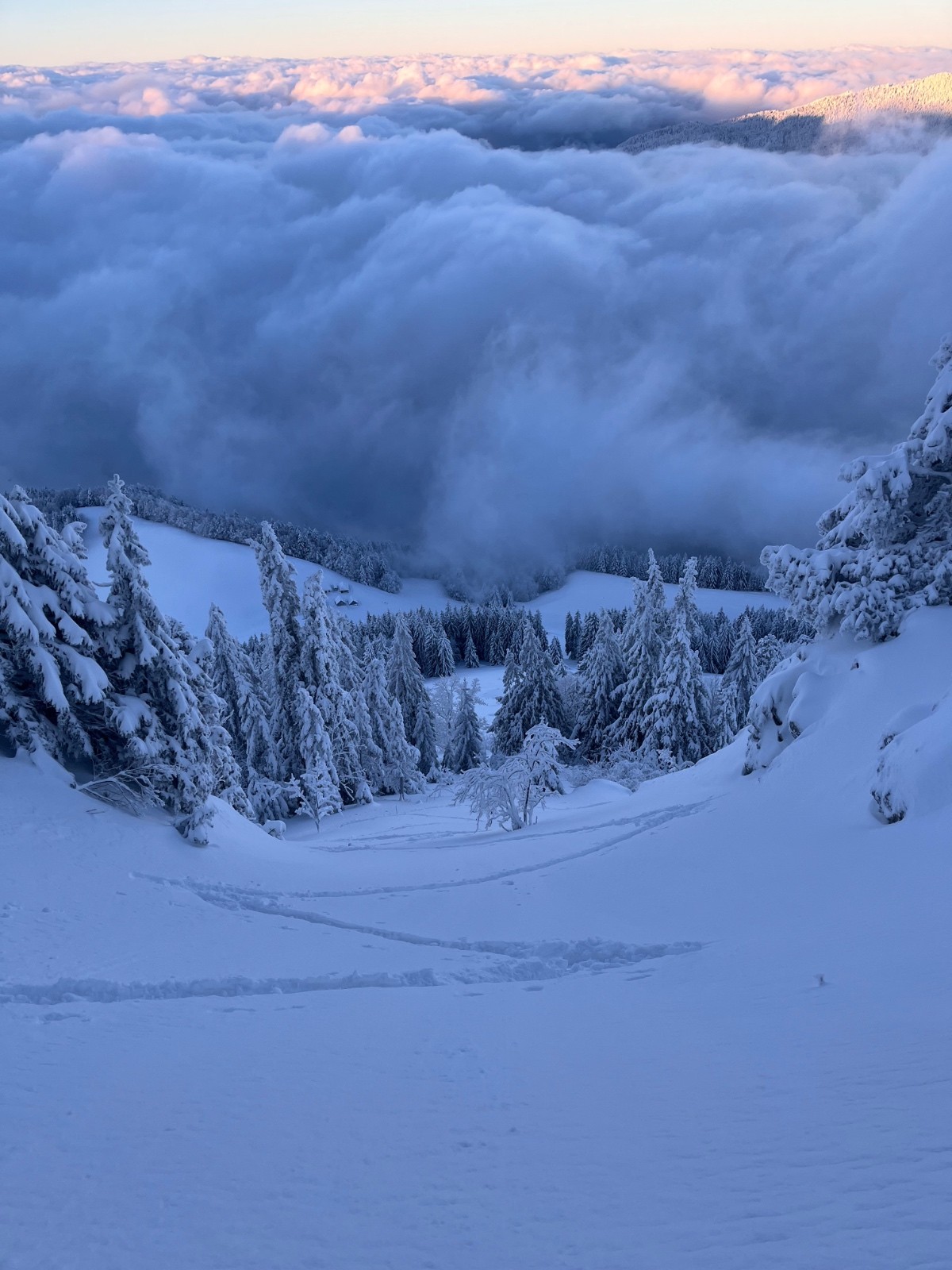 Conditions pour le ski : super, jusqu’à 1400m faut être un peu délicat mais au dessus gros volume de neige froide. Parfois un peu cartonnée sur les zones exposées aux vents.