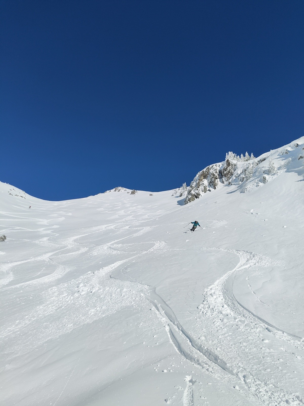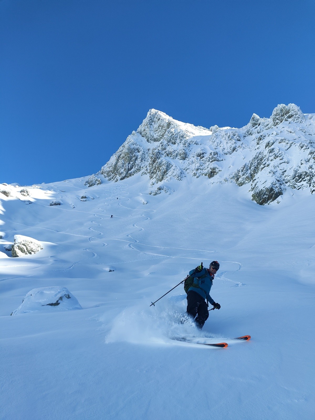 Conditions pour le ski : Excellent en face ouest, et bien en sud. Mais il faisait chaud, même a 2000m a midi. En sud, ça risque de croûter cette nuit. Et le vent à pas mal damer la neige. Y avait 10cm de fraîche légère en sud sur neige dense. Bien 30cm en ouest.