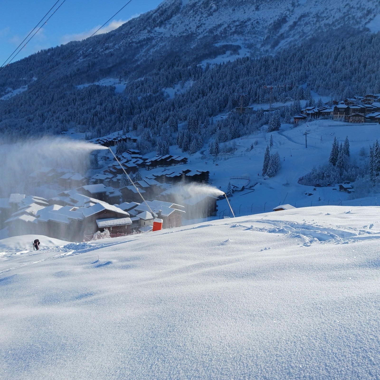 Météo/températures : -7 vers 9h, plein Nord. Petite bise. -2 à 13h. Grand soleil, qui adoucit largement la pause de midi. Beau temps pour les canons à neige
