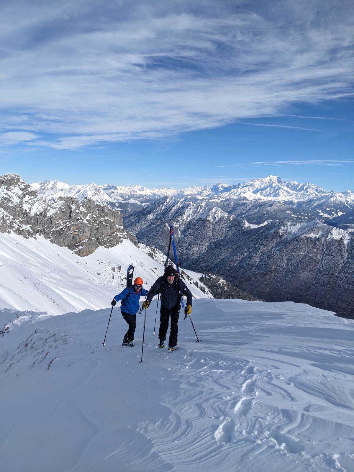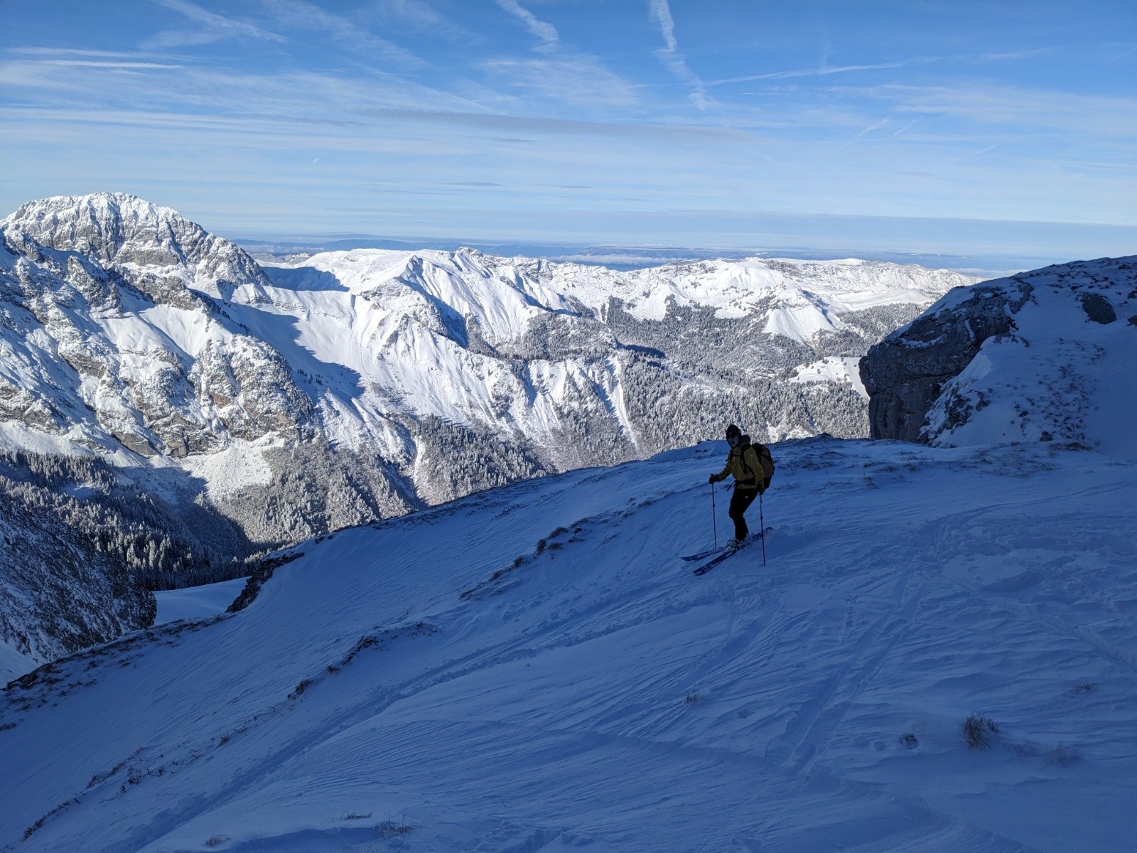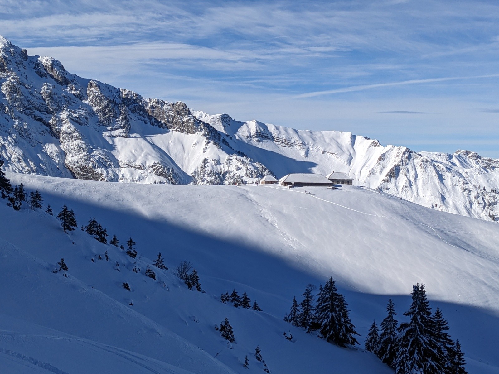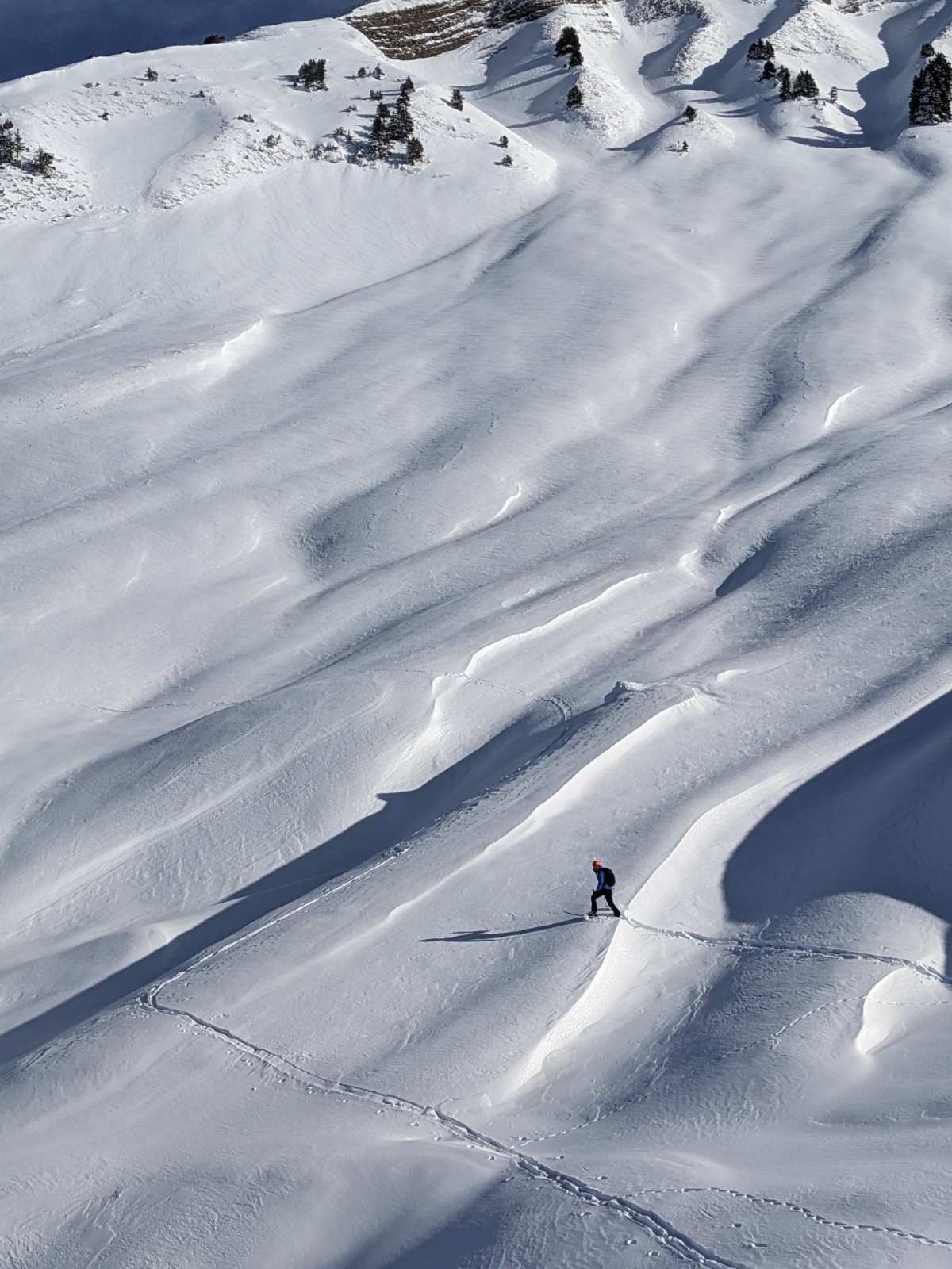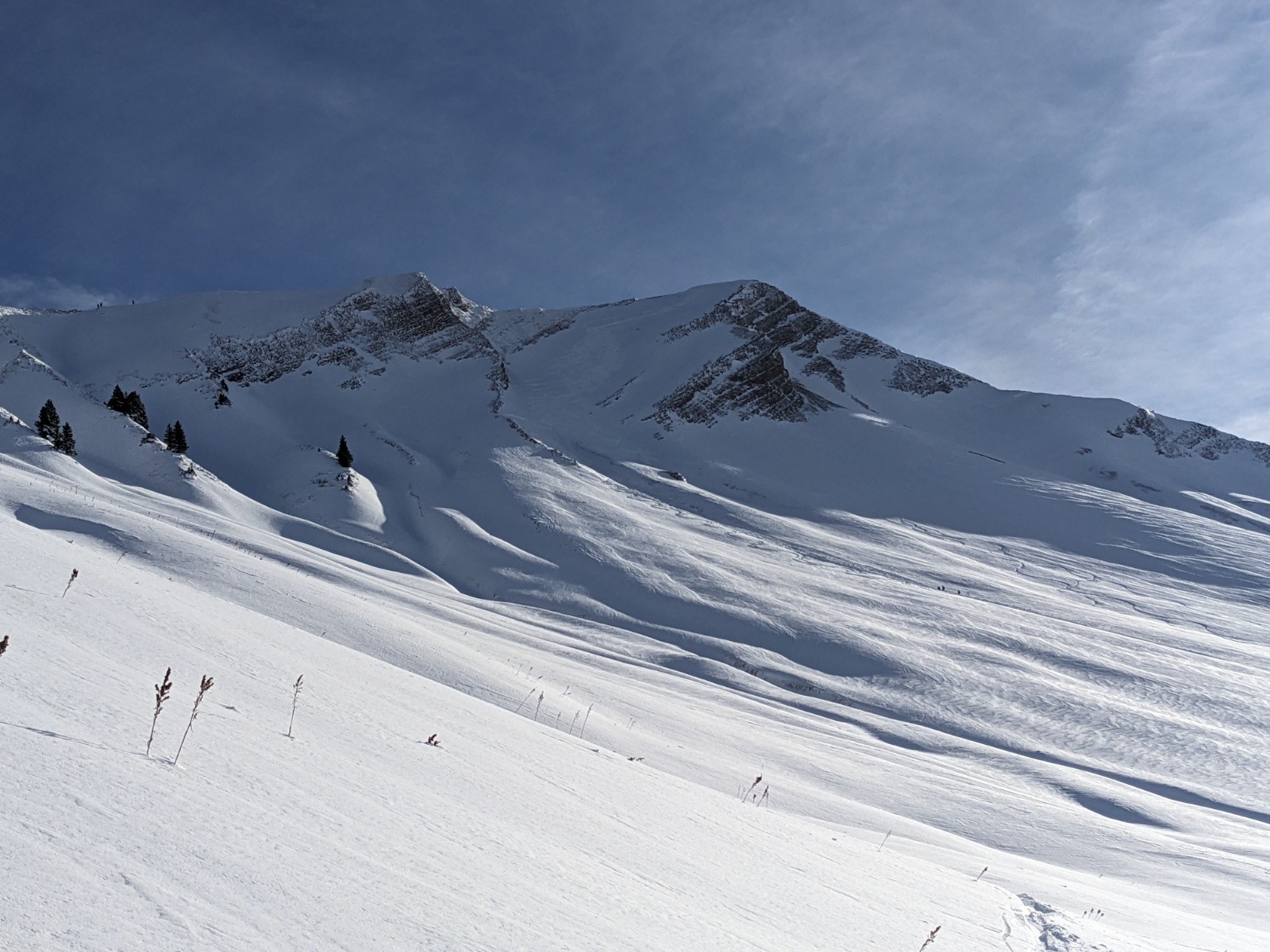 Au sommet personne n'a eu l'envie d'aller tracer l'arête de la pointe de Chaurionde, c'est donc pour nous cette fois-ci. Ca brasse pas mal par endroit. Debut de la NW de Chaurionde en neige soufflée avec encore un grip rassurant puis de belles courbes jusqu'en bas de la combe. On remet les peaux pour une traversée ascendante vers le chalet de l'aulp avant de se laisser glisser a la voiture. Le banc et la petite chaurionde sont maintenant bien rayé, il faut une nouvelle livraison de neige !