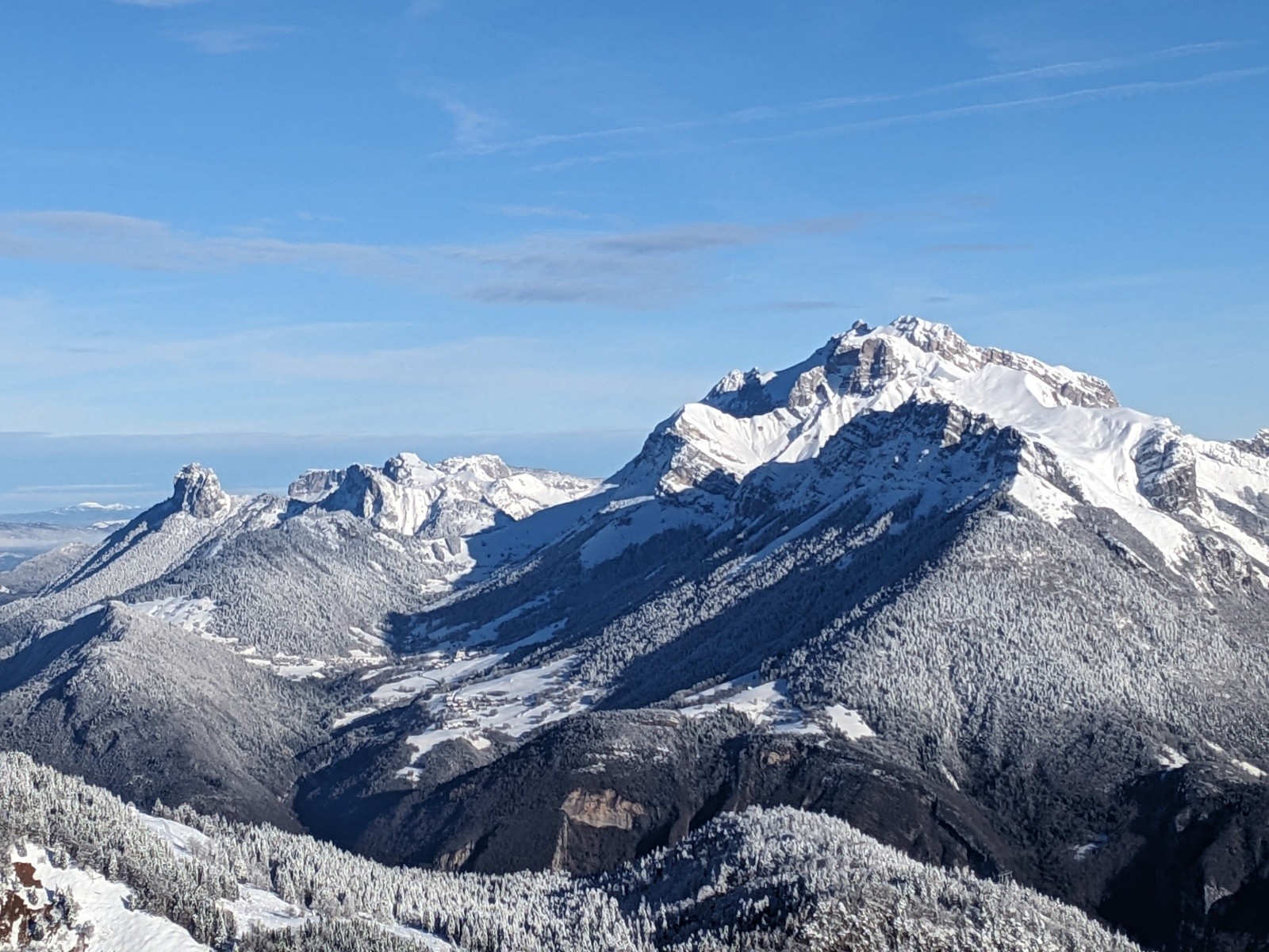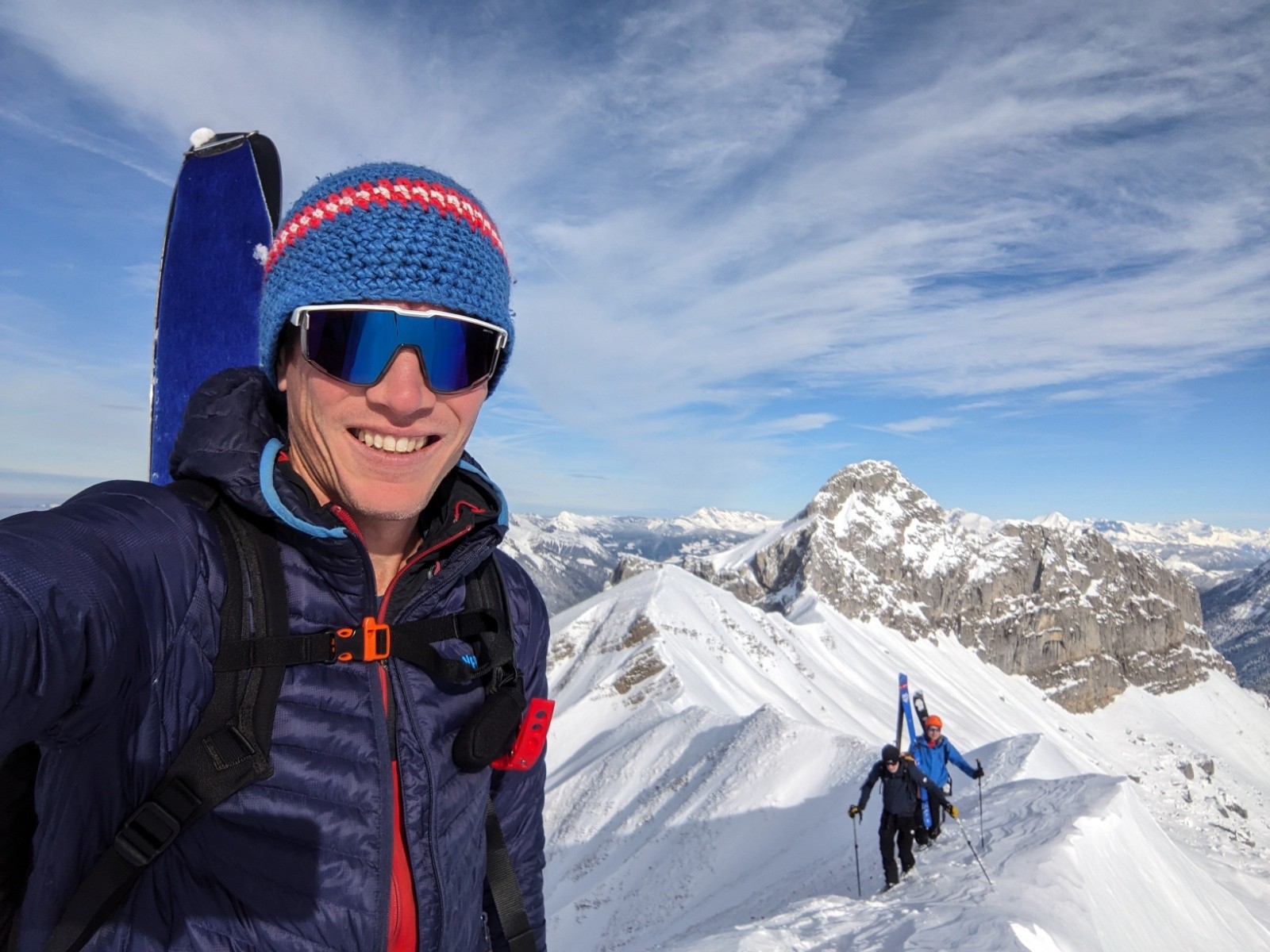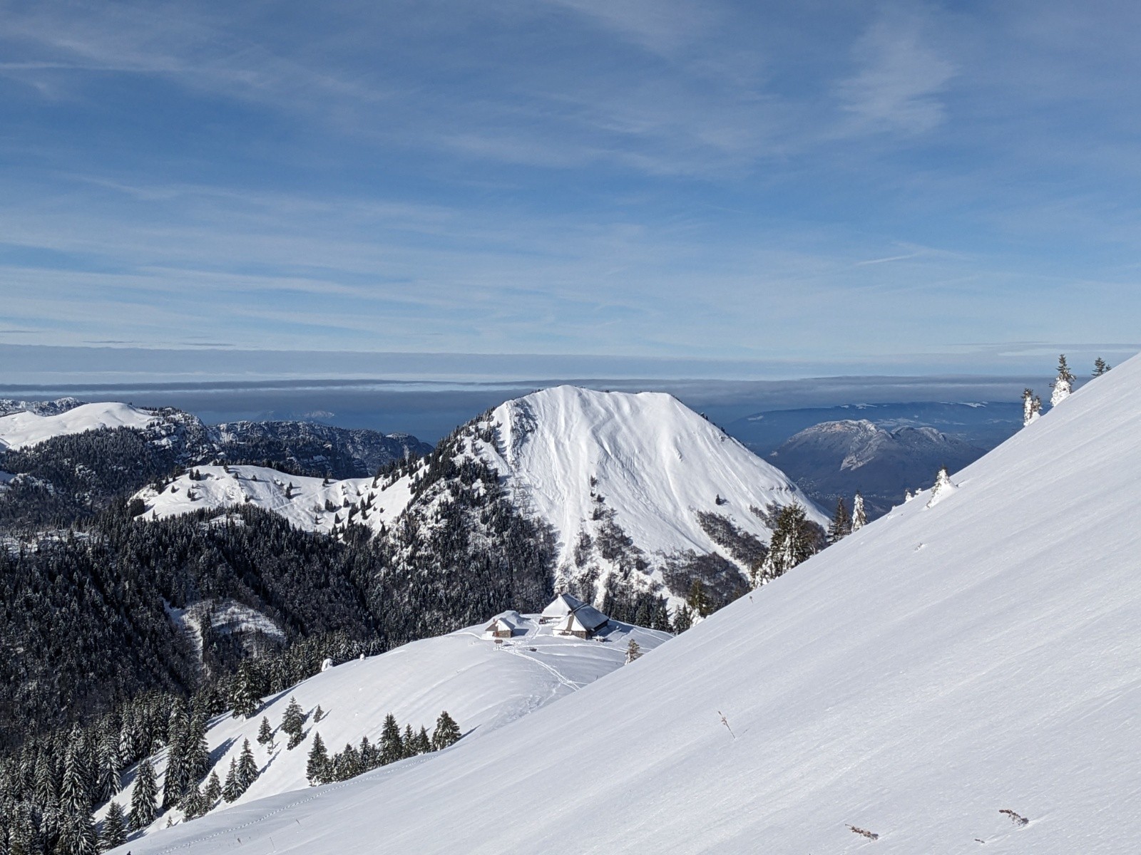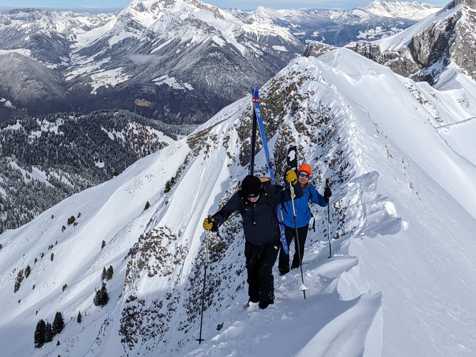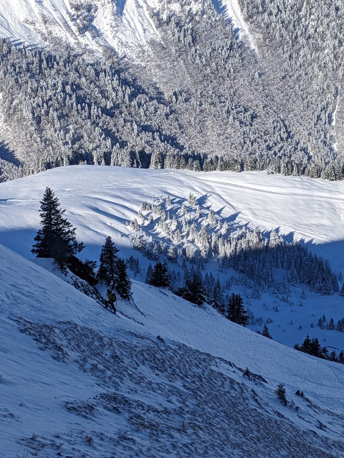 Au sommet personne n'a eu l'envie d'aller tracer l'arête de la pointe de Chaurionde, c'est donc pour nous cette fois-ci. Ca brasse pas mal par endroit. Debut de la NW de Chaurionde en neige soufflée avec encore un grip rassurant puis de belles courbes jusqu'en bas de la combe. On remet les peaux pour une traversée ascendante vers le chalet de l'aulp avant de se laisser glisser a la voiture. Le banc et la petite chaurionde sont maintenant bien rayé, il faut une nouvelle livraison de neige !