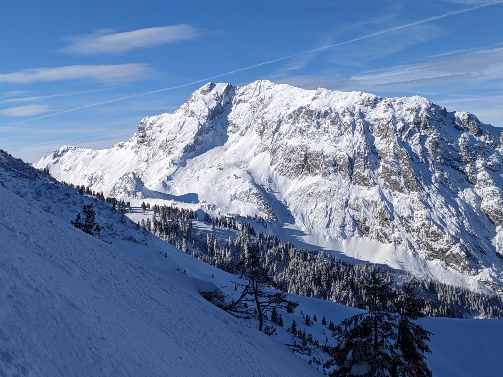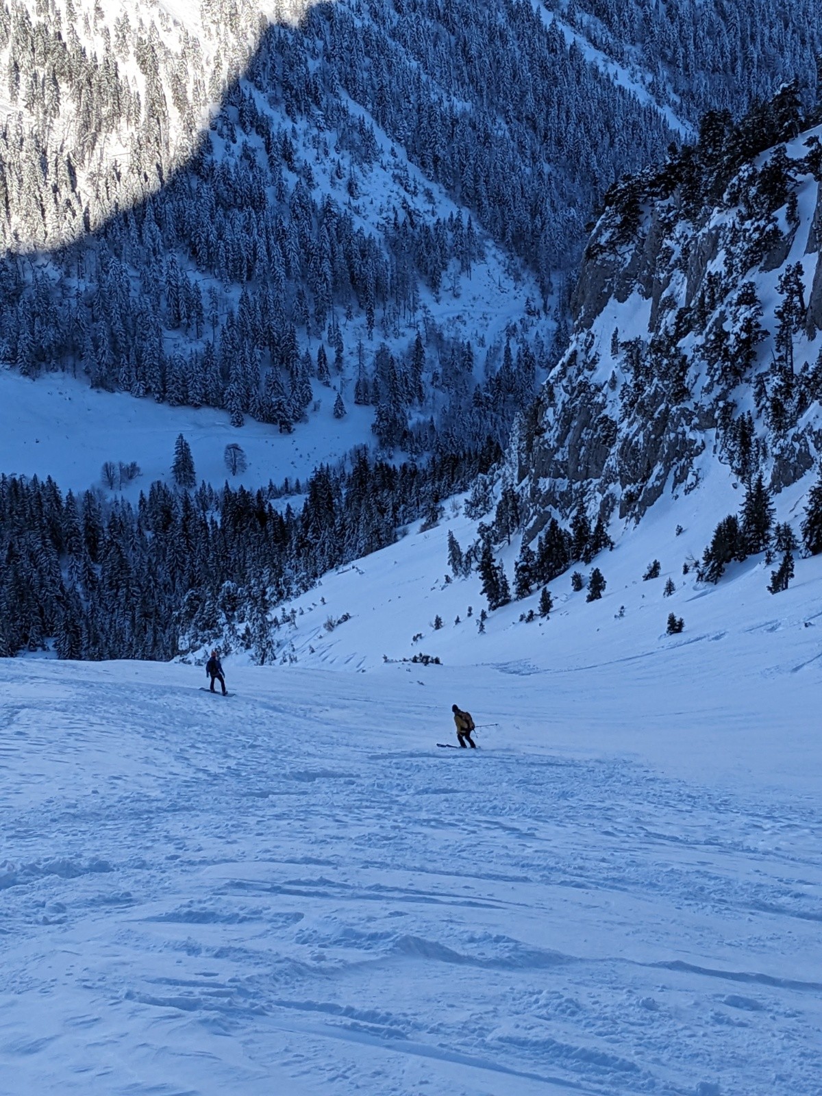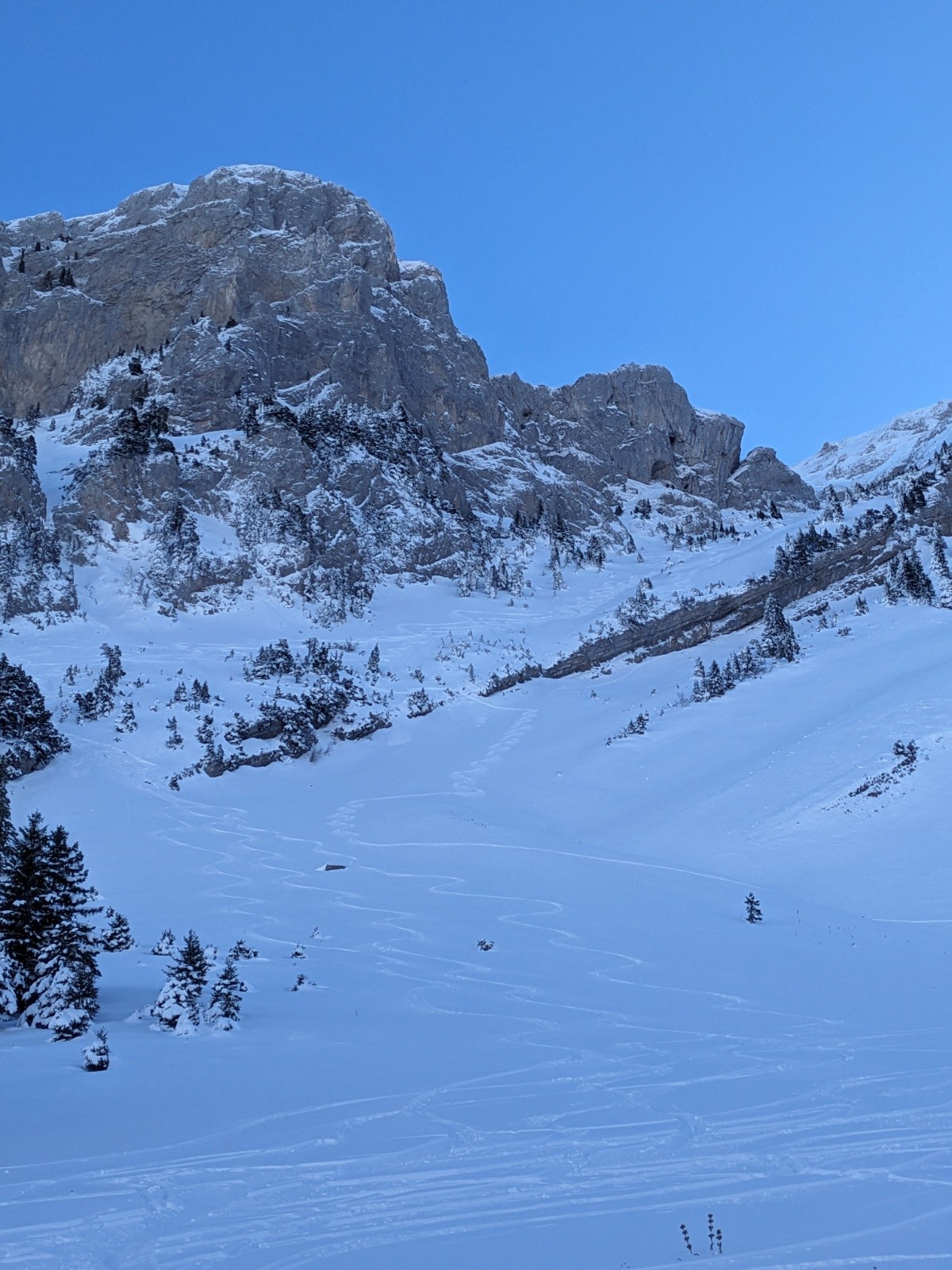 RAS sur notre passage. Un groupe de 3 a déclenché une plaque de surface en rive gauche de la NW de Chaurionde. Une personne s'est fait bousculer. Vue de loin.