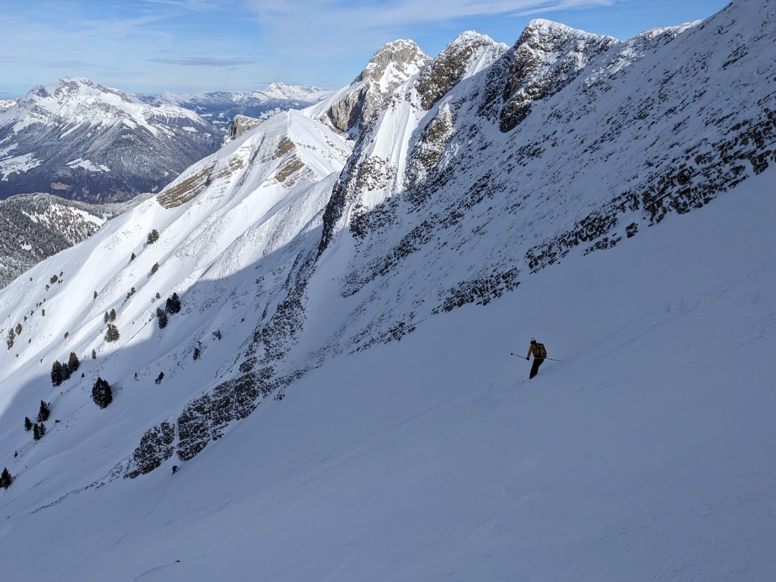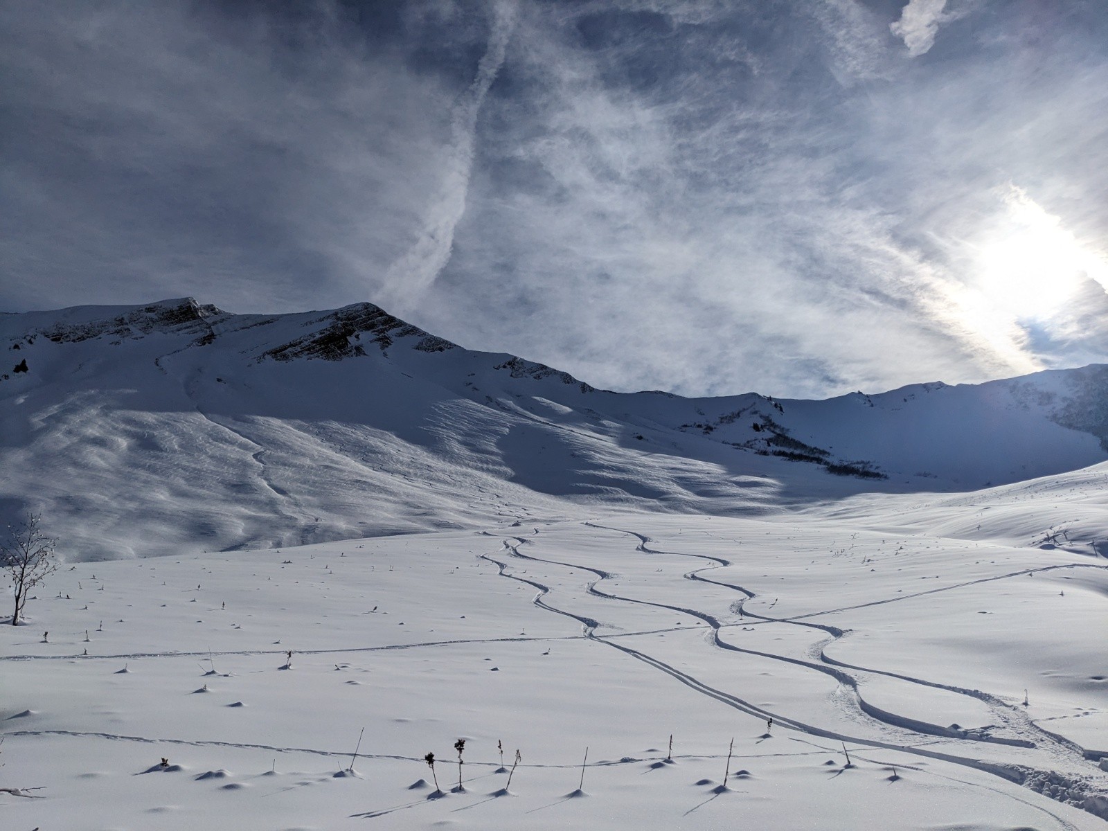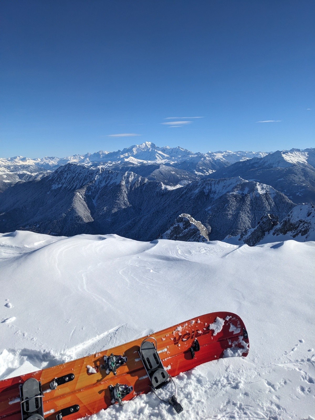 Montée efficace jusqu'à l'épaule de la Sambuy ou on se fait maladroitement griller la première trace de la lingual par un solo 🥹. Entrée dans la lingual un peu sèche et soufflée comme souvent mais bon grip, puis ça déroule dans une belle poudre dense idéale en split. Sortie bien remplie. En bas du près on repeaute pour la petite Chaurionde, il y a du monde sur la trace !