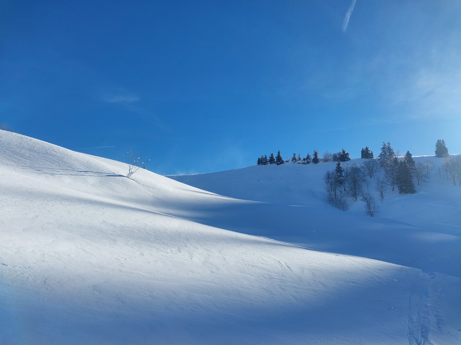Itinéraire suivi : Montée par l'ancienne piste, puis descente Clos Colomb, remontée par la combe sous l'oratoire, descente vers la Fontaine de l'Oursière, remontée au point 1722, descente par la route. Il y avait de bonnes traces dans la forêt pour remonter... Quel plaisir de retrouver la Chartreuse dans de si belles conditions !