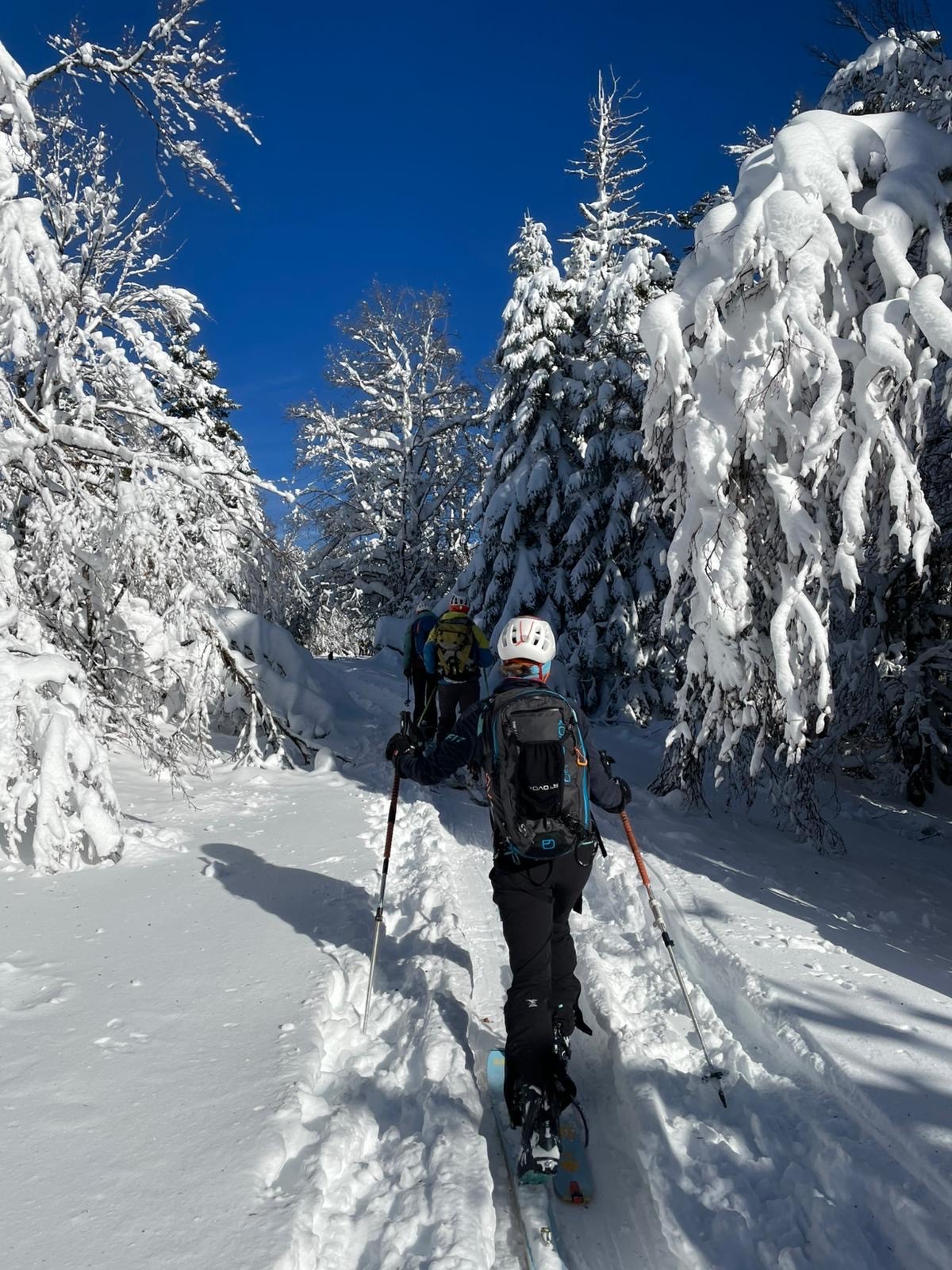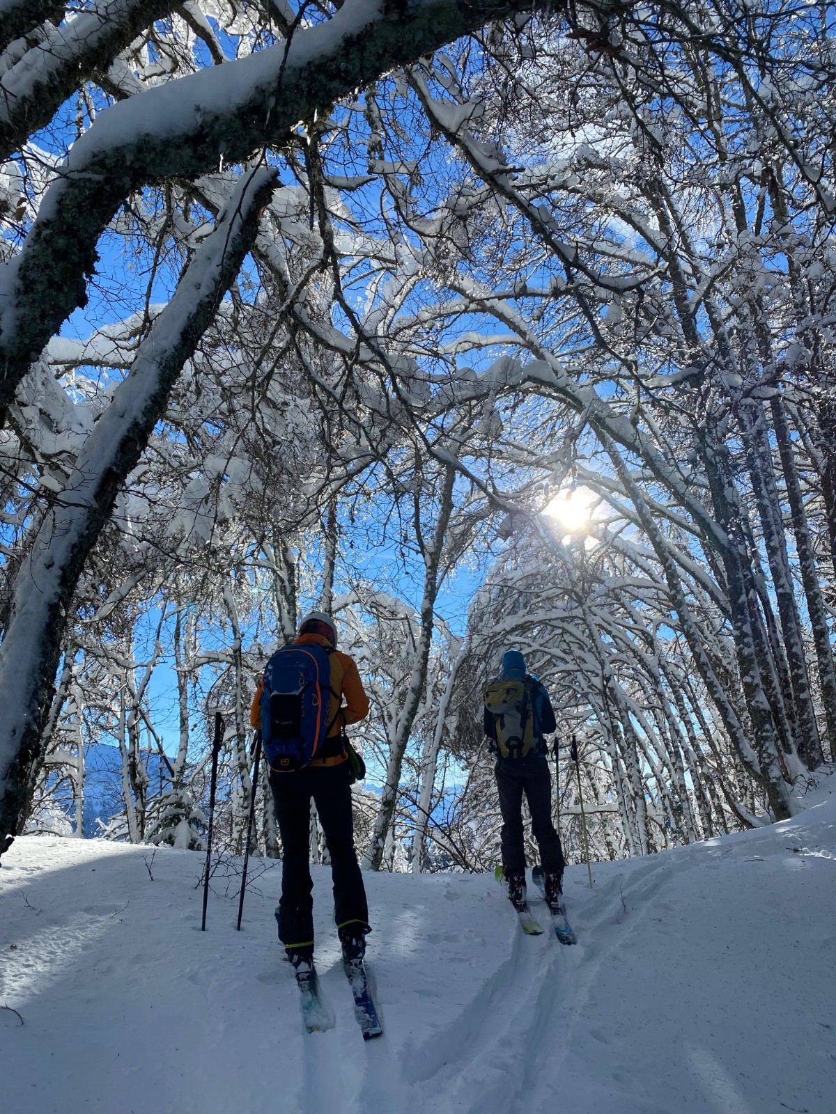 Descente sous ces crêtes dans la forêt très skiante et sans trace