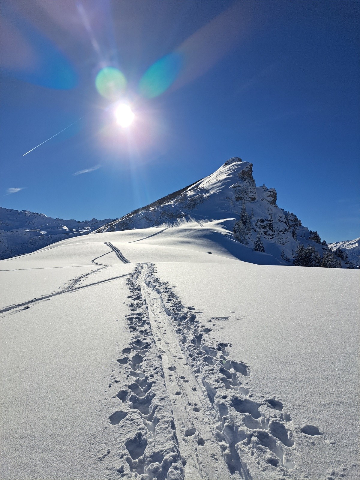 9h15, montée par les Colombières et les Bouchets puis chemin botanique. Descente face Est puis remontée aux Charmettes. Une bonne trace et une poudreuse généralisée. Trouvé un gant sous la Charmette