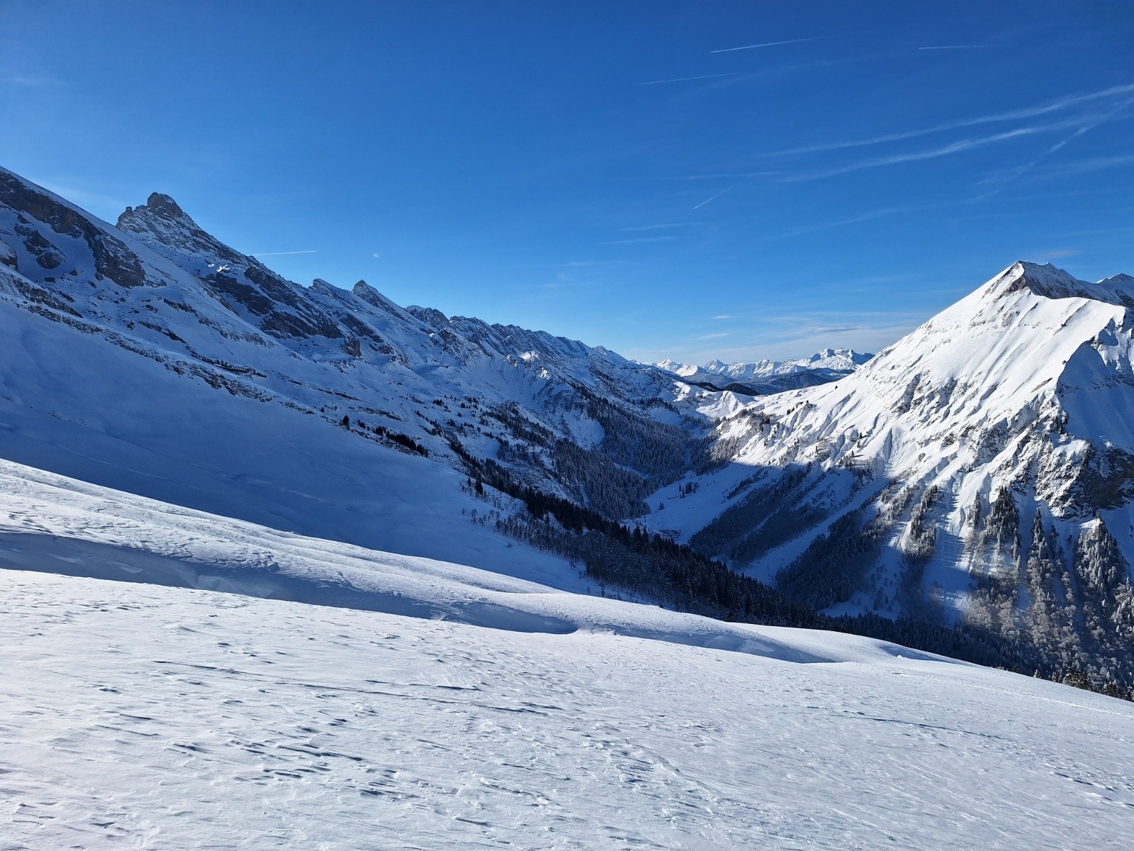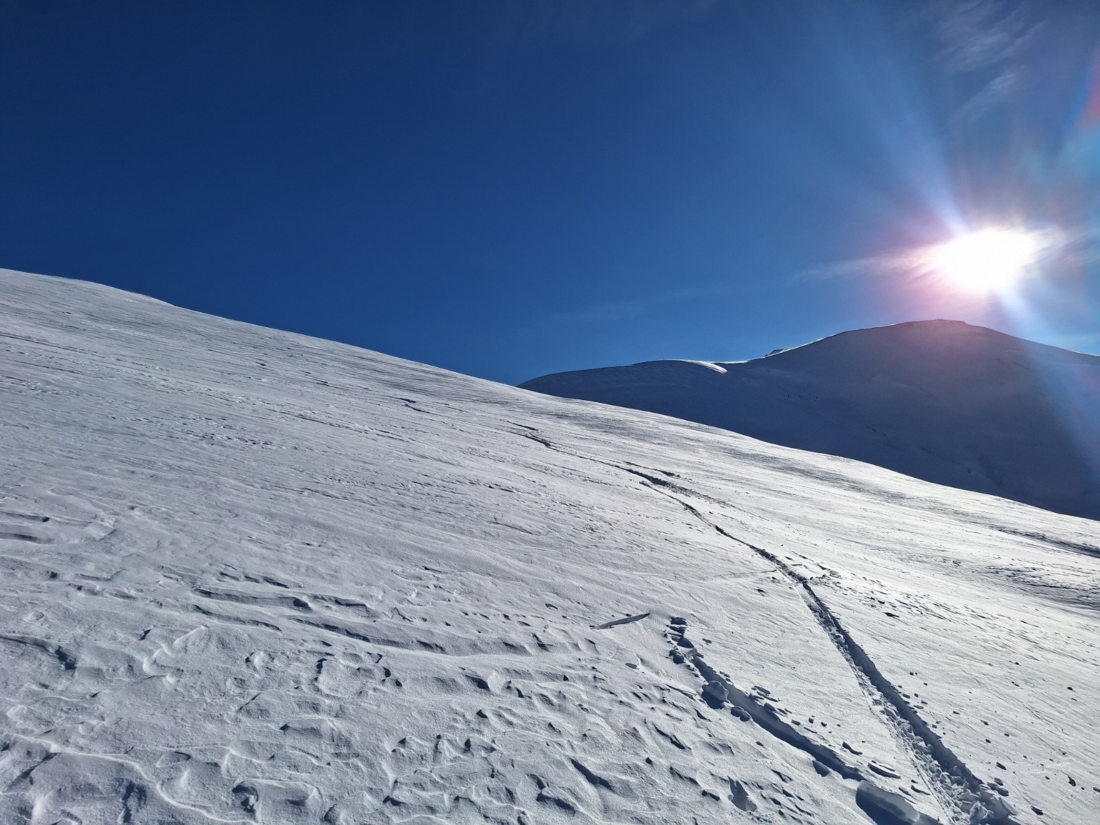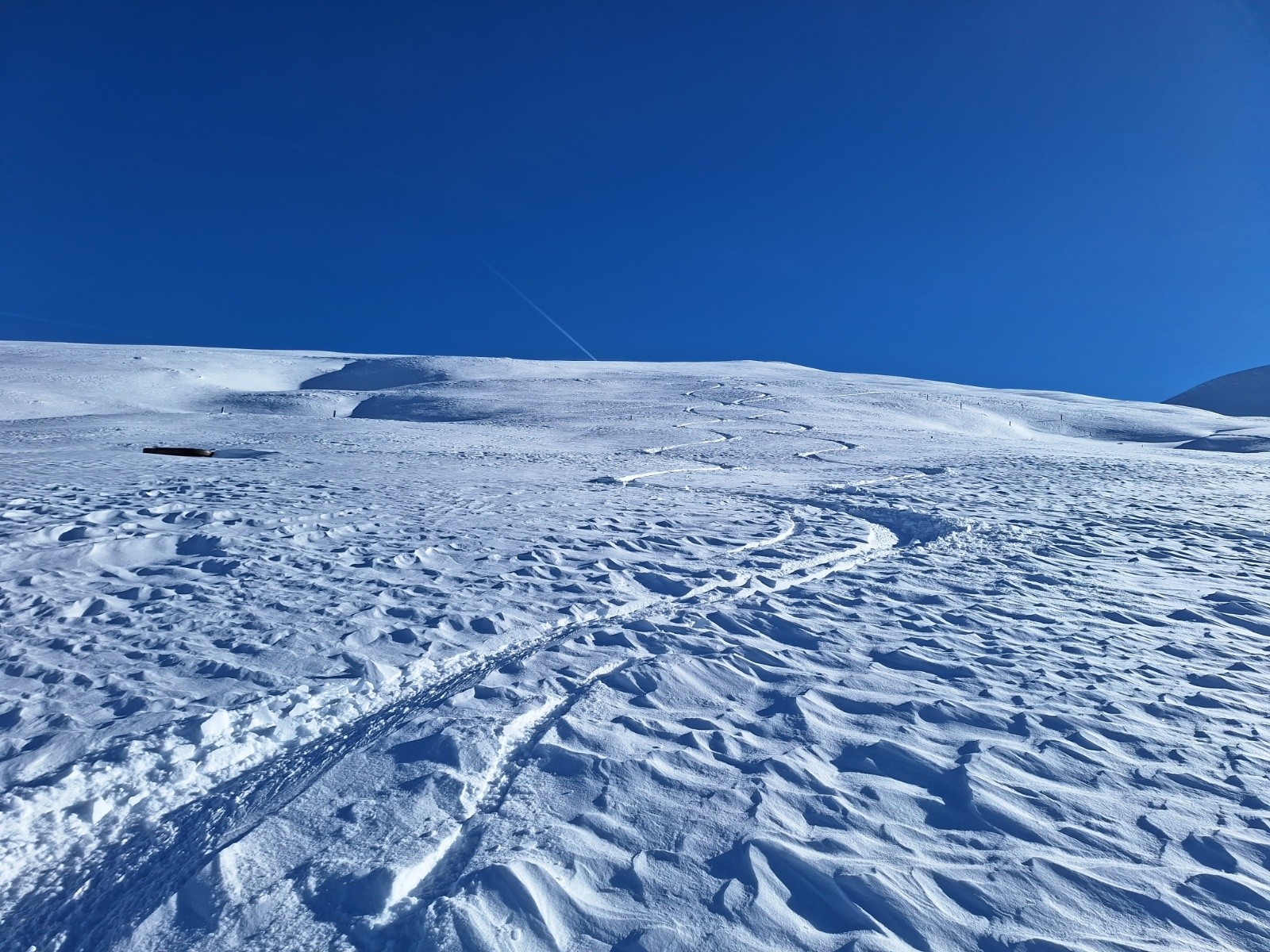 J'attaque donc la descente... argh... c'est moins bon qu'espéré... le vent a bien fait son sale boulot! Jusqu'à 1900m, ça se skie mais faut jouer avec les reliefs 😬 ensuite c'est bien mieux et je peux poser de bons virages!