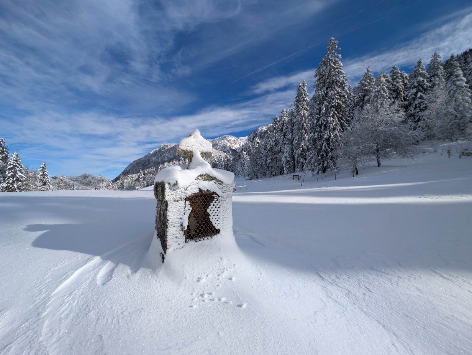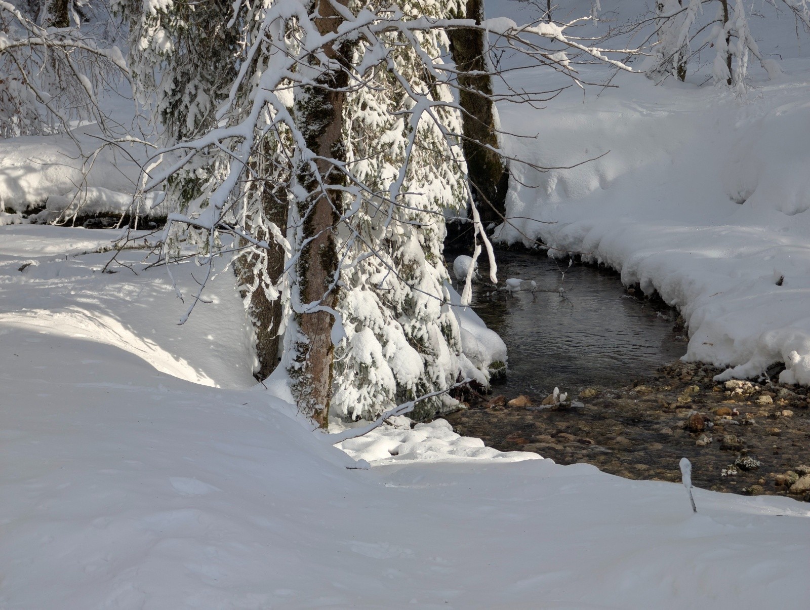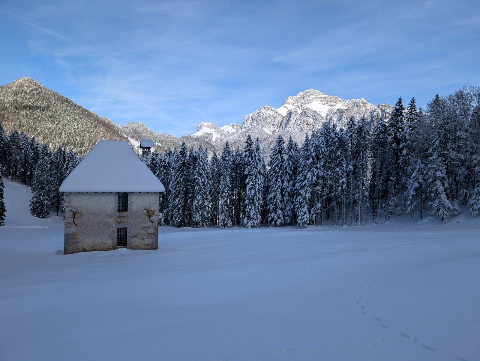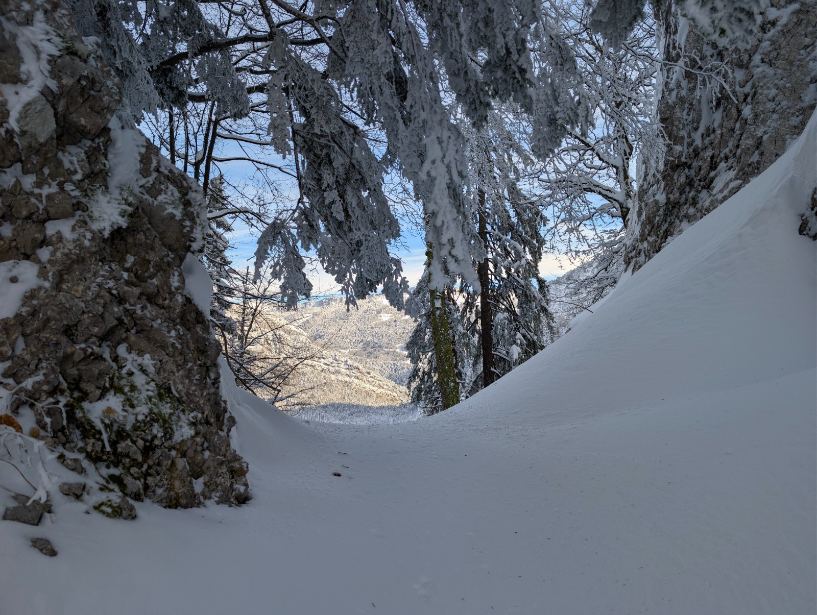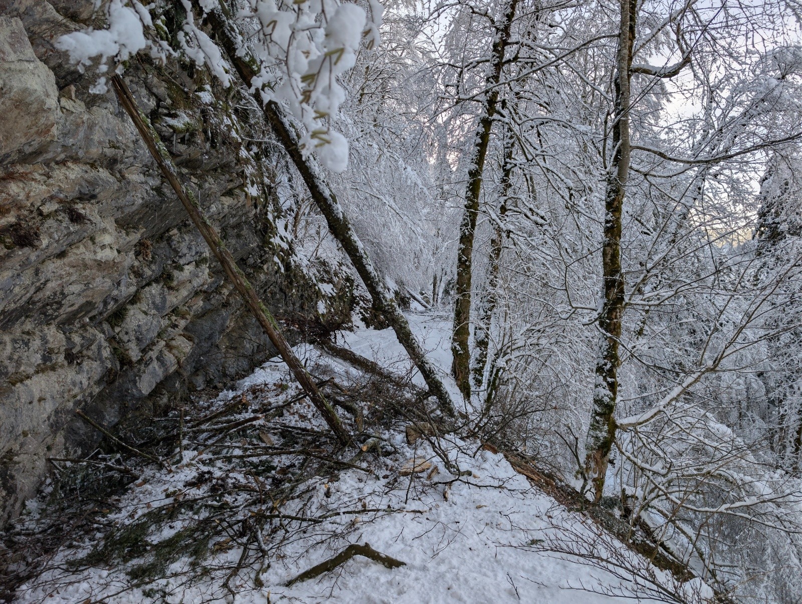 Valombré, aucune trace. Pour un tel paradis de raquettes c'est quand même étonnant. Rassurez-moi, y'a bien quelques retraités qui ne travaillent plus, à fortiori un vendredi aussi charmant ? Le coupable se dévoile un peu plus bas. Le violent coup de Trafalgar de la semaine passée a fauché la forêt déjà bien affaiblie par les scolytes. La route entre Malamille et la porte de l'Enclos est impraticable même à pied, un Beyrouth d'épicéas massacrés. Tronçonneuse obligatoire pour les prochains amoureux du secteur.