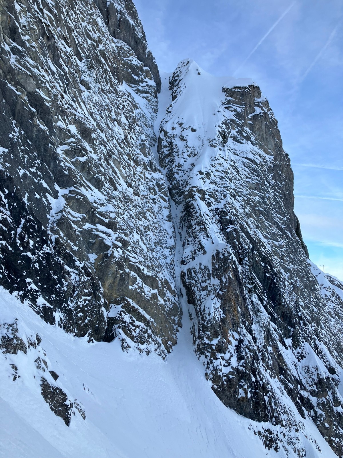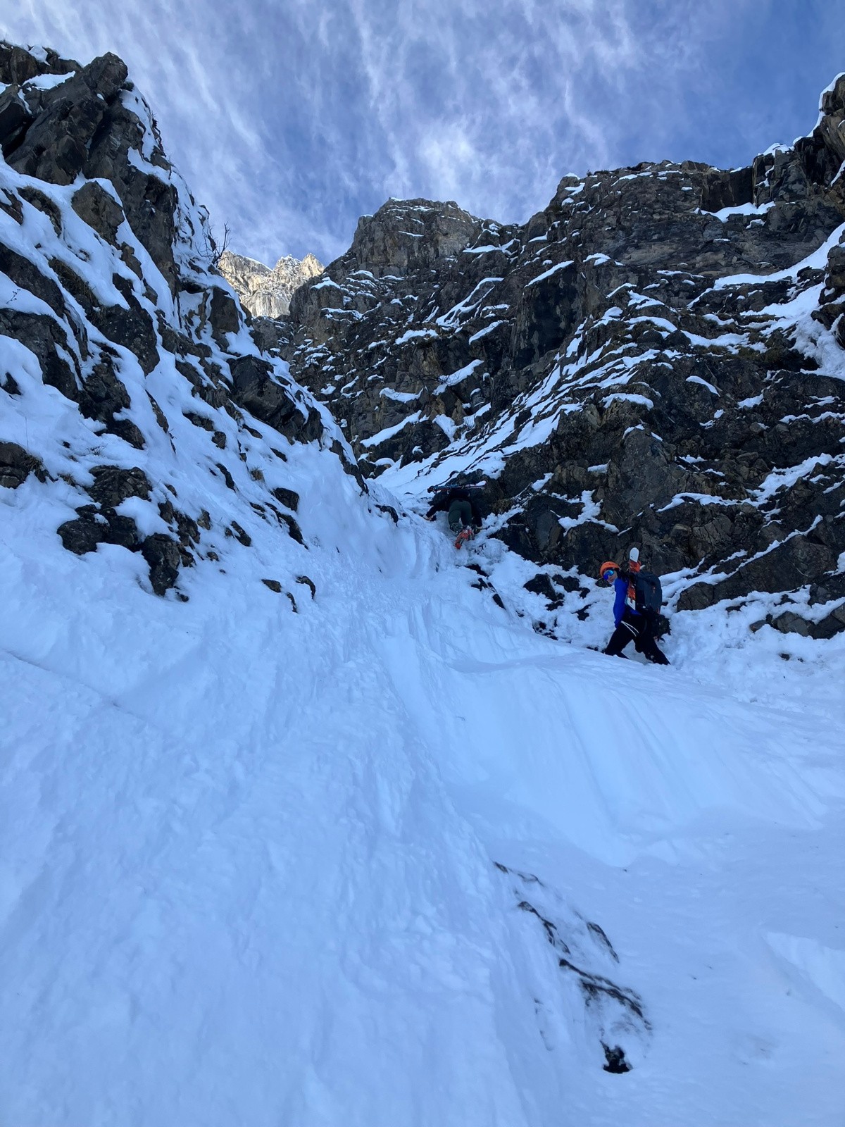 Goulet pas assez rempli encore... Deux ressauts dont un pas facile à négocier. A notre heure, pas mal car ça passait déjà à l'ombre et ça regelait. Mais qq purges, et surtout deux énormes chutes de pierres, dues apparemment au regel !