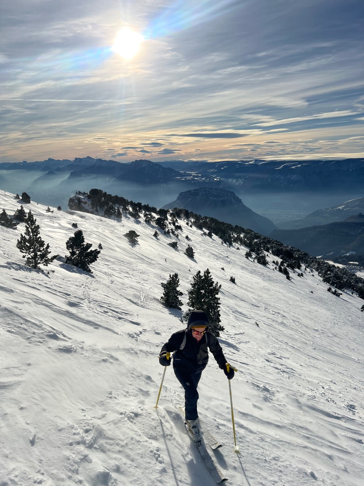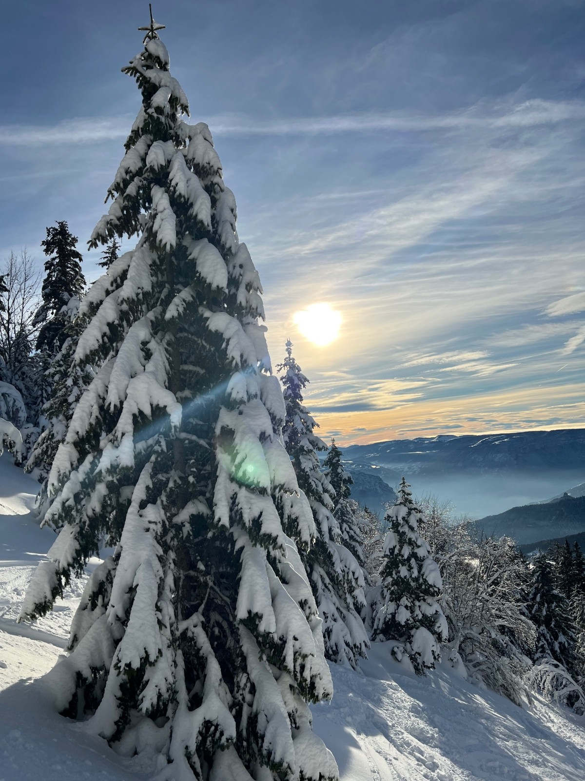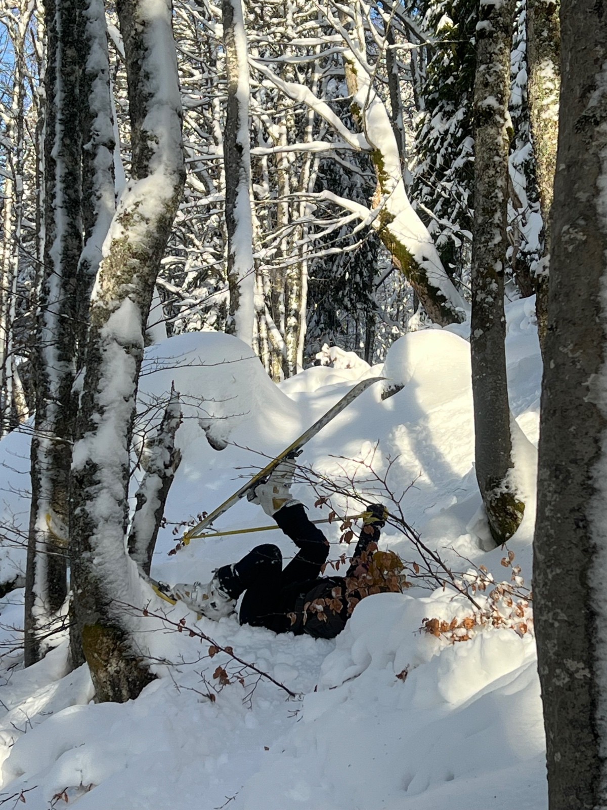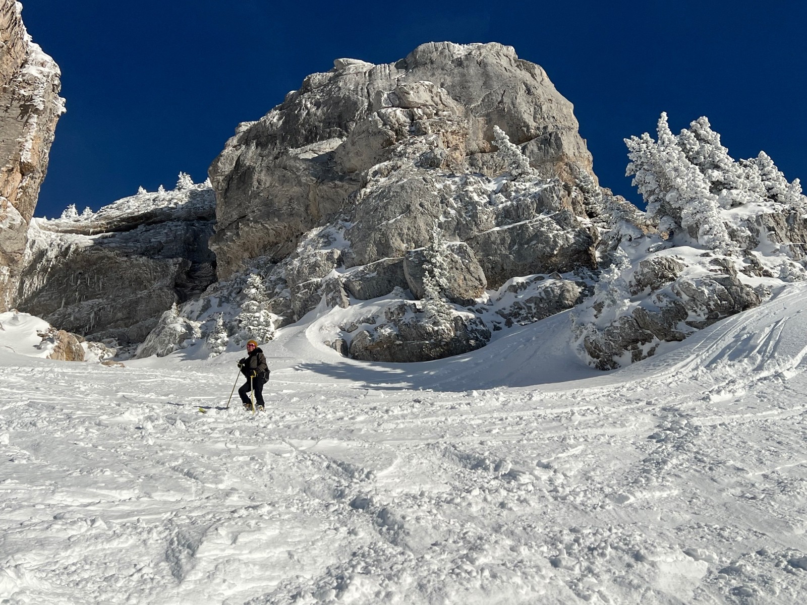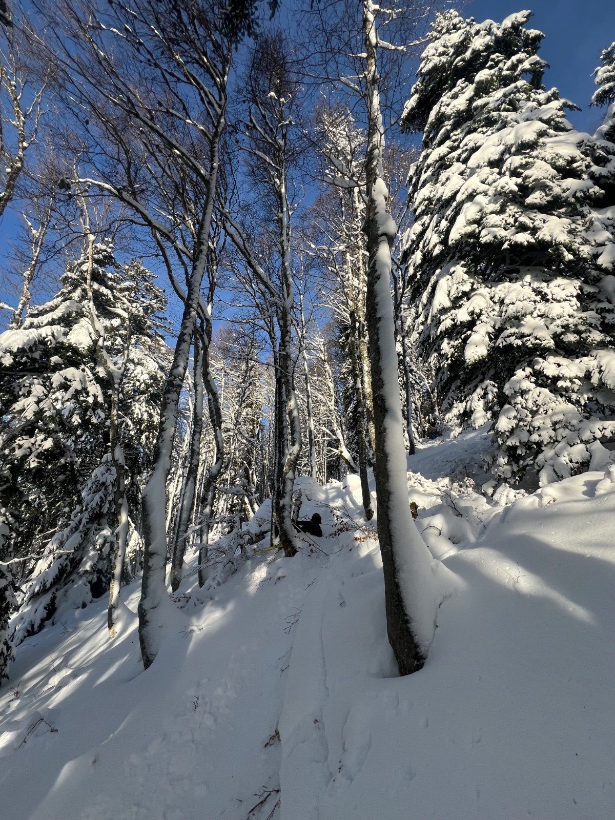 c'est bien tracé mais on trouve l'épaisseur de poudreuse un peu partout (30 cm). Le début est en mode "piste" et la pente finale est en neige durcie par le vent. Tout est bon et surtout la descente dans les combes au droit et main droite des paravalanches ou nous trouvons encore une belle poudreuse. Comme d'hab je me perds un peu dans les bois à la fin, pour le plus grand plaisir des yeux car c'est somptueux avec les arbres chargés de neige. Les rochers sont souvent affleurant et peuvent être traitres car très difficile à deviner. Sans trop abimer les skis quand même. Sur le bas, il y en a plus mais on les devine plus à la faveur du nombres de traces...
