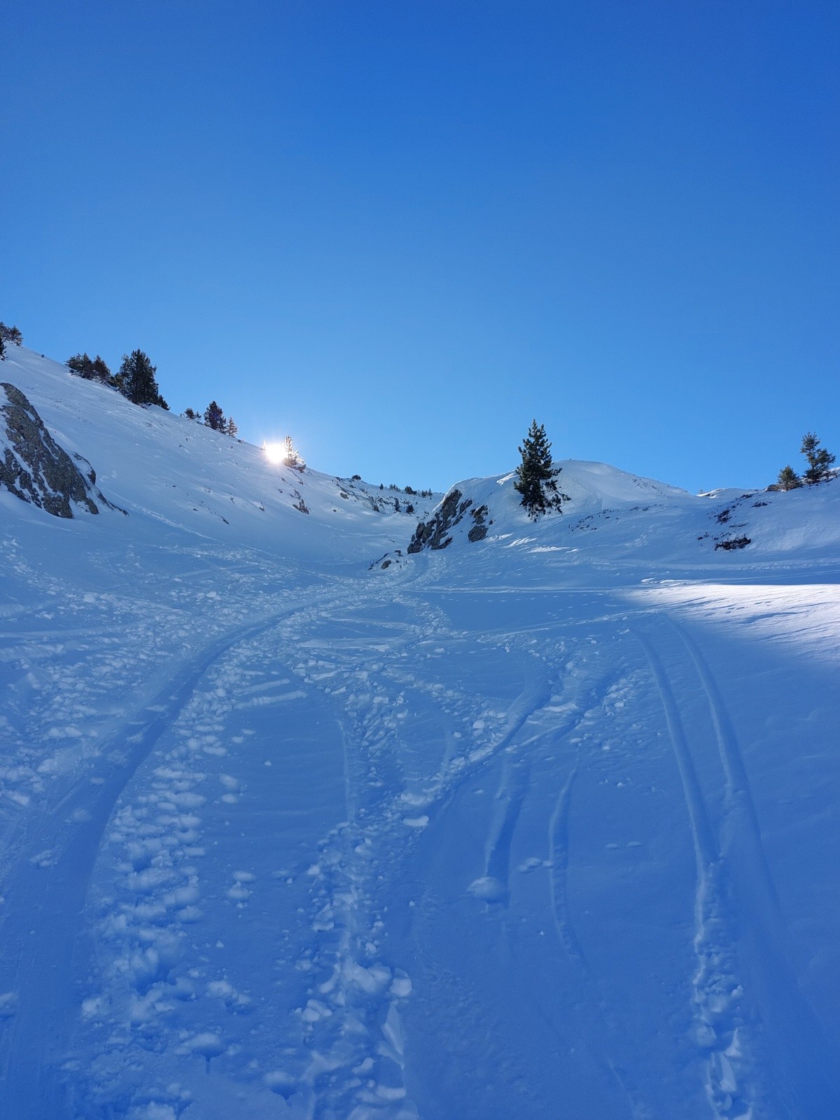 Depautage et direction le sud pour tenter de longer la crête. Mais trop de cailloux sur la partie haute, on est obligé de descendre pour ne pas péter nos skis. Point carto : ça passe par un petit couloir caché, bien rempli, très bon.