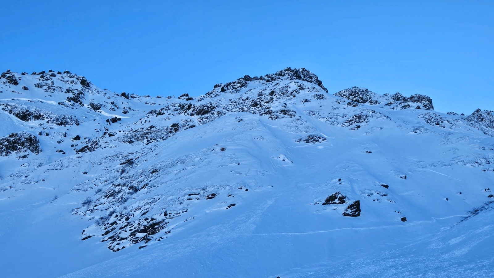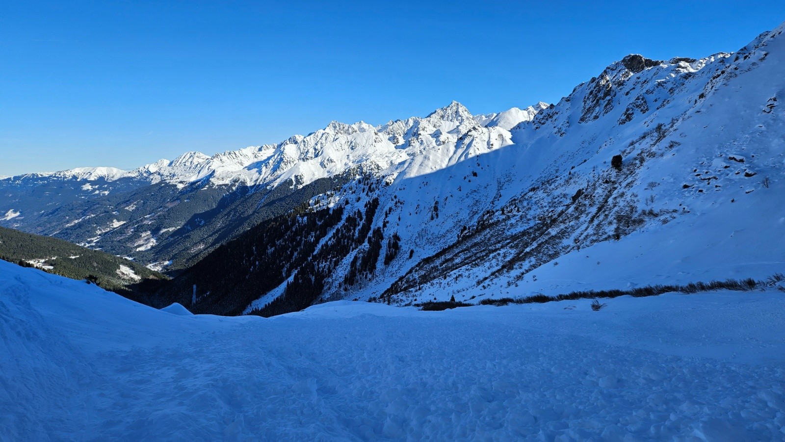 Le haut du vallon est très peu tracé et la descente sous Pouta est excellente. S'ensuit une alternance de Poudreuse sur les bords du Vallon et de multiples traversées de zones de boulettes.