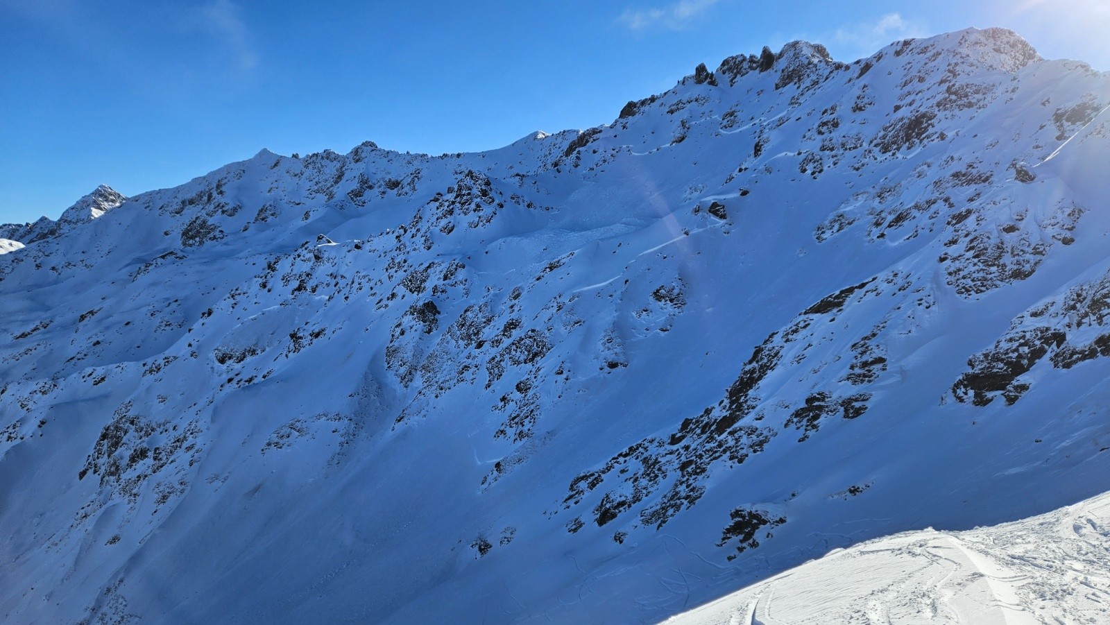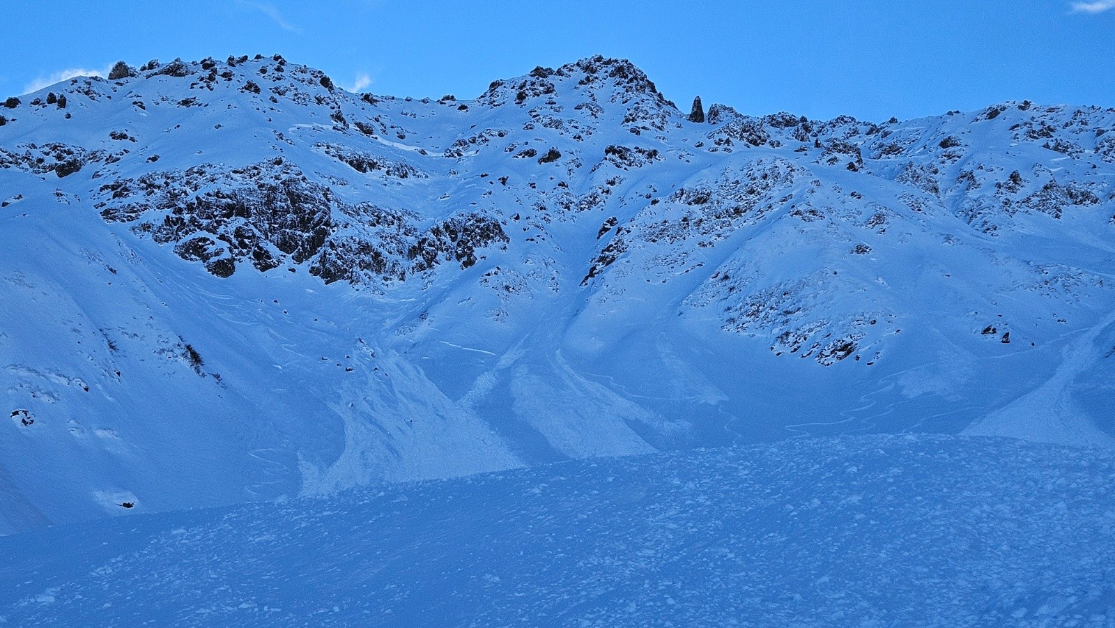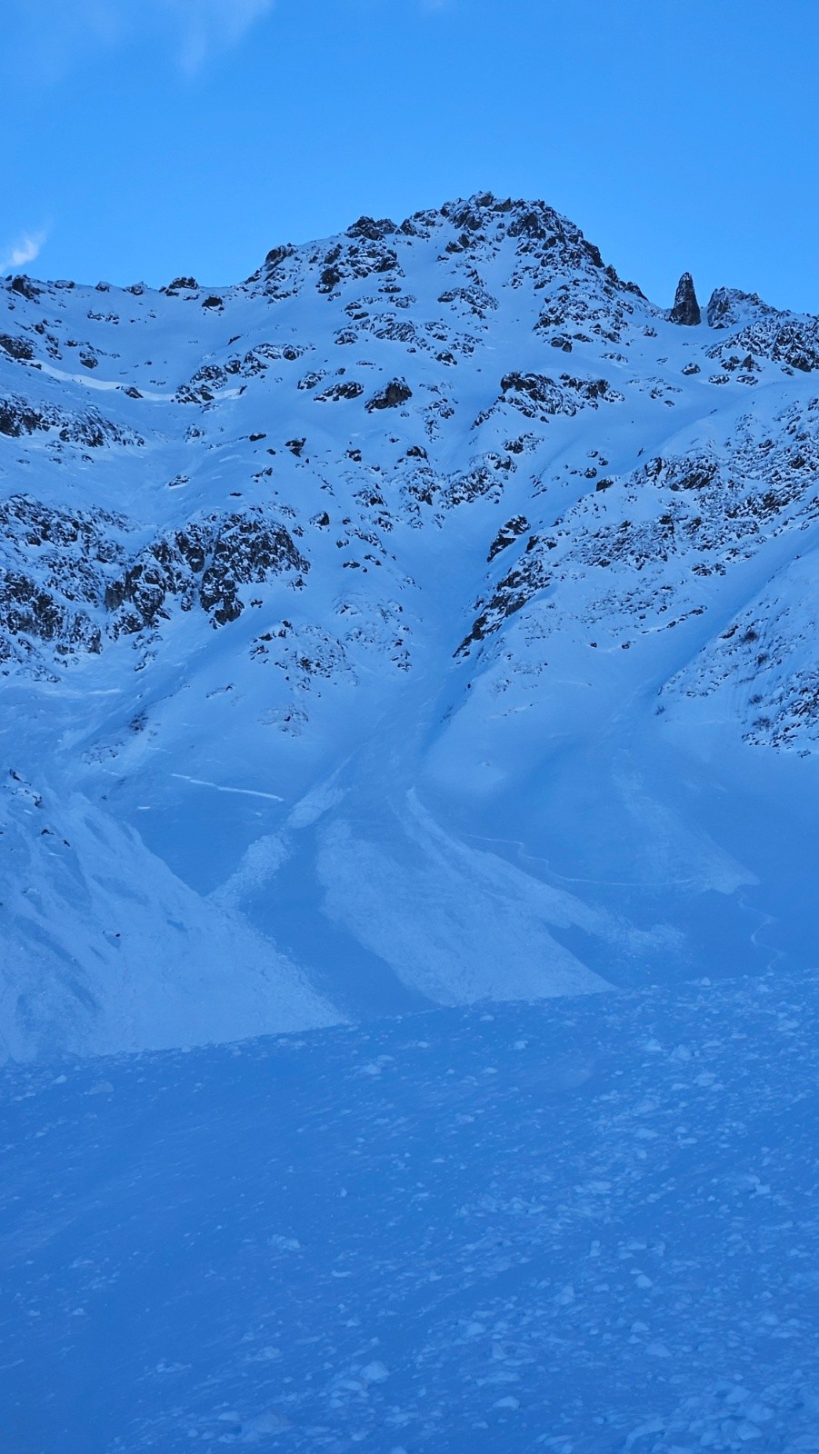 Un rapide coup d'œil dans le vallon et nous constatons que l'ensemble des faces sous la Dent du Pra sont parties, avec des cassures importantes et que 80% du vallon est recouvert de coulées ou décapé....Flippant si naturel mais peut être le résultat de déclenchements par la station?