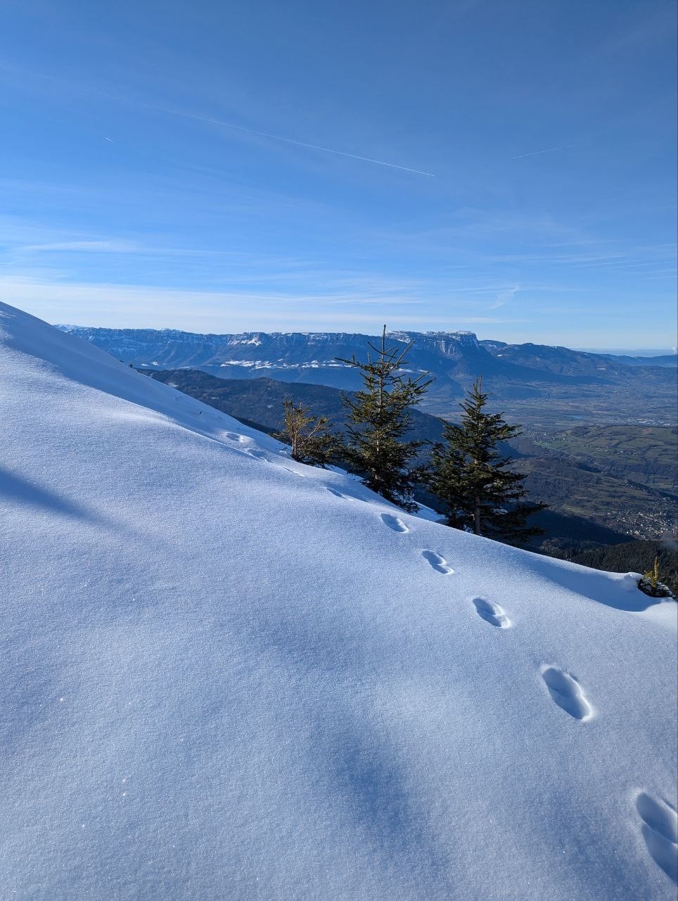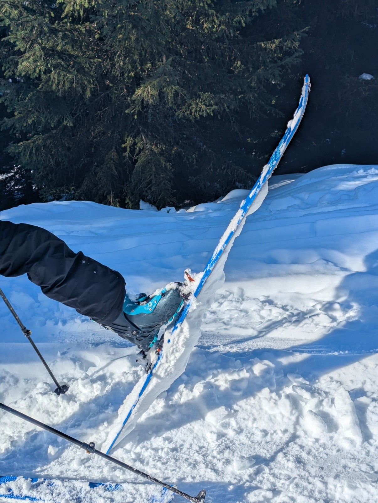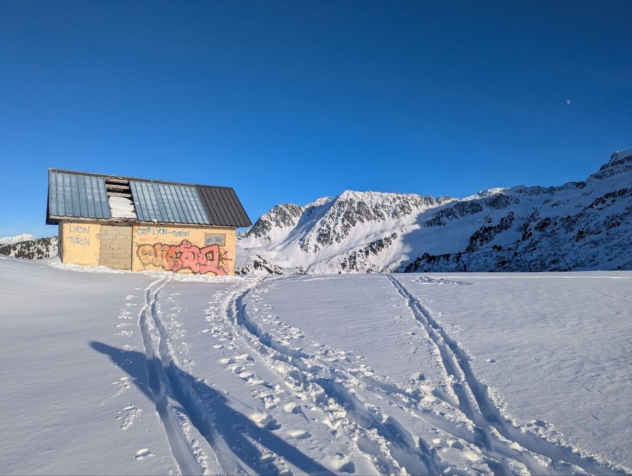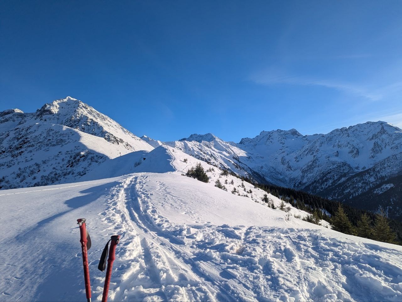 Conditions pour le ski : la neige est lourde et à partir de 1400 elle botte méchamment (très fraîche + le soleil tape et il est tard). On s'épuise à soulever des skis qui pèsent des tonnes. Vers 1700 m, la neige ne botte plus. On s'arrête tout de même plus tôt que prévu au niveau d'une cabane.