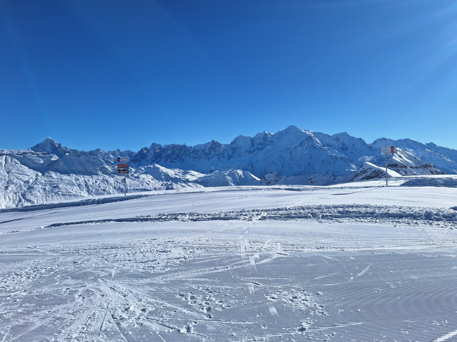 Je monte donc aux Platières par Faust... ça faisait longtemps! 😁 C'est pas la foule mais en même temps, il est déjà midi passé! Au sommet je vais voir ce que ça dit côté Salles... pas hyper convaincu par la neige mais on verra. Finalement, le demi sandwich avalé et l'envie de ski sauvage me motivent et je bascule donc hors de la station. C'est finement croûté voir cartonné mais franchement, ça se skie bien! Ou alors ce sont mes nouveaux skis qui déchirent 😁En tout cas, je voulais du sauvage, j'ai du sauvage! Solitude garantie avec le Mont-Blanc plein cadre! C'est beau! Par contre, je cherche la trace de montée aperçue en haut... apparemment va falloir que je me mette au boulot 😅