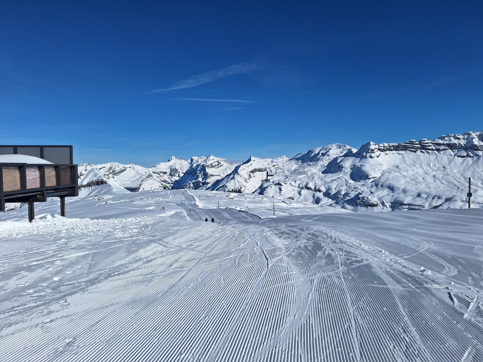Retour au sommet après avoir récupéré la trace qui finalement ne descendait pas bien loin 😅 Je termine mon casse-croûte, discute avec les quelques personnes présentes puis enquille la descente par Faust, alternant les zones damées et les à-côtés en bonne poudre, dès que possible!