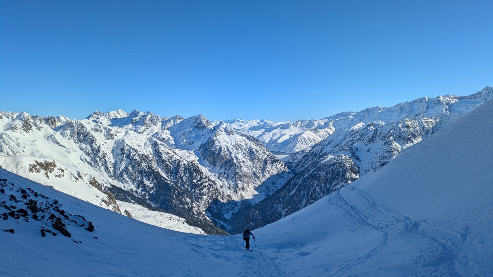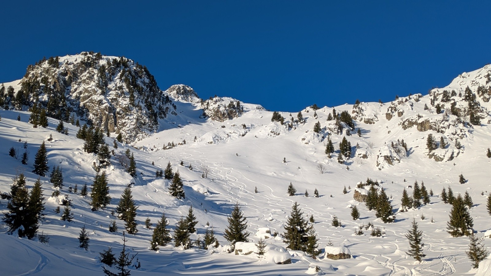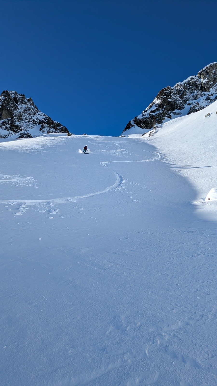 Conditions pour le ski : pas mal! Beaucoup de neige pour la saison (1m a 1700m, 1m50 a 2000m mesurés). Ca chauffe un peu fort au soleil et la conséquence est un gros bottage sur les 2/3 de la montée. A l'ombre la poudre est restée légère, un peu travaillée par le vent en haut