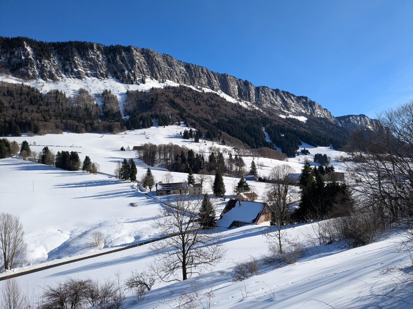 Roche de meaudre, j'ai fait demi-tour arrivé à la lisière de la forêt. Je me suis arrêté à 50 m des barres rocheuse. La neige partait en faisant de grosses boules, il faisait super chaud et j'étais tout seul. J'ai commencé à gamberger. Dans le doute j'ai fait demi-tour