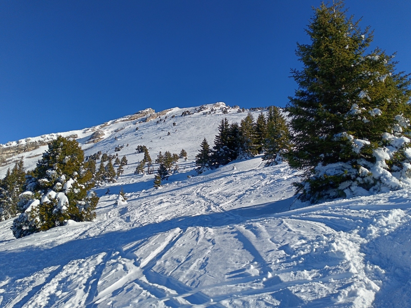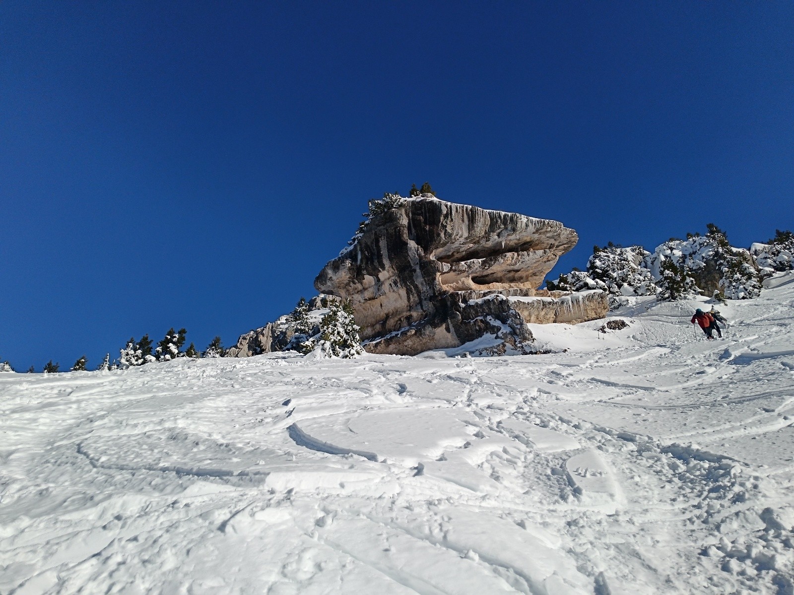 Conditions pour le ski : Bonne condition d'enneigement jusqu'à 50m du sommet ensuite pas mal de cailloux. 50 premiers mètres de descente effectués skis sur le dos afin d'éviter les cailloux ensuite neige légèrement croûtée plus souple à partir du milieu de la descente.