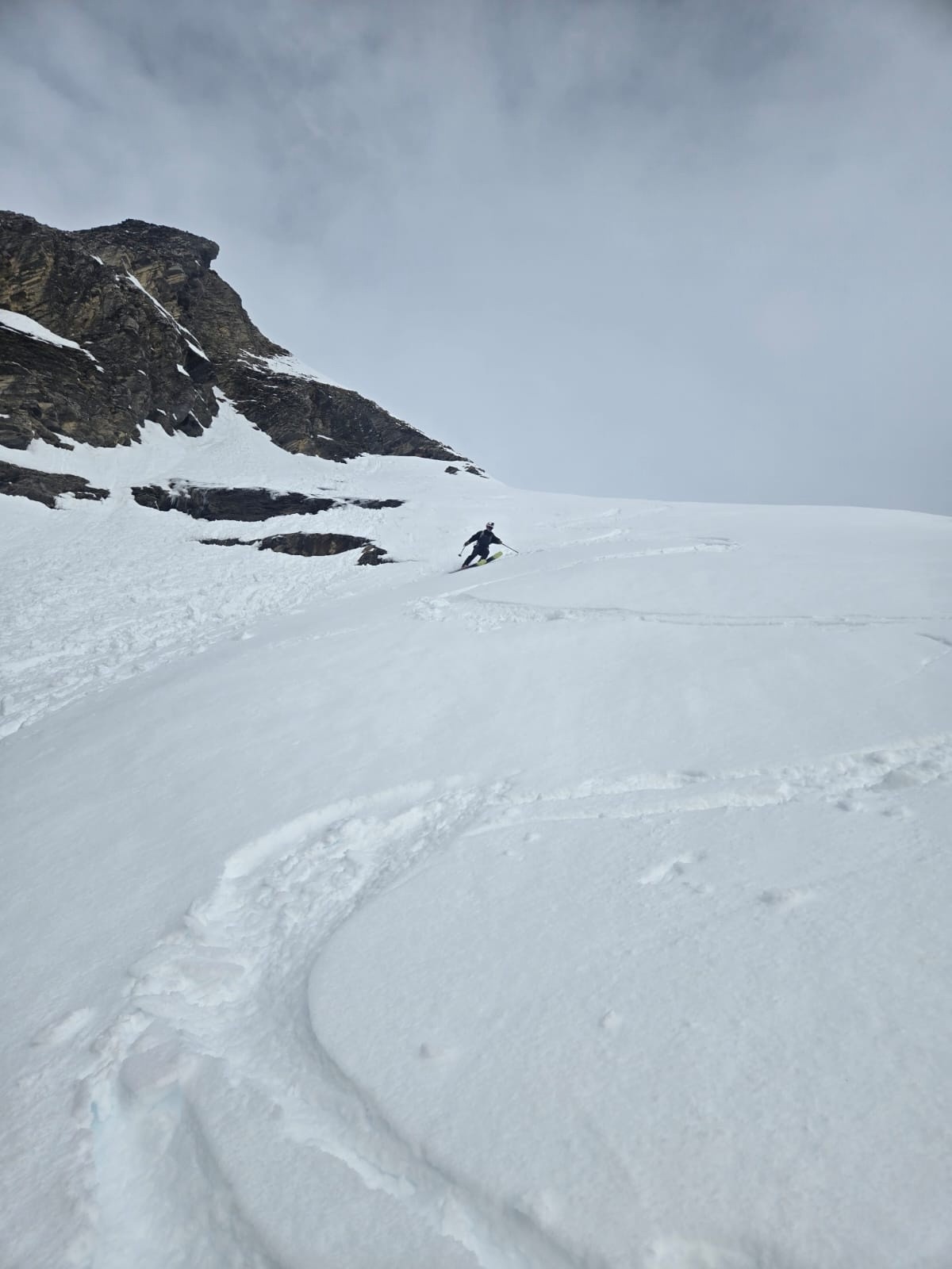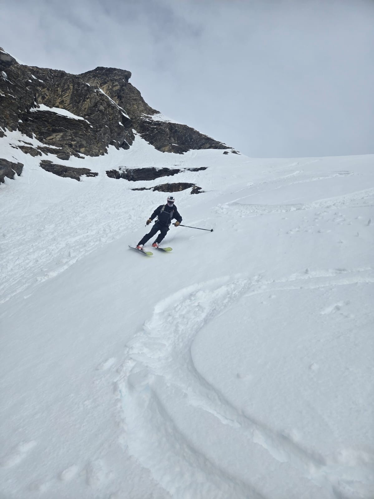 Départ tardif, on verra bien les conditions. Attaque avec les cailloux qui sortent, mais finalement c'est bien rempli, et ça se skie bien, juste physique de tourner dans cette poudre lourde.
